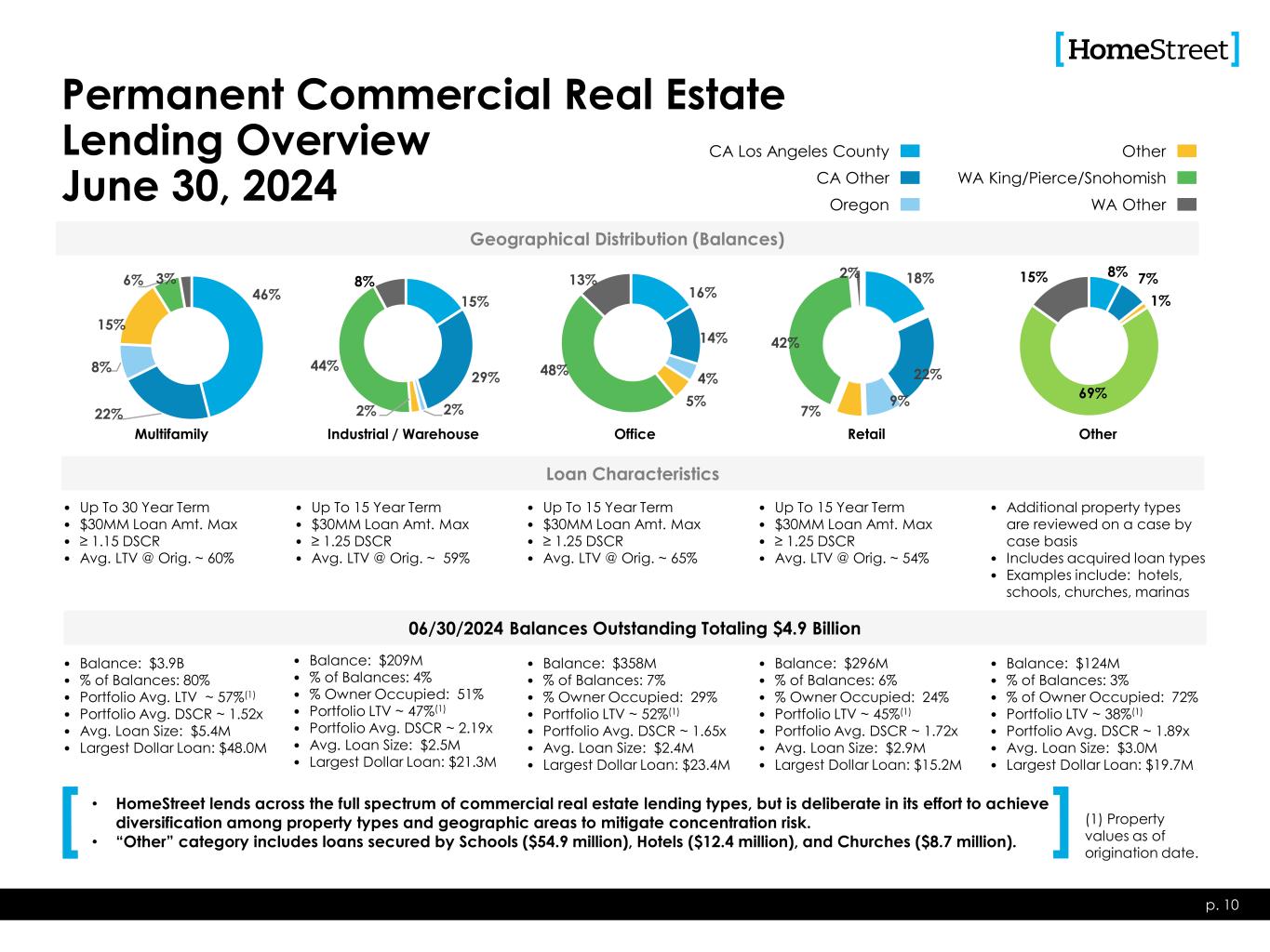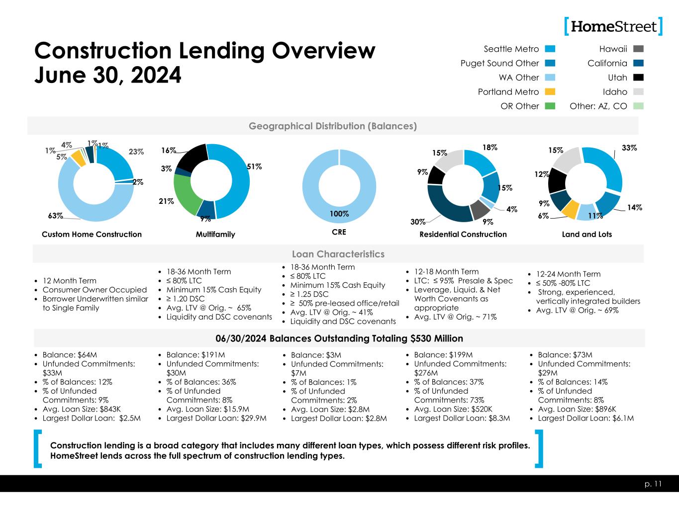 Permanent Commercial Real Estate Lending Overview June 30, 2024 • Up To 30 Year Term • $30MM Loan Amt. Max • ≥ 1.15 DSCR • Avg. LTV @ Orig. ~ 60% p. 10 Loan Characteristics • Up To 15 Year Term • $30MM Loan Amt. Max • ≥ 1.25 DSCR • Avg. LTV @ Orig. ~ 59% • Up To 15 Year Term • $30MM Loan Amt. Max • ≥ 1.25 DSCR • Avg. LTV @ Orig. ~ 65% • Up To 15 Year Term • $30MM Loan Amt. Max • ≥ 1.25 DSCR • Avg. LTV @ Orig. ~ 54% • Additional property types are reviewed on a case by case basis • Includes acquired loan types • Examples include: hotels, schools, churches, marinas • Balance: $3.9B • % of Balances: 80% • Portfolio Avg. LTV ~ 57%(1) • Portfolio Avg. DSCR ~ 1.52x • Avg. Loan Size: $5.4M • Largest Dollar Loan: $48.0M 06/30/2024 Balances Outstanding Totaling $4.9 Billion • Balance: $209M • % of Balances: 4% • % Owner Occupied: 51% • Portfolio LTV ~ 47%(1) • Portfolio Avg. DSCR ~ 2.19x • Avg. Loan Size: $2.5M • Largest Dollar Loan: $21.3M • Balance: $358M • % of Balances: 7% • % Owner Occupied: 29% • Portfolio LTV ~ 52%(1) • Portfolio Avg. DSCR ~ 1.65x • Avg. Loan Size: $2.4M • Largest Dollar Loan: $23.4M • Balance: $296M • % of Balances: 6% • % Owner Occupied: 24% • Portfolio LTV ~ 45%(1) • Portfolio Avg. DSCR ~ 1.72x • Avg. Loan Size: $2.9M • Largest Dollar Loan: $15.2M • Balance: $124M • % of Balances: 3% • % of Owner Occupied: 72% • Portfolio LTV ~ 38%(1) • Portfolio Avg. DSCR ~ 1.89x • Avg. Loan Size: $3.0M • Largest Dollar Loan: $19.7M 46% 22% 8% 15% 6% 3% Geographical Distribution (Balances) Multifamily 15% 29% 2%2% 44% 8% Industrial / Warehouse 16% 14% 4% 5% 48% 13% Office 18% 22% 9% 7% 42% 2% Retail 8% 7% 1% 69% 15% Other CA Los Angeles County CA Other Oregon Other WA King/Pierce/Snohomish WA Other (1) Property values as of origination date. • HomeStreet lends across the full spectrum of commercial real estate lending types, but is deliberate in its effort to achieve diversification among property types and geographic areas to mitigate concentration risk. • “Other” category includes loans secured by Schools ($54.9 million), Hotels ($12.4 million), and Churches ($8.7 million).