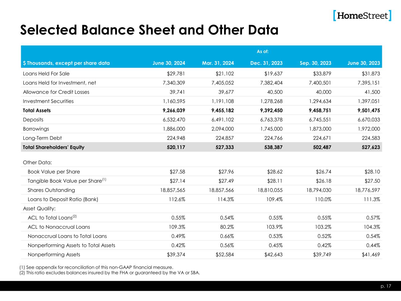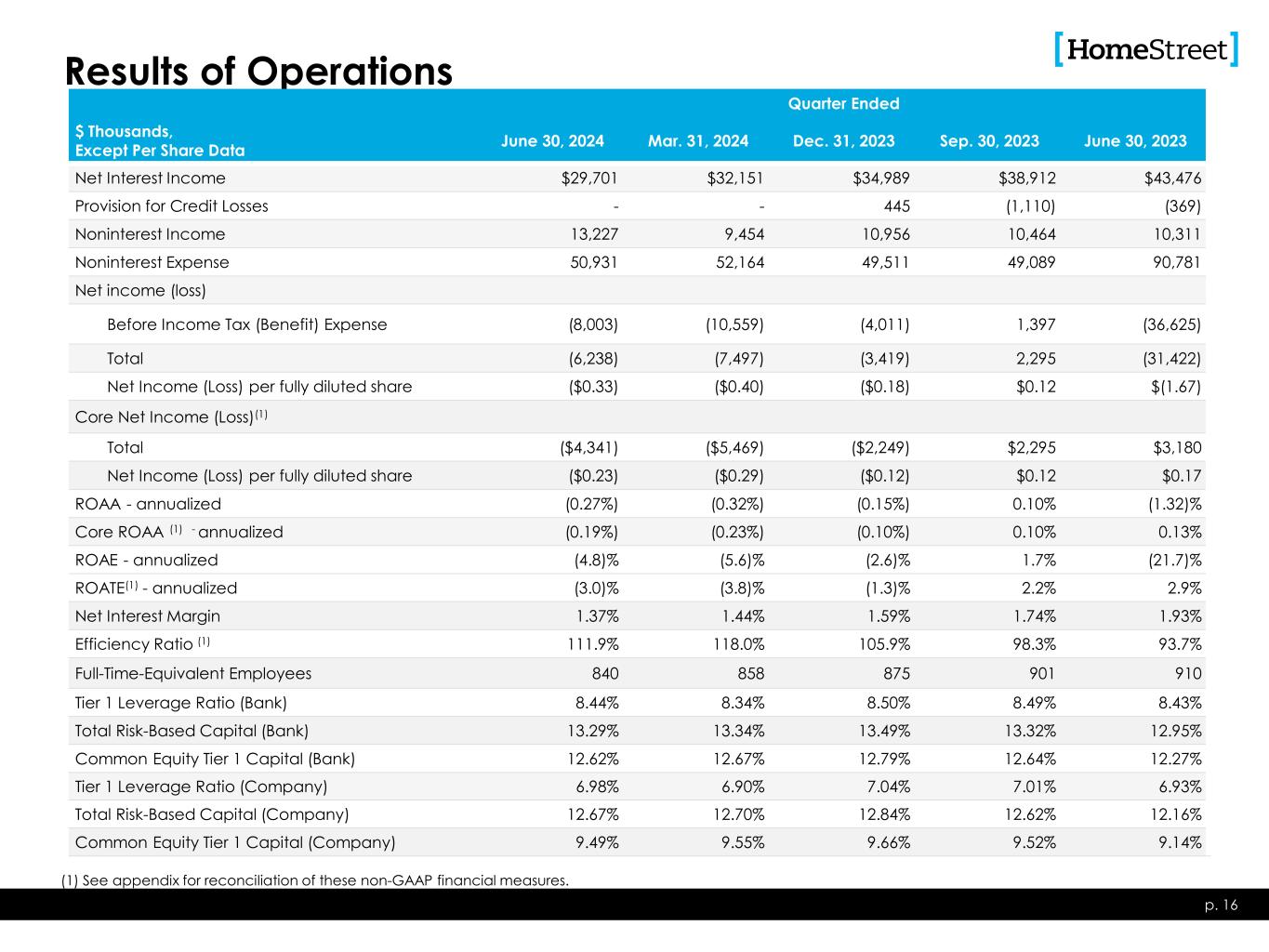 Results of Operations Quarter Ended $ Thousands, Except Per Share Data June 30, 2024 Mar. 31, 2024 Dec. 31, 2023 Sep. 30, 2023 June 30, 2023 Net Interest Income $29,701 $32,151 $34,989 $38,912 $43,476 Provision for Credit Losses - - 445 (1,110) (369) Noninterest Income 13,227 9,454 10,956 10,464 10,311 Noninterest Expense 50,931 52,164 49,511 49,089 90,781 Net income (loss) Before Income Tax (Benefit) Expense (8,003) (10,559) (4,011) 1,397 (36,625) Total (6,238) (7,497) (3,419) 2,295 (31,422) Net Income (Loss) per fully diluted share ($0.33) ($0.40) ($0.18) $0.12 $(1.67) Core Net Income (Loss)(1) Total ($4,341) ($5,469) ($2,249) $2,295 $3,180 Net Income (Loss) per fully diluted share ($0.23) ($0.29) ($0.12) $0.12 $0.17 ROAA - annualized (0.27%) (0.32%) (0.15%) 0.10% (1.32)% Core ROAA (1) - annualized (0.19%) (0.23%) (0.10%) 0.10% 0.13% ROAE - annualized (4.8)% (5.6)% (2.6)% 1.7% (21.7)% ROATE(1) - annualized (3.0)% (3.8)% (1.3)% 2.2% 2.9% Net Interest Margin 1.37% 1.44% 1.59% 1.74% 1.93% Efficiency Ratio (1) 111.9% 118.0% 105.9% 98.3% 93.7% Full-Time-Equivalent Employees 840 858 875 901 910 Tier 1 Leverage Ratio (Bank) 8.44% 8.34% 8.50% 8.49% 8.43% Total Risk-Based Capital (Bank) 13.29% 13.34% 13.49% 13.32% 12.95% Common Equity Tier 1 Capital (Bank) 12.62% 12.67% 12.79% 12.64% 12.27% Tier 1 Leverage Ratio (Company) 6.98% 6.90% 7.04% 7.01% 6.93% Total Risk-Based Capital (Company) 12.67% 12.70% 12.84% 12.62% 12.16% Common Equity Tier 1 Capital (Company) 9.49% 9.55% 9.66% 9.52% 9.14% p. 16 (1) See appendix for reconciliation of these non-GAAP financial measures.