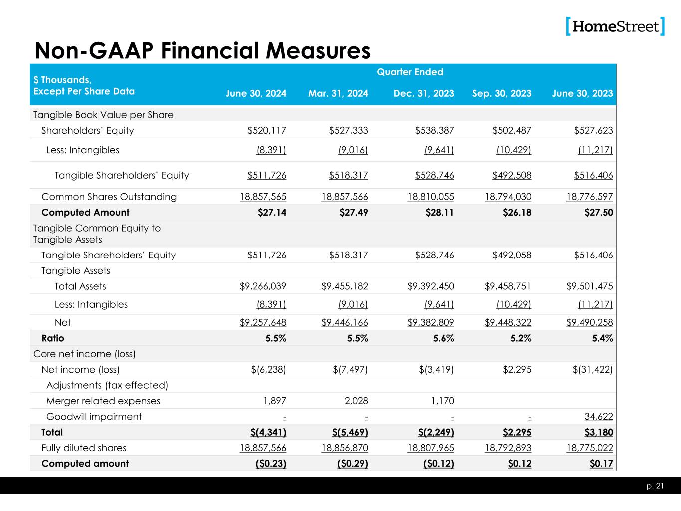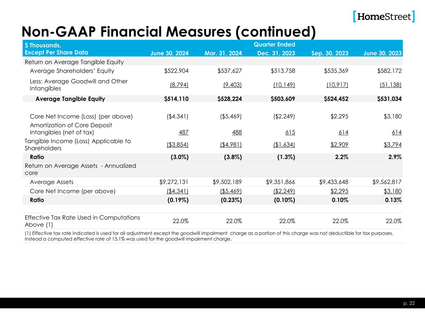 Non-GAAP Financial Measures $ Thousands, Except Per Share Data Quarter Ended June 30, 2024 Mar. 31, 2024 Dec. 31, 2023 Sep. 30, 2023 June 30, 2023 Tangible Book Value per Share Shareholders’ Equity $520,117 $527,333 $538,387 $502,487 $527,623 Less: Intangibles (8,391) (9,016) (9,641) (10,429) (11,217) Tangible Shareholders’ Equity $511,726 $518,317 $528,746 $492,508 $516,406 Common Shares Outstanding 18,857,565 18,857,566 18,810,055 18,794,030 18,776,597 Computed Amount $27.14 $27.49 $28.11 $26.18 $27.50 Tangible Common Equity to Tangible Assets Tangible Shareholders’ Equity $511,726 $518,317 $528,746 $492,058 $516,406 Tangible Assets Total Assets $9,266,039 $9,455,182 $9,392,450 $9,458,751 $9,501,475 Less: Intangibles (8,391) (9,016) (9,641) (10,429) (11,217) Net $9,257,648 $9,446,166 $9,382,809 $9,448,322 $9,490,258 Ratio 5.5% 5.5% 5.6% 5.2% 5.4% Core net income (loss) Net income (loss) $(6,238) $(7,497) $(3,419) $2,295 $(31,422) Adjustments (tax effected) Merger related expenses 1,897 2,028 1,170 Goodwill impairment - - - - 34,622 Total $(4,341) $(5,469) $(2,249) $2,295 $3,180 Fully diluted shares 18,857,566 18,856,870 18,807,965 18,792,893 18,775,022 Computed amount ($0.23) ($0.29) ($0.12) $0.12 $0.17 p. 21