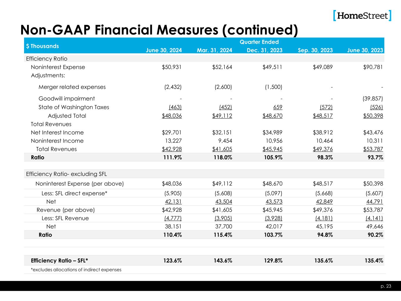 Non-GAAP Financial Measures (continued) $ Thousands Quarter Ended June 30, 2024 Mar. 31, 2024 Dec. 31, 2023 Sep. 30, 2023 June 30, 2023 Efficiency Ratio Noninterest Expense $50,931 $52,164 $49,511 $49,089 $90,781 Adjustments: Merger related expenses (2,432) (2,600) (1,500) - - Goodwill impairment - - - - (39,857) State of Washington Taxes (463) (452) 659 (572) (526) Adjusted Total $48,036 $49,112 $48,670 $48,517 $50,398 Total Revenues Net Interest Income $29,701 $32,151 $34,989 $38,912 $43,476 Noninterest Income 13,227 9,454 10,956 10,464 10,311 Total Revenues $42,928 $41,605 $45,945 $49,376 $53,787 Ratio 111.9% 118.0% 105.9% 98.3% 93.7% Efficiency Ratio- excluding SFL Noninterest Expense (per above) $48,036 $49,112 $48,670 $48,517 $50,398 Less: SFL direct expense* (5,905) (5,608) (5,097) (5,668) (5,607) Net 42,131 43,504 43,573 42,849 44,791 Revenue (per above) $42,928 $41,605 $45,945 $49,376 $53,787 Less: SFL Revenue (4,777) (3,905) (3,928) (4,181) (4,141) Net 38,151 37,700 42,017 45,195 49,646 Ratio 110.4% 115.4% 103.7% 94.8% 90.2% Efficiency Ratio – SFL* 123.6% 143.6% 129.8% 135.6% 135.4% *excludes allocations of indirect expenses p. 23