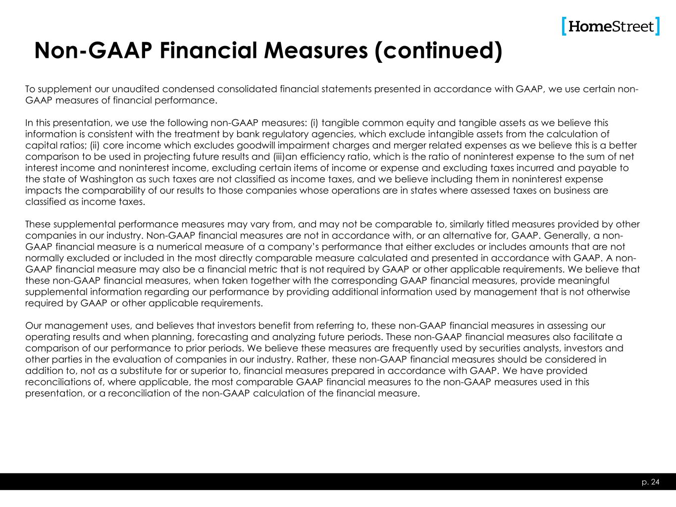 Non-GAAP Financial Measures (continued) p. 24 To supplement our unaudited condensed consolidated financial statements presented in accordance with GAAP, we use certain non- GAAP measures of financial performance. In this presentation, we use the following non-GAAP measures: (i) tangible common equity and tangible assets as we believe this information is consistent with the treatment by bank regulatory agencies, which exclude intangible assets from the calculation of capital ratios; (ii) core income which excludes goodwill impairment charges and merger related expenses as we believe this is a better comparison to be used in projecting future results and (iii)an efficiency ratio, which is the ratio of noninterest expense to the sum of net interest income and noninterest income, excluding certain items of income or expense and excluding taxes incurred and payable to the state of Washington as such taxes are not classified as income taxes, and we believe including them in noninterest expense impacts the comparability of our results to those companies whose operations are in states where assessed taxes on business are classified as income taxes. These supplemental performance measures may vary from, and may not be comparable to, similarly titled measures provided by other companies in our industry. Non-GAAP financial measures are not in accordance with, or an alternative for, GAAP. Generally, a non- GAAP financial measure is a numerical measure of a company’s performance that either excludes or includes amounts that are not normally excluded or included in the most directly comparable measure calculated and presented in accordance with GAAP. A non- GAAP financial measure may also be a financial metric that is not required by GAAP or other applicable requirements. We believe that these non-GAAP financial measures, when taken together with the corresponding GAAP financial measures, provide meaningful supplemental information regarding our performance by providing additional information used by management that is not otherwise required by GAAP or other applicable requirements. Our management uses, and believes that investors benefit from referring to, these non-GAAP financial measures in assessing our operating results and when planning, forecasting and analyzing future periods. These non-GAAP financial measures also facilitate a comparison of our performance to prior periods. We believe these measures are frequently used by securities analysts, investors and other parties in the evaluation of companies in our industry. Rather, these non-GAAP financial measures should be considered in addition to, not as a substitute for or superior to, financial measures prepared in accordance with GAAP. We have provided reconciliations of, where applicable, the most comparable GAAP financial measures to the non-GAAP measures used in this presentation, or a reconciliation of the non-GAAP calculation of the financial measure.