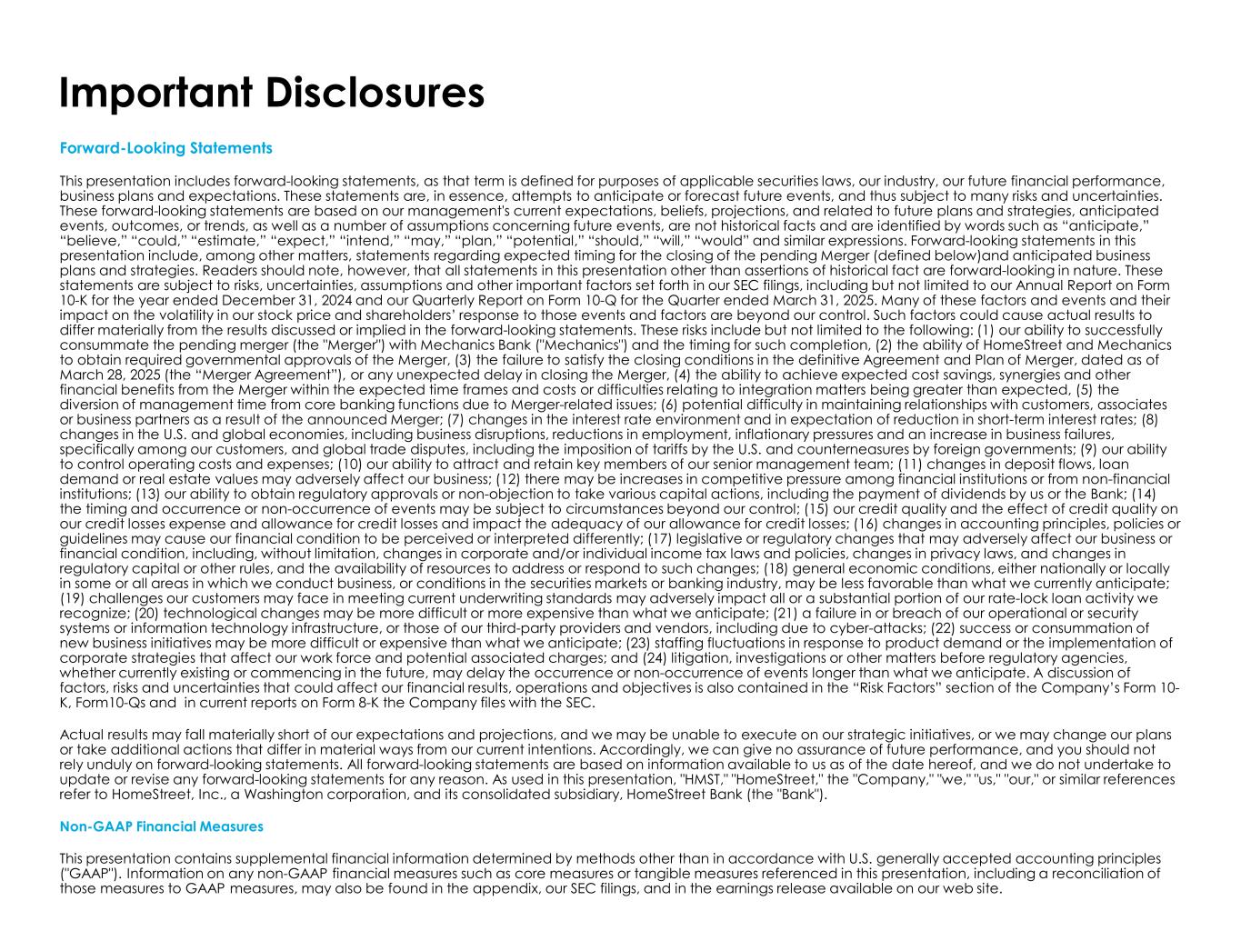Important Disclosures Forward-Looking Statements This presentation includes forward-looking statements, as that term is defined for purposes of applicable securities laws, our industry, our future financial performance, business plans and expectations. These statements are, in essence, attempts to anticipate or forecast future events, and thus subject to many risks and uncertainties. These forward-looking statements are based on our management's current expectations, beliefs, projections, and related to future plans and strategies, anticipated events, outcomes, or trends, as well as a number of assumptions concerning future events, are not historical facts and are identified by words such as “anticipate,” “believe,” “could,” “estimate,” “expect,” “intend,” “may,” “plan,” “potential,” “should,” “will,” “would” and similar expressions. Forward-looking statements in this presentation include, among other matters, statements regarding expected timing for the closing of the pending Merger (defined below)and anticipated business plans and strategies. Readers should note, however, that all statements in this presentation other than assertions of historical fact are forward-looking in nature. These statements are subject to risks, uncertainties, assumptions and other important factors set forth in our SEC filings, including but not limited to our Annual Report on Form 10-K for the year ended December 31, 2024 and our Quarterly Report on Form 10-Q for the Quarter ended March 31, 2025. Many of these factors and events and their impact on the volatility in our stock price and shareholders’ response to those events and factors are beyond our control. Such factors could cause actual results to differ materially from the results discussed or implied in the forward-looking statements. These risks include but not limited to the following: (1) our ability to successfully consummate the pending merger (the "Merger") with Mechanics Bank ("Mechanics") and the timing for such completion, (2) the ability of HomeStreet and Mechanics to obtain required governmental approvals of the Merger, (3) the failure to satisfy the closing conditions in the definitive Agreement and Plan of Merger, dated as of March 28, 2025 (the “Merger Agreement”), or any unexpected delay in closing the Merger, (4) the ability to achieve expected cost savings, synergies and other financial benefits from the Merger within the expected time frames and costs or difficulties relating to integration matters being greater than expected, (5) the diversion of management time from core banking functions due to Merger-related issues; (6) potential difficulty in maintaining relationships with customers, associates or business partners as a result of the announced Merger; (7) changes in the interest rate environment and in expectation of reduction in short-term interest rates; (8) changes in the U.S. and global economies, including business disruptions, reductions in employment, inflationary pressures and an increase in business failures, specifically among our customers, and global trade disputes, including the imposition of tariffs by the U.S. and counterneasures by foreign governments; (9) our ability to control operating costs and expenses; (10) our ability to attract and retain key members of our senior management team; (11) changes in deposit flows, loan demand or real estate values may adversely affect our business; (12) there may be increases in competitive pressure among financial institutions or from non-financial institutions; (13) our ability to obtain regulatory approvals or non-objection to take various capital actions, including the payment of dividends by us or the Bank; (14) the timing and occurrence or non-occurrence of events may be subject to circumstances beyond our control; (15) our credit quality and the effect of credit quality on our credit losses expense and allowance for credit losses and impact the adequacy of our allowance for credit losses; (16) changes in accounting principles, policies or guidelines may cause our financial condition to be perceived or interpreted differently; (17) legislative or regulatory changes that may adversely affect our business or financial condition, including, without limitation, changes in corporate and/or individual income tax laws and policies, changes in privacy laws, and changes in regulatory capital or other rules, and the availability of resources to address or respond to such changes; (18) general economic conditions, either nationally or locally in some or all areas in which we conduct business, or conditions in the securities markets or banking industry, may be less favorable than what we currently anticipate; (19) challenges our customers may face in meeting current underwriting standards may adversely impact all or a substantial portion of our rate-lock loan activity we recognize; (20) technological changes may be more difficult or more expensive than what we anticipate; (21) a failure in or breach of our operational or security systems or information technology infrastructure, or those of our third-party providers and vendors, including due to cyber-attacks; (22) success or consummation of new business initiatives may be more difficult or expensive than what we anticipate; (23) staffing fluctuations in response to product demand or the implementation of corporate strategies that affect our work force and potential associated charges; and (24) litigation, investigations or other matters before regulatory agencies, whether currently existing or commencing in the future, may delay the occurrence or non-occurrence of events longer than what we anticipate. A discussion of factors, risks and uncertainties that could affect our financial results, operations and objectives is also contained in the “Risk Factors” section of the Company’s Form 10- K, Form10-Qs and in current reports on Form 8-K the Company files with the SEC. Actu