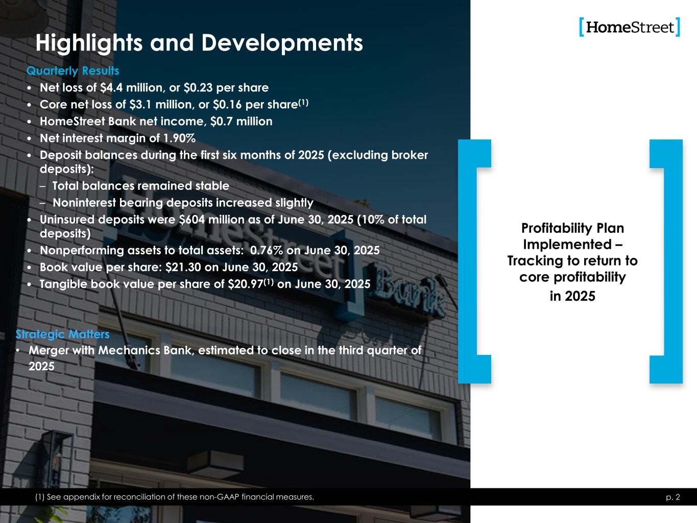 Highlights and Developments p. 2 Quarterly Results • Net loss of $4.4 million, or $0.23 per share • Core net loss of $3.1 million, or $0.16 per share(1) • HomeStreet Bank net income, $0.7 million • Net interest margin of 1.90% • Deposit balances during the first six months of 2025 (excluding broker deposits): – Total balances remained stable – Noninterest bearing deposits increased slightly • Uninsured deposits were $604 million as of June 30, 2025 (10% of total deposits) • Nonperforming assets to total assets: 0.76% on June 30, 2025 • Book value per share: $21.30 on June 30, 2025 • Tangible book value per share of $20.97(1) on June 30, 2025 Profitability Plan Implemented – Tracking to return to core profitability in 2025 (1) See appendix for reconciliation of these non-GAAP financial measures. Strategic Matters • Merger with Mechanics Bank, estimated to close in the third quarter of 2025