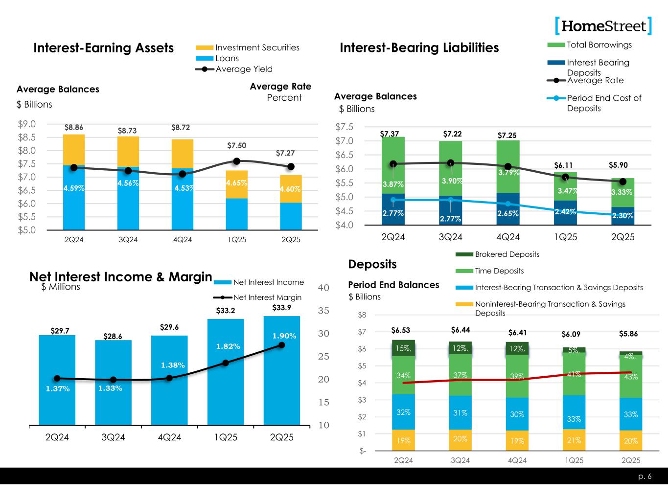p. 5 Diversified Deposit Base: • The average balance of our noninterest-bearing consumer deposit accounts as of June 30, 2025, was $8,000 and overall average consumer deposit account balance was $30,000. • The average balance of our noninterest-bearing business deposit accounts as of June 30, 2025, was $62,000 and overall average business deposit account balance was $97,000. • As a percentage of our deposit portfolio, our top ten customers make up only 3.7% of our total deposit balances. • Uninsured deposits of $604 million as of June 30, 2025 (10% of total deposits) Continuing ability to attract new deposit clients • Our branch system added 131 new business customers in Q2 2025. • Commercial banking added 36 new customers in Q2 2025. Liquidity: • Our on-balance sheet liquidity as of June 30, 2025, was 21%. • Our available contingent liquidity borrowing sources ($5.4 billion) equal to 92% of the total amount of deposits outstanding as of June 30, 2025. Liquidity Considerations