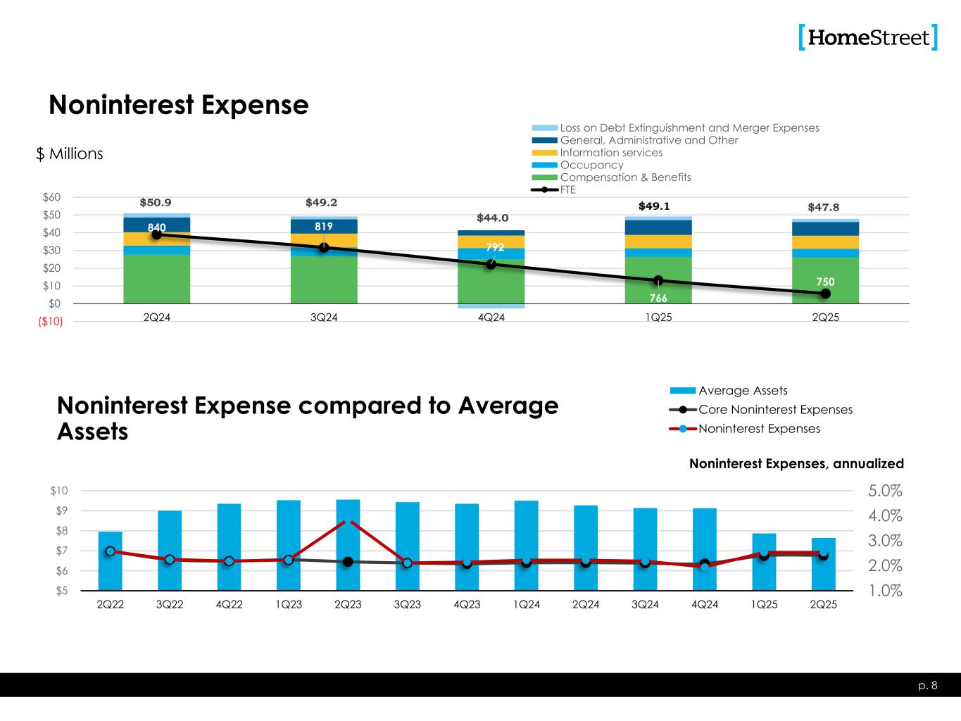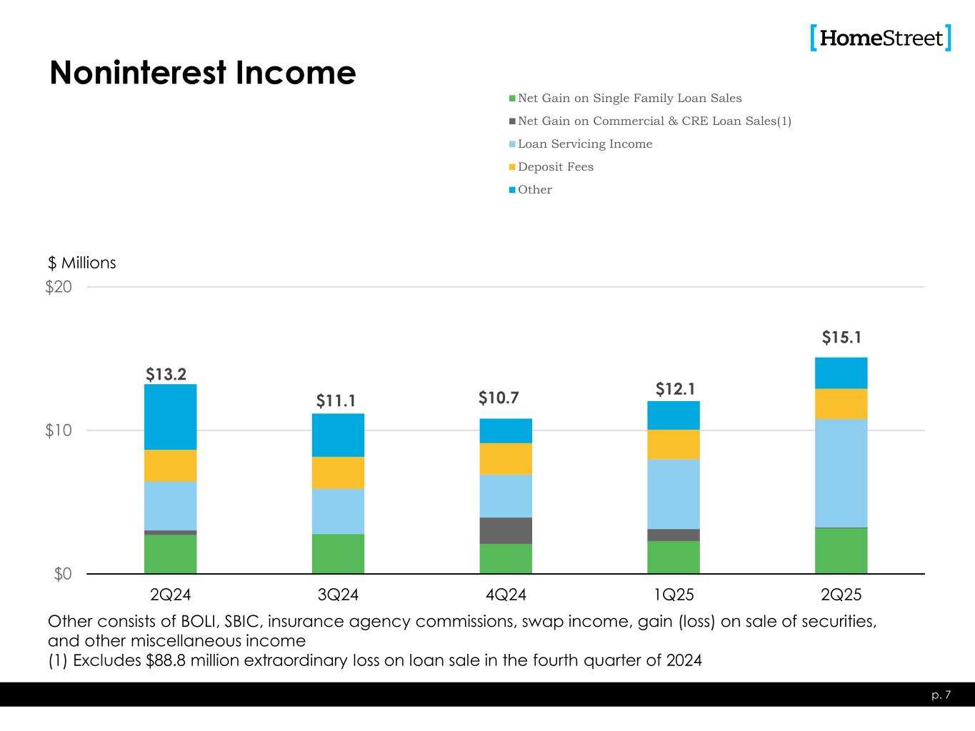 $13.2 $11.1 $10.7 $12.1 $15.1 $0 $10 $20 2Q24 3Q24 4Q24 1Q25 2Q25 Net Gain on Single Family Loan Sales Net Gain on Commercial & CRE Loan Sales(1) Loan Servicing Income Deposit Fees Other Noninterest Income p. 7 $ Millions Other consists of BOLI, SBIC, insurance agency commissions, swap income, gain (loss) on sale of securities, and other miscellaneous income (1) Excludes $88.8 million extraordinary loss on loan sale in the fourth quarter of 2024