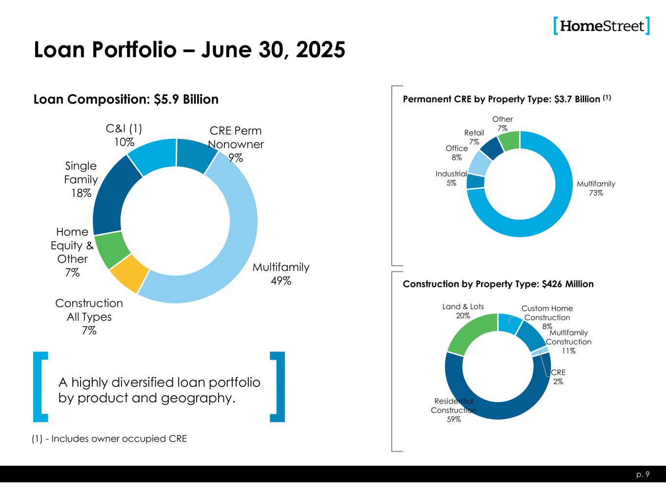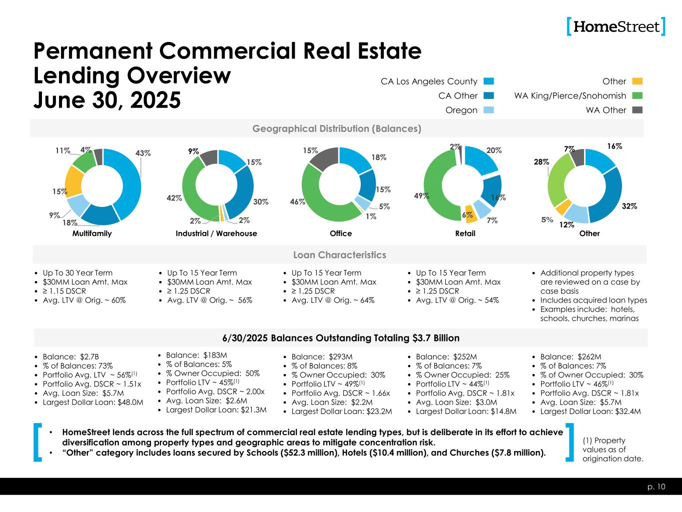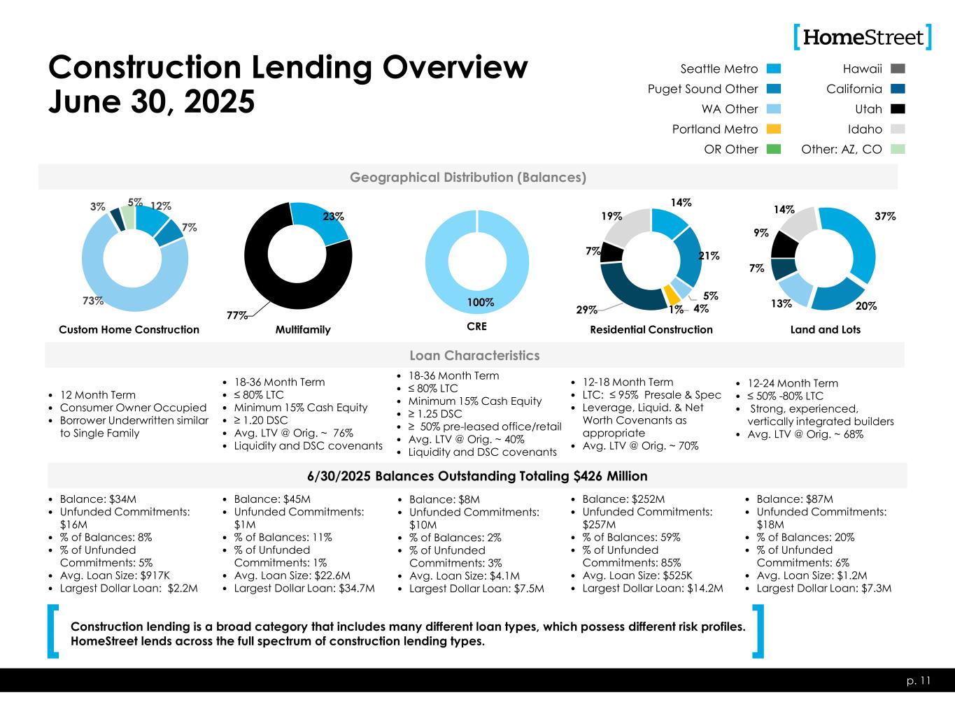 Permanent Commercial Real Estate Lending Overview June 30, 2025 • Up To 30 Year Term • $30MM Loan Amt. Max • ≥ 1.15 DSCR • Avg. LTV @ Orig. ~ 60% p. 10 Loan Characteristics • Up To 15 Year Term • $30MM Loan Amt. Max • ≥ 1.25 DSCR • Avg. LTV @ Orig. ~ 56% • Up To 15 Year Term • $30MM Loan Amt. Max • ≥ 1.25 DSCR • Avg. LTV @ Orig. ~ 64% • Up To 15 Year Term • $30MM Loan Amt. Max • ≥ 1.25 DSCR • Avg. LTV @ Orig. ~ 54% • Additional property types are reviewed on a case by case basis • Includes acquired loan types • Examples include: hotels, schools, churches, marinas • Balance: $2.7B • % of Balances: 73% • Portfolio Avg. LTV ~ 56%(1) • Portfolio Avg. DSCR ~ 1.51x • Avg. Loan Size: $5.7M • Largest Dollar Loan: $48.0M 6/30/2025 Balances Outstanding Totaling $3.7 Billion • Balance: $183M • % of Balances: 5% • % Owner Occupied: 50% • Portfolio LTV ~ 45%(1) • Portfolio Avg. DSCR ~ 2.00x • Avg. Loan Size: $2.6M • Largest Dollar Loan: $21.3M • Balance: $293M • % of Balances: 8% • % Owner Occupied: 30% • Portfolio LTV ~ 49%(1) • Portfolio Avg. DSCR ~ 1.66x • Avg. Loan Size: $2.2M • Largest Dollar Loan: $23.2M • Balance: $252M • % of Balances: 7% • % Owner Occupied: 25% • Portfolio LTV ~ 44%(1) • Portfolio Avg. DSCR ~ 1.81x • Avg. Loan Size: $3.0M • Largest Dollar Loan: $14.8M • Balance: $262M • % of Balances: 7% • % of Owner Occupied: 30% • Portfolio LTV ~ 46%(1) • Portfolio Avg. DSCR ~ 1.81x • Avg. Loan Size: $5.7M • Largest Dollar Loan: $32.4M 43% 18% 9% 15% 11% 4% Geographical Distribution (Balances) Multifamily 15% 30% 2%2% 42% 9% Industrial / Warehouse 18% 15% 5% 1% 46% 15% Office 20% 16% 6% 7% 49% 2% Retail 16% 32% 12%5% 28% 7% Other CA Los Angeles County CA Other Oregon Other WA King/Pierce/Snohomish WA Other (1) Property values as of origination date. • HomeStreet lends across the full spectrum of commercial real estate lending types, but is deliberate in its effort to achieve diversification among property types and geographic areas to mitigate concentration risk. • “Other” category includes loans secured by Schools ($52.3 million), Hotels ($10.4 million), and Churches ($7.8 million).