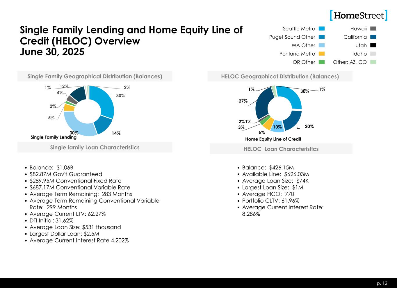 Construction Lending Overview June 30, 2025 • 12 Month Term • Consumer Owner Occupied • Borrower Underwritten similar to Single Family p. 11 Loan Characteristics • 18-36 Month Term • ≤ 80% LTC • Minimum 15% Cash Equity • ≥ 1.20 DSC • Avg. LTV @ Orig. ~ 76% • Liquidity and DSC covenants • 18-36 Month Term • ≤ 80% LTC • Minimum 15% Cash Equity • ≥ 1.25 DSC • ≥ 50% pre-leased office/retail • Avg. LTV @ Orig. ~ 40% • Liquidity and DSC covenants • 12-18 Month Term • LTC: ≤ 95% Presale & Spec • Leverage, Liquid. & Net Worth Covenants as appropriate • Avg. LTV @ Orig. ~ 70% • 12-24 Month Term • ≤ 50% -80% LTC • Strong, experienced, vertically integrated builders • Avg. LTV @ Orig. ~ 68% • Balance: $34M • Unfunded Commitments: $16M • % of Balances: 8% • % of Unfunded Commitments: 5% • Avg. Loan Size: $917K • Largest Dollar Loan: $2.2M 6/30/2025 Balances Outstanding Totaling $426 Million • Balance: $45M • Unfunded Commitments: $1M • % of Balances: 11% • % of Unfunded Commitments: 1% • Avg. Loan Size: $22.6M • Largest Dollar Loan: $34.7M • Balance: $8M • Unfunded Commitments: $10M • % of Balances: 2% • % of Unfunded Commitments: 3% • Avg. Loan Size: $4.1M • Largest Dollar Loan: $7.5M • Balance: $252M • Unfunded Commitments: $257M • % of Balances: 59% • % of Unfunded Commitments: 85% • Avg. Loan Size: $525K • Largest Dollar Loan: $14.2M • Balance: $87M • Unfunded Commitments: $18M • % of Balances: 20% • % of Unfunded Commitments: 6% • Avg. Loan Size: $1.2M • Largest Dollar Loan: $7.3M 12% 7% 73% 3% 5% Geographical Distribution (Balances) Custom Home Construction 23% 77% Multifamily 100% CRE 14% 21% 5% 4%1%29% 7% 19% Residential Construction 37% 20%13% 7% 9% 14% Land and Lots Seattle Metro Puget Sound Other WA Other Portland Metro OR Other Hawaii California Utah Idaho Other: AZ, CO Construction lending is a broad category that includes many different loan types, which possess different risk profiles. HomeStreet lends across the full spectrum of construction lending types.