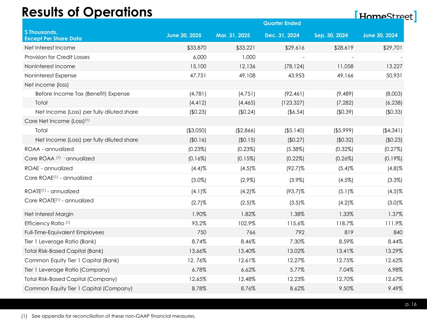 Results of Operations Quarter Ended $ Thousands, Except Per Share Data June 30, 2025 Mar. 31, 2025 Dec. 31, 2024 Sep. 30, 2024 June 30, 2024 Net Interest Income $33,870 $33,221 $29,616 $28,619 $29,701 Provision for Credit Losses 6,000 1,000 - - - Noninterest Income 15,100 12,136 (78,124) 11,058 13,227 Noninterest Expense 47,751 49,108 43,953 49,166 50,931 Net income (loss) Before Income Tax (Benefit) Expense (4,781) (4,751) (92,461) (9,489) (8,003) Total (4,412) (4,465) (123,327) (7,282) (6,238) Net Income (Loss) per fully diluted share ($0.23) ($0.24) ($6.54) ($0.39) ($0.33) Core Net Income (Loss)(1) Total ($3,050) ($2,866) ($5,140) ($5,999) ($4,341) Net Income (Loss) per fully diluted share ($0.16) ($0.15) ($0.27) ($0.32) ($0.23) ROAA - annualized (0.23%) (0.23%) (5.38%) (0.32%) (0.27%) Core ROAA (1) - annualized (0.16%) (0.15%) (0.22%) (0.26%) (0.19%) ROAE - annualized (4.4)% (4.5)% (92.7)% (5.4)% (4.8)% Core ROAE(1) - annualized (3.0%) (2.9%) (3.9%) (4.5%) (3.3%) ROATE(1) - annualized (4.1)% (4.2)% (93.7)% (5.1)% (4.5)% Core ROATE(1) - annualized (2.7)% (2.5)% (3.5)% (4.2)% (3.0)% Net Interest Margin 1.90% 1.82% 1.38% 1.33% 1.37% Efficiency Ratio (1) 93.2% 102.9% 115.6% 118.7% 111.9% Full-Time-Equivalent Employees 750 766 792 819 840 Tier 1 Leverage Ratio (Bank) 8.74% 8.46% 7.30% 8.59% 8.44% Total Risk-Based Capital (Bank) 13.66% 13.40% 13.02% 13.41% 13.29% Common Equity Tier 1 Capital (Bank) 12. 76% 12.61% 12.27% 12.75% 12.62% Tier 1 Leverage Ratio (Company) 6.78% 6.62% 5.77% 7.04% 6.98% Total Risk-Based Capital (Company) 12.65% 12.48% 12.23% 12.70% 12.67% Common Equity Tier 1 Capital (Company) 8.78% 8.76% 8.62% 9.50% 9.49% p. 16 (1) See appendix for reconciliation of these non-GAAP financial measures.