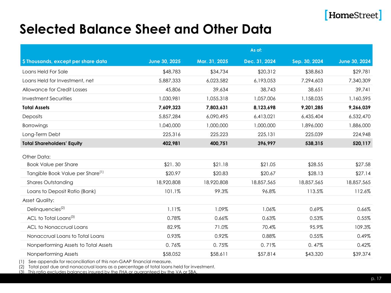 Selected Balance Sheet and Other Data As of: $ Thousands, except per share data June 30, 2025 Mar. 31, 2025 Dec. 31, 2024 Sep. 30, 2024 June 30, 2024 Loans Held For Sale $48,783 $34,734 $20,312 $38,863 $29,781 Loans Held for Investment, net 5,887,333 6,023,582 6,193,053 7,294,603 7,340,309 Allowance for Credit Losses 45,806 39,634 38,743 38,651 39,741 Investment Securities 1,030,981 1,055,318 1,057,006 1,158,035 1,160,595 Total Assets 7,609,323 7,803,631 8,123,698 9,201,285 9,266,039 Deposits 5,857,284 6,090,495 6,413,021 6,435,404 6,532,470 Borrowings 1,040,000 1,000,000 1,000,000 1,896,000 1,886,000 Long-Term Debt 225,316 225,223 225,131 225,039 224,948 Total Shareholders’ Equity 402,981 400,751 396,997 538,315 520,117 Other Data: Book Value per Share $21. 30 $21.18 $21.05 $28.55 $27.58 Tangible Book Value per Share(1) $20.97 $20.83 $20.67 $28.13 $27.14 Shares Outstanding 18,920,808 18,920,808 18,857,565 18,857,565 18,857,565 Loans to Deposit Ratio (Bank) 101.1% 99.3% 96.8% 113.5% 112.6% Asset Quality: Delinquencies(2) 1.11% 1.09% 1.06% 0.69% 0.66% ACL to Total Loans(3) 0.78% 0.66% 0.63% 0.53% 0.55% ACL to Nonaccrual Loans 82.9% 71.0% 70.4% 95.9% 109.3% Nonaccrual Loans to Total Loans 0.93% 0.92% 0.88% 0.55% 0.49% Nonperforming Assets to Total Assets 0. 76% 0. 75% 0. 71% 0. 47% 0.42% Nonperforming Assets $58,052 $58,611 $57,814 $43,320 $39,374 p. 17 (1) See appendix for reconciliation of this non-GAAP financial measure. (2) Total past due and nonaccrual loans as a percentage of total loans held for investment. (3) This ratio excludes balances insured by the FHA or guaranteed by the VA or SBA.