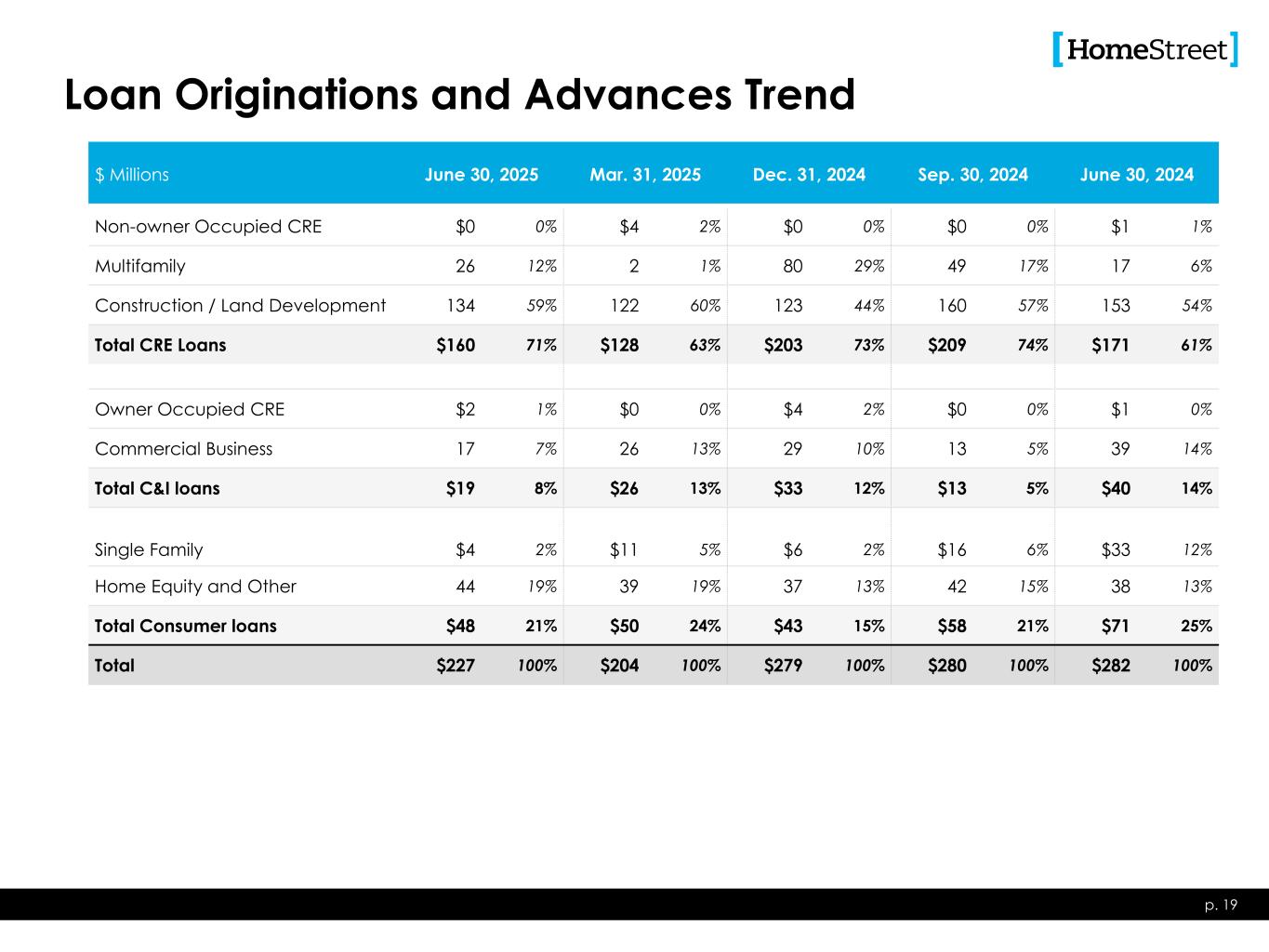 Loan Originations and Advances Trend p. 19 $ Millions June 30, 2025 Mar. 31, 2025 Dec. 31, 2024 Sep. 30, 2024 June 30, 2024 Non-owner Occupied CRE $0 0% $4 2% $0 0% $0 0% $1 1% Multifamily 26 12% 2 1% 80 29% 49 17% 17 6% Construction / Land Development 134 59% 122 60% 123 44% 160 57% 153 54% Total CRE Loans $160 71% $128 63% $203 73% $209 74% $171 61% Owner Occupied CRE $2 1% $0 0% $4 2% $0 0% $1 0% Commercial Business 17 7% 26 13% 29 10% 13 5% 39 14% Total C&I loans $19 8% $26 13% $33 12% $13 5% $40 14% Single Family $4 2% $11 5% $6 2% $16 6% $33 12% Home Equity and Other 44 19% 39 19% 37 13% 42 15% 38 13% Total Consumer loans $48 21% $50 24% $43 15% $58 21% $71 25% Total $227 100% $204 100% $279 100% $280 100% $282 100%
