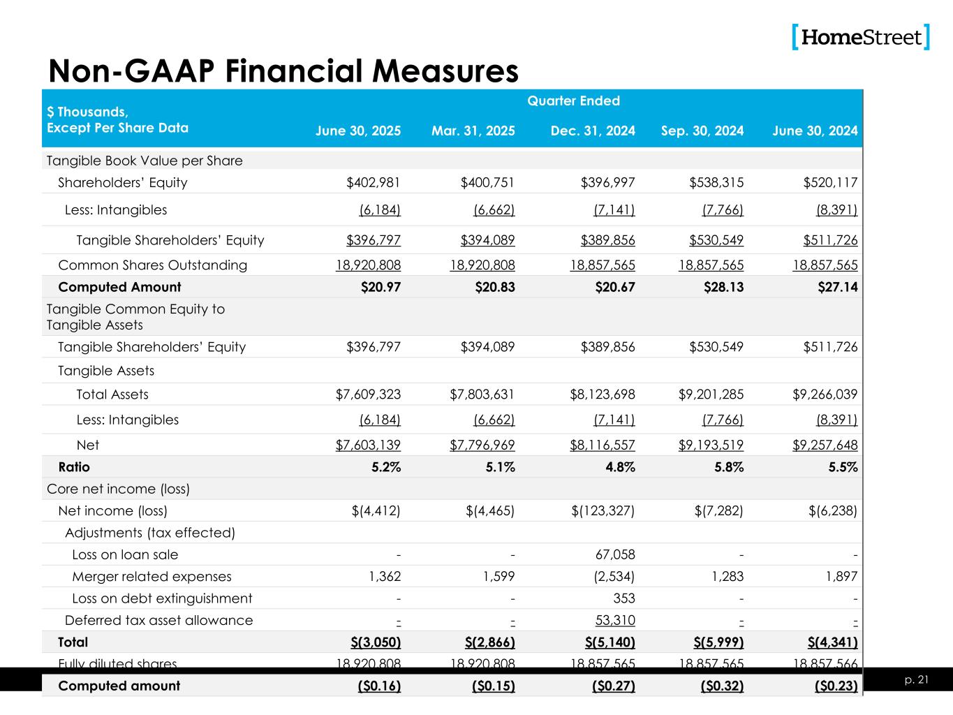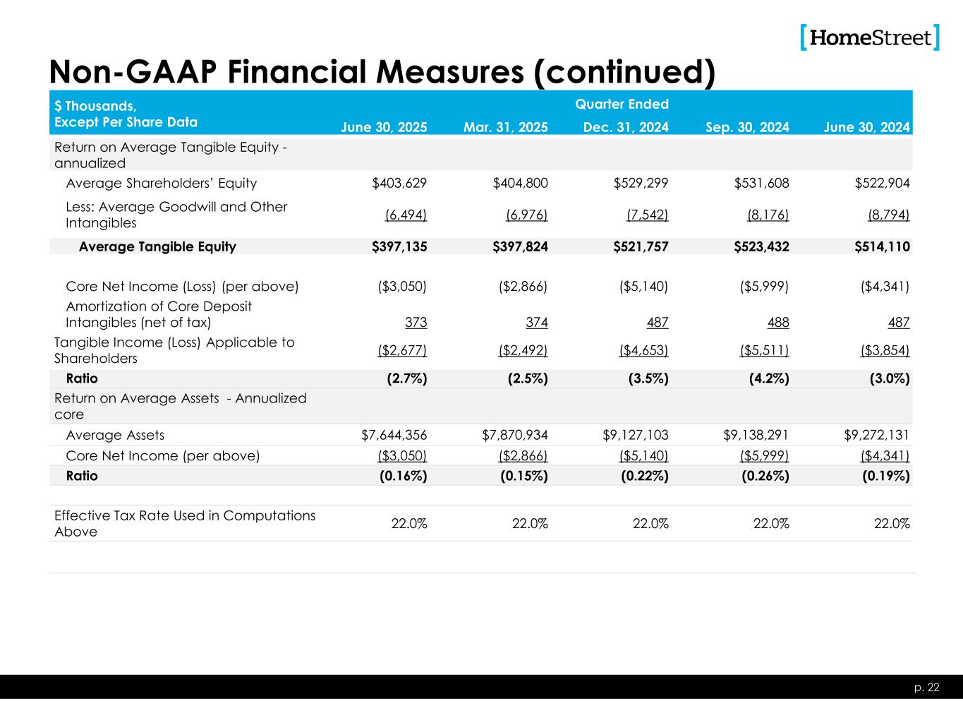 Non-GAAP Financial Measures $ Thousands, Except Per Share Data Quarter Ended June 30, 2025 Mar. 31, 2025 Dec. 31, 2024 Sep. 30, 2024 June 30, 2024 Tangible Book Value per Share Shareholders’ Equity $402,981 $400,751 $396,997 $538,315 $520,117 Less: Intangibles (6,184) (6,662) (7,141) (7,766) (8,391) Tangible Shareholders’ Equity $396,797 $394,089 $389,856 $530,549 $511,726 Common Shares Outstanding 18,920,808 18,920,808 18,857,565 18,857,565 18,857,565 Computed Amount $20.97 $20.83 $20.67 $28.13 $27.14 Tangible Common Equity to Tangible Assets Tangible Shareholders’ Equity $396,797 $394,089 $389,856 $530,549 $511,726 Tangible Assets Total Assets $7,609,323 $7,803,631 $8,123,698 $9,201,285 $9,266,039 Less: Intangibles (6,184) (6,662) (7,141) (7,766) (8,391) Net $7,603,139 $7,796,969 $8,116,557 $9,193,519 $9,257,648 Ratio 5.2% 5.1% 4.8% 5.8% 5.5% Core net income (loss) Net income (loss) $(4,412) $(4,465) $(123,327) $(7,282) $(6,238) Adjustments (tax effected) Loss on loan sale - - 67,058 - - Merger related expenses 1,362 1,599 (2,534) 1,283 1,897 Loss on debt extinguishment - - 353 - - Deferred tax asset allowance - - 53,310 - - Total $(3,050) $(2,866) $(5,140) $(5,999) $(4,341) Fully diluted shares 18,920,808 18,920,808 18,857,565 18,857,565 18,857,566 Computed amount ($0.16) ($0.15) ($0.27) ($0.32) ($0.23) p. 21