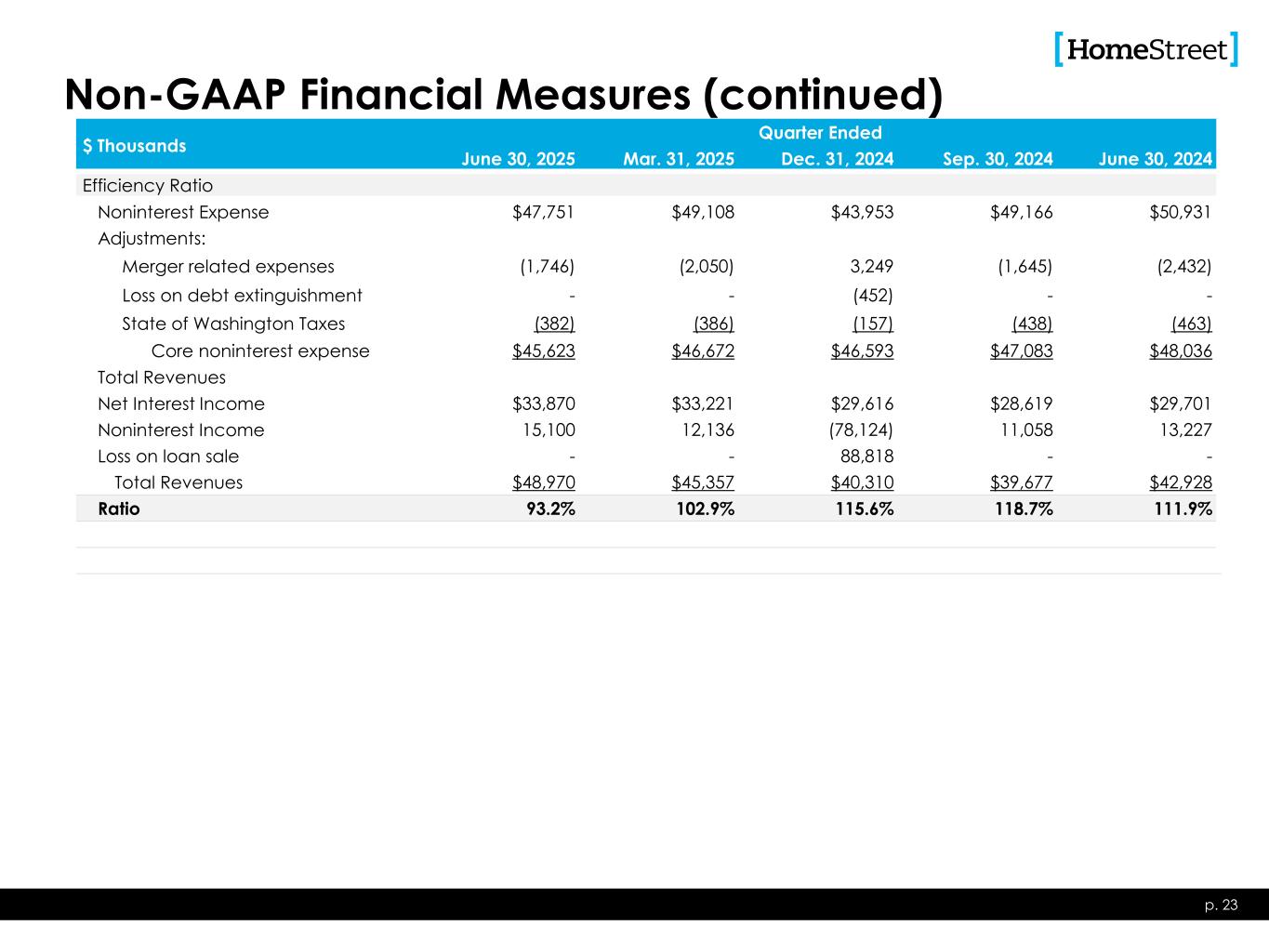 Non-GAAP Financial Measures (continued) $ Thousands Quarter Ended June 30, 2025 Mar. 31, 2025 Dec. 31, 2024 Sep. 30, 2024 June 30, 2024 Efficiency Ratio Noninterest Expense $47,751 $49,108 $43,953 $49,166 $50,931 Adjustments: Merger related expenses (1,746) (2,050) 3,249 (1,645) (2,432) Loss on debt extinguishment - - (452) - - State of Washington Taxes (382) (386) (157) (438) (463) Core noninterest expense $45,623 $46,672 $46,593 $47,083 $48,036 Total Revenues Net Interest Income $33,870 $33,221 $29,616 $28,619 $29,701 Noninterest Income 15,100 12,136 (78,124) 11,058 13,227 Loss on loan sale - - 88,818 - - Total Revenues $48,970 $45,357 $40,310 $39,677 $42,928 Ratio 93.2% 102.9% 115.6% 118.7% 111.9% p. 23