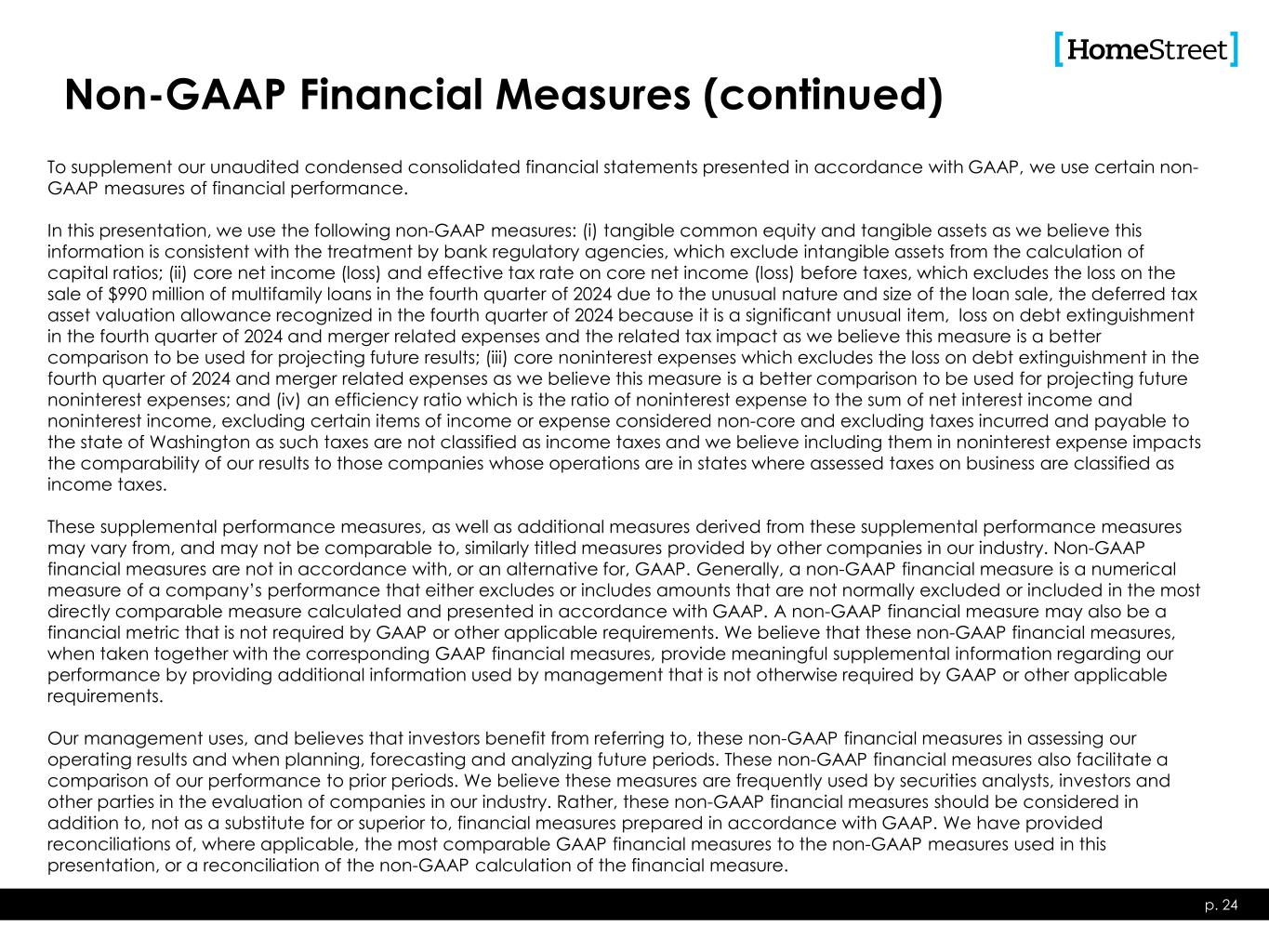 Non-GAAP Financial Measures (continued) p. 24 To supplement our unaudited condensed consolidated financial statements presented in accordance with GAAP, we use certain non- GAAP measures of financial performance. In this presentation, we use the following non-GAAP measures: (i) tangible common equity and tangible assets as we believe this information is consistent with the treatment by bank regulatory agencies, which exclude intangible assets from the calculation of capital ratios; (ii) core net income (loss) and effective tax rate on core net income (loss) before taxes, which excludes the loss on the sale of $990 million of multifamily loans in the fourth quarter of 2024 due to the unusual nature and size of the loan sale, the deferred tax asset valuation allowance recognized in the fourth quarter of 2024 because it is a significant unusual item, loss on debt extinguishment in the fourth quarter of 2024 and merger related expenses and the related tax impact as we believe this measure is a better comparison to be used for projecting future results; (iii) core noninterest expenses which excludes the loss on debt extinguishment in the fourth quarter of 2024 and merger related expenses as we believe this measure is a better comparison to be used for projecting future noninterest expenses; and (iv) an efficiency ratio which is the ratio of noninterest expense to the sum of net interest income and noninterest income, excluding certain items of income or expense considered non-core and excluding taxes incurred and payable to the state of Washington as such taxes are not classified as income taxes and we believe including them in noninterest expense impacts the comparability of our results to those companies whose operations are in states where assessed taxes on business are classified as income taxes. These supplemental performance measures, as well as additional measures derived from these supplemental performance measures may vary from, and may not be comparable to, similarly titled measures provided by other companies in our industry. Non-GAAP financial measures are not in accordance with, or an alternative for, GAAP. Generally, a non-GAAP financial measure is a numerical measure of a company’s performance that either excludes or includes amounts that are not normally excluded or included in the most directly comparable measure calculated and presented in accordance with GAAP. A non-GAAP financial measure may also be a financial metric that is not required by GAAP or other applicable requirements. We believe that these non-GAAP financial measures, when taken together with the corresponding GAAP financial measures, provide meaningful supplemental information regarding our performance by providing additional information used by management that is not otherwise required by GAAP or other applicable requirements. Our management uses, and believes that investors benefit from referring to, these non-GAAP financial measures in assessing our operating results and when planning, forecasting and analyzing future periods. These non-GAAP financial measures also facilitate a comparison of our performance to prior periods. We believe these measures are frequently used by securities analysts, investors and other parties in the evaluation of companies in our industry. Rather, these non-GAAP financial measures should be considered in addition to, not as a substitute for or superior to, financial measures prepared in accordance with GAAP. We have provided reconciliations of, where applicable, the most comparable GAAP financial measures to the non-GAAP measures used in this presentation, or a reconciliation of the non-GAAP calculation of the financial measure.