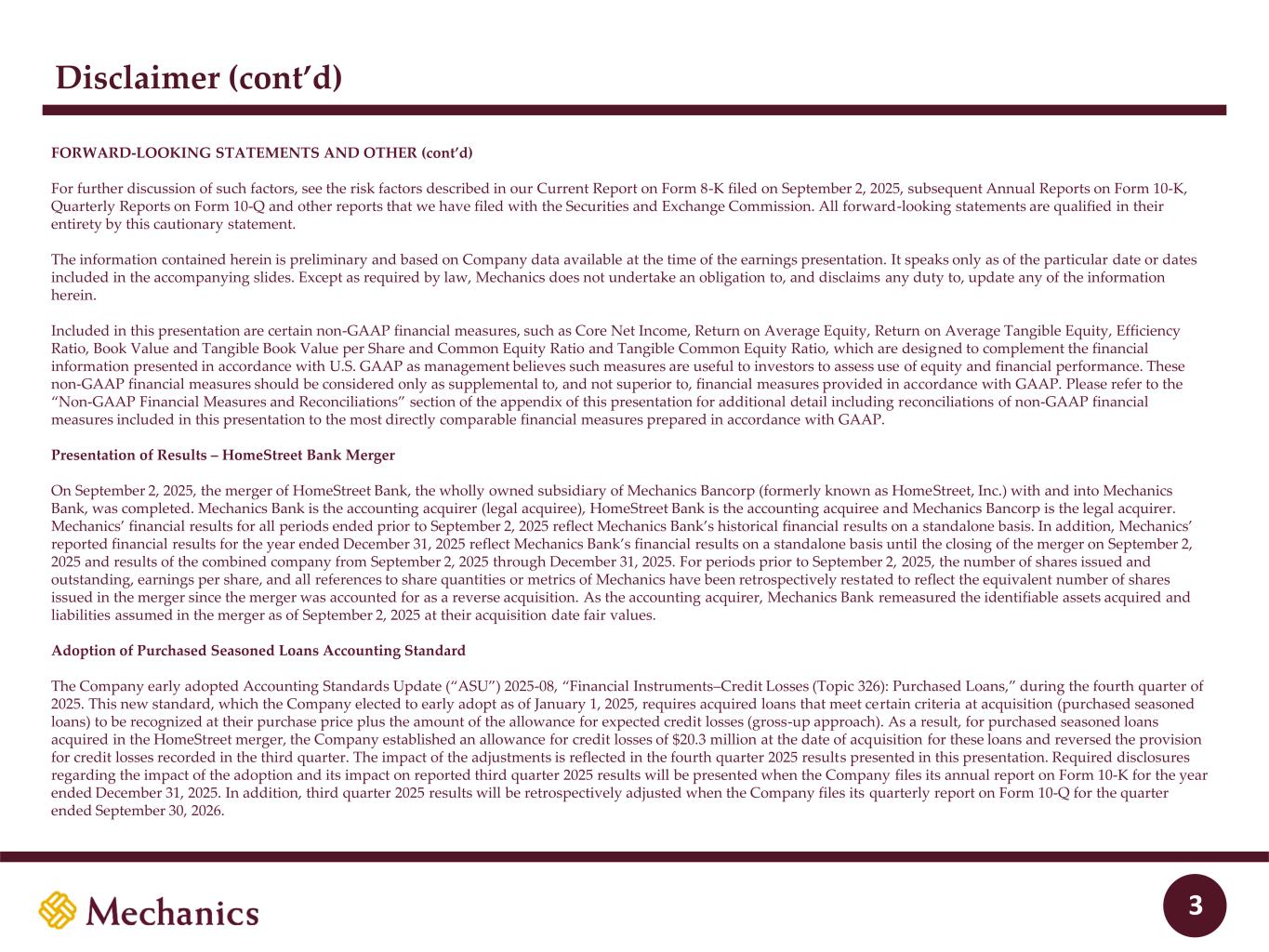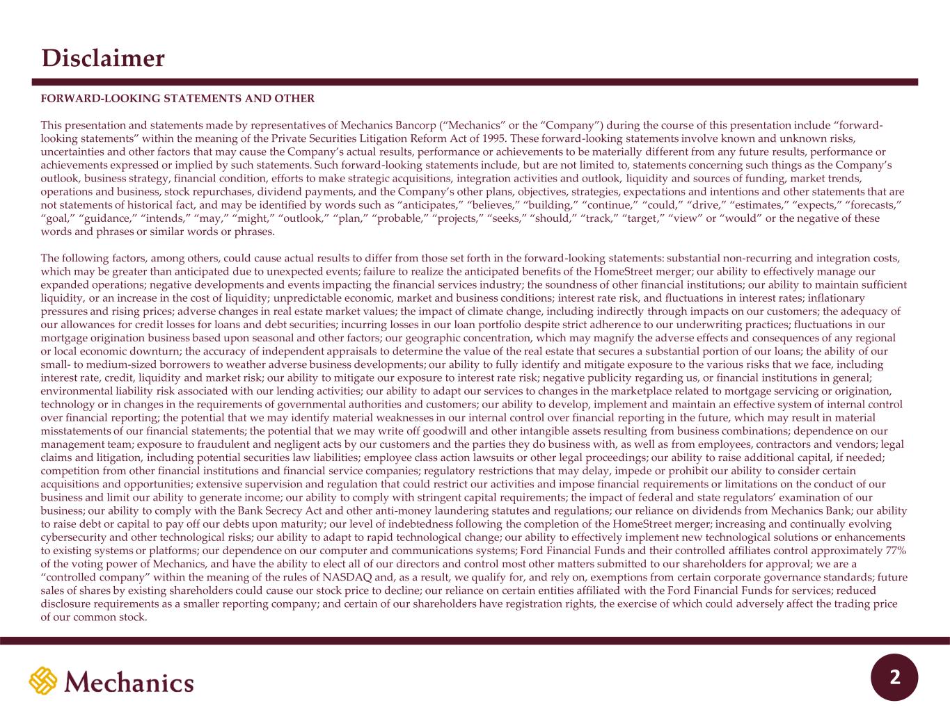 97 22 45 215 163 54 197 103 52 228 191 138 205 192 183 70 97 131 0 32 96 51 63 80 FORWARD-LOOKING STATEMENTS AND OTHER This presentation and statements made by representatives of Mechanics Bancorp (“Mechanics” or the “Company”) during the course of this presentation include “forward- looking statements” within the meaning of the Private Securities Litigation Reform Act of 1995. These forward-looking statements involve known and unknown risks, uncertainties and other factors that may cause the Company’s actual results, performance or achievements to be materially different from any future results, performance or achievements expressed or implied by such statements. Such forward-looking statements include, but are not limited to, statements concerning such things as the Company’s outlook, business strategy, financial condition, efforts to make strategic acquisitions, integration activities and outlook, liquidity and sources of funding, market trends, operations and business, stock repurchases, dividend payments, and the Company’s other plans, objectives, strategies, expectations and intentions and other statements that are not statements of historical fact, and may be identified by words such as “anticipates,” “believes,” “building,” “continue,” “could,” “drive,” “estimates,” “expects,” “forecasts,” “goal,” “guidance,” “intends,” “may,” “might,” “outlook,” “plan,” “probable,” “projects,” “seeks,” “should,” “track,” “target,” “view” or “would” or the negative of these words and phrases or similar words or phrases. The following factors, among others, could cause actual results to differ from those set forth in the forward-looking statements: substantial non-recurring and integration costs, which may be greater than anticipated due to unexpected events; failure to realize the anticipated benefits of the HomeStreet merger; our ability to effectively manage our expanded operations; negative developments and events impacting the financial services industry; the soundness of other financial institutions; our ability to maintain sufficient liquidity, or an increase in the cost of liquidity; unpredictable economic, market and business conditions; interest rate risk, and fluctuations in interest rates; inflationary pressures and rising prices; adverse changes in real estate market values; the impact of climate change, including indirectly through impacts on our customers; the adequacy of our allowances for credit losses for loans and debt securities; incurring losses in our loan portfolio despite strict adherence to our underwriting practices; fluctuations in our mortgage origination business based upon seasonal and other factors; our geographic concentration, which may magnify the adverse effects and consequences of any regional or local economic downturn; the accuracy of independent appraisals to determine the value of the real estate that secures a substantial portion of our loans; the ability of our small- to medium-sized borrowers to weather adverse business developments; our ability to fully identify and mitigate exposure to the various risks that we face, including interest rate, credit, liquidity and market risk; our ability to mitigate our exposure to interest rate risk; negative publicity regarding us, or financial institutions in general; environmental liability risk associated with our lending activities; our ability to adapt our services to changes in the marketplace related to mortgage servicing or origination, technology or in changes in the requirements of governmental authorities and customers; our ability to develop, implement and maintain an effective system of internal control over financial reporting; the potential that we may identify material weaknesses in our internal control over financial reporting in the future, which may result in material misstatements of our financial statements; the potential that we may write off goodwill and other intangible assets resulting from business combinations; dependence on our management team; exposure to fraudulent and negligent acts by our customers and the parties they do business with, as well as from employees, contractors and vendors; legal claims and litigation, including potential securities law liabilities; employee class action lawsuits or other legal proceedings; our ability to raise additional capital, if needed; competition from other financial institutions and financial service companies; regulatory restrictions that may delay, impede or prohibit our ability to consider certain acquisitions and opportunities; extensive supervision and regulation that could restrict our activities and impose financial requirements or limitations on the conduct of our business and limit our ability to generate income; our ability to comply with stringent capital requirements; the impact of federal and state regulators’ examination of our business; our ability to comply with the Bank Secrecy Act and other anti-money laundering statutes and regulations; our reliance on dividends from Mechanics Bank; our ability to raise debt or capital to pay off our debts upon maturity; our level of indebtedness following the completion of the HomeStreet merger; increasing and continually evolving cybersecurity and other technological risks; our ability to adapt to rapid technological change; our ability to effectively implement new technological solutions or enhancements to existing systems or platforms; our dependence on our computer and communications systems; Ford Financial Funds and their controlled affiliates control approximately 77% of the voting power of Mechanics, and have the ability to elect all of our directors and control most other matters submitted to our shareholders for approval; we are a “controlled company” within the meaning of the rules of NASDAQ and, as a result, we qualify for, and rely on, exemptions from certain corpor