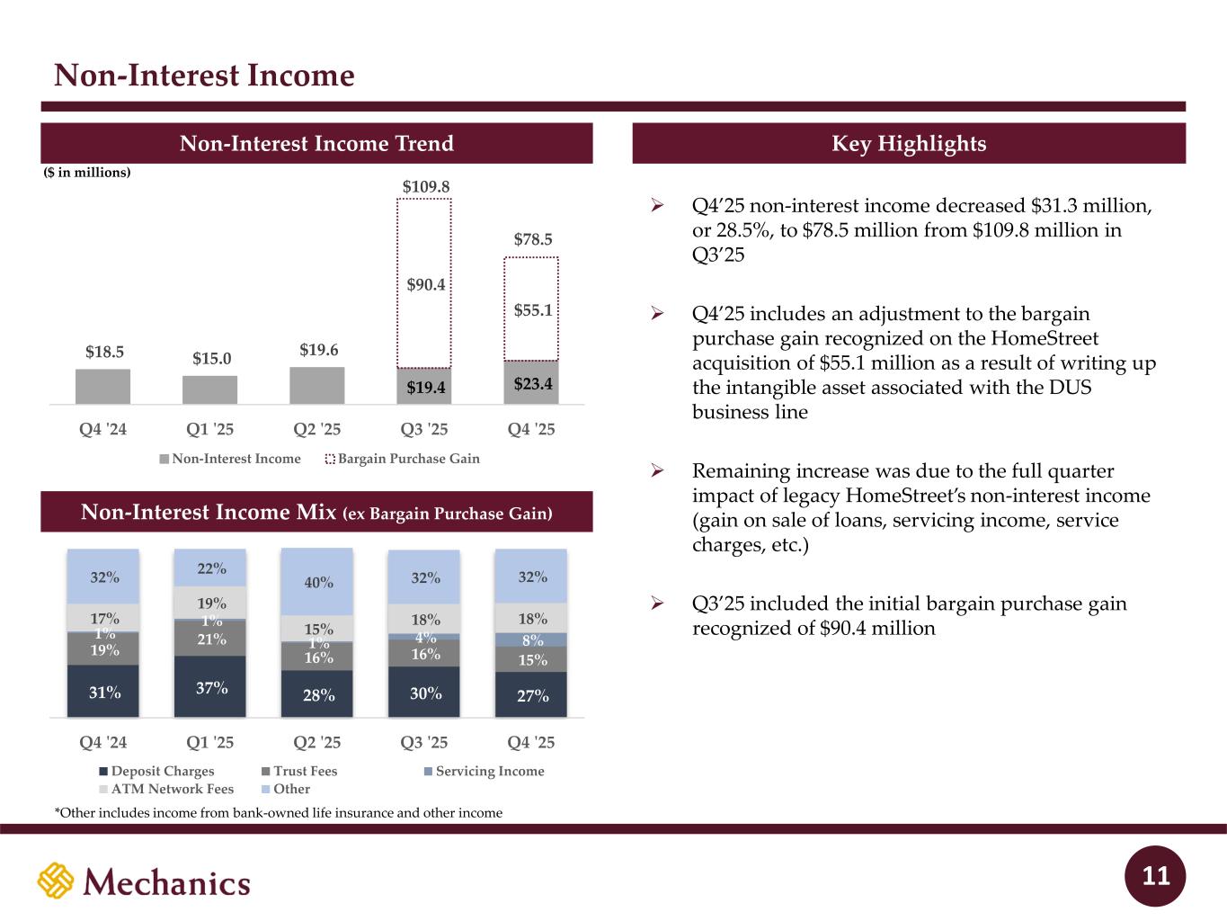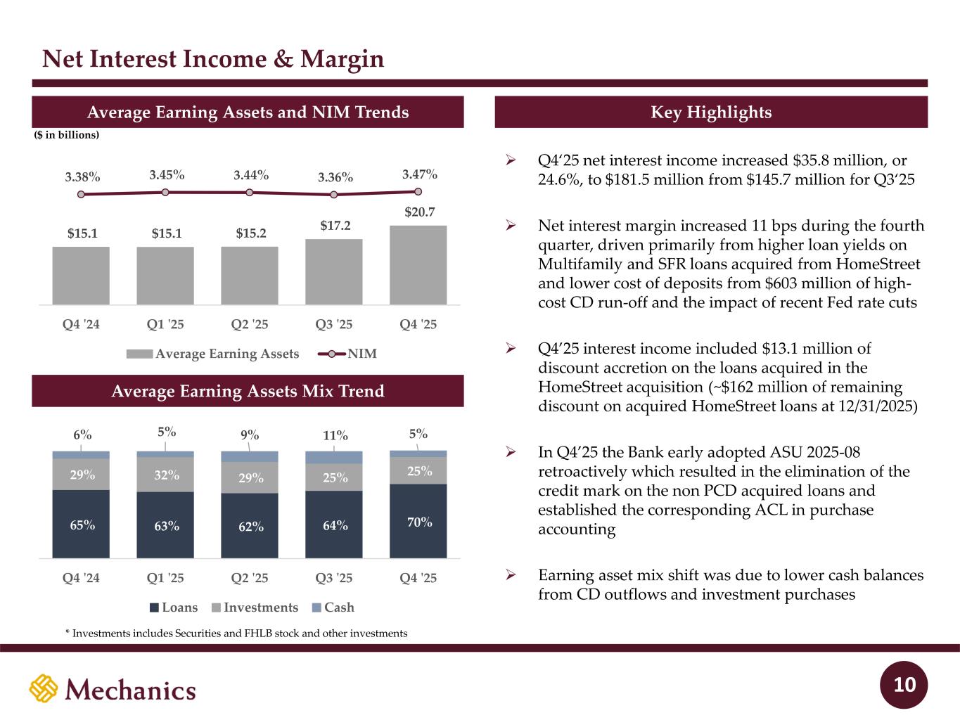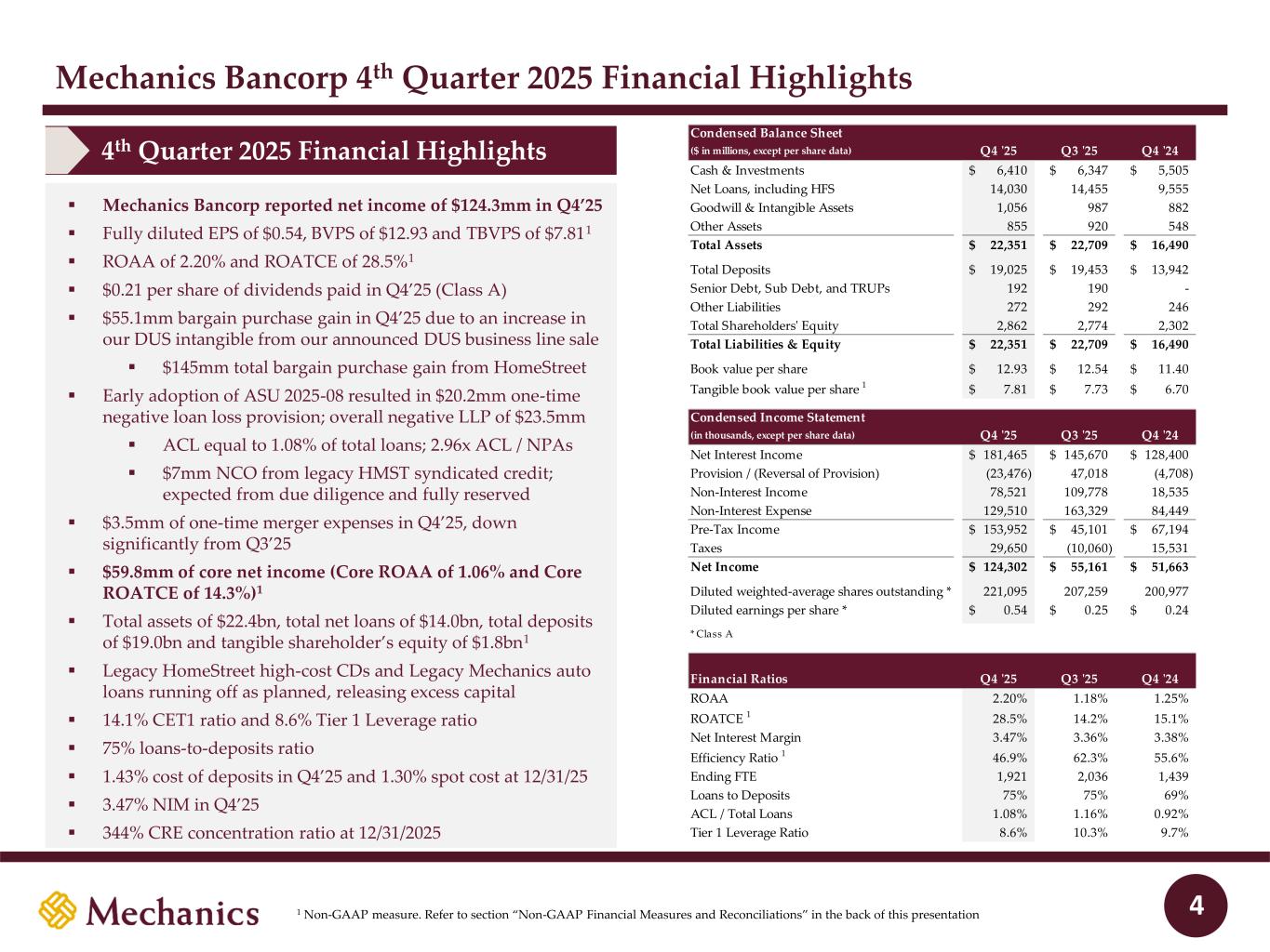 97 22 45 215 163 54 197 103 52 228 191 138 205 192 183 70 97 131 0 32 96 51 63 80 Disclaimer (cont’d) FORWARD-LOOKING STATEMENTS AND OTHER (cont’d) For further discussion of such factors, see the risk factors described in our Current Report on Form 8-K filed on September 2, 2025, subsequent Annual Reports on Form 10-K, Quarterly Reports on Form 10-Q and other reports that we have filed with the Securities and Exchange Commission. All forward-looking statements are qualified in their entirety by this cautionary statement. The information contained herein is preliminary and based on Company data available at the time of the earnings presentation. It speaks only as of the particular date or dates included in the accompanying slides. Except as required by law, Mechanics does not undertake an obligation to, and disclaims any duty to, update any of the information herein. Included in this presentation are certain non-GAAP financial measures, such as Core Net Income, Return on Average Equity, Return on Average Tangible Equity, Efficiency Ratio, Book Value and Tangible Book Value per Share and Common Equity Ratio and Tangible Common Equity Ratio, which are designed to complement the financial information presented in accordance with U.S. GAAP as management believes such measures are useful to investors to assess use of equity and financial performance. These non-GAAP financial measures should be considered only as supplemental to, and not superior to, financial measures provided in accordance with GAAP. Please refer to the “Non-GAAP Financial Measures and Reconciliations” section of the appendix of this presentation for additional detail including reconciliations of non-GAAP financial measures included in this presentation to the most directly comparable financial measures prepared in accordance with GAAP. Presentation of Results – HomeStreet Bank Merger On September 2, 2025, the merger of HomeStreet Bank, the wholly owned subsidiary of Mechanics Bancorp (formerly known as HomeStreet, Inc.) with and into Mechanics Bank, was completed. Mechanics Bank is the accounting acquirer (legal acquiree), HomeStreet Bank is the accounting acquiree and Mechanics Bancorp is the legal acquirer. Mechanics’ financial results for all periods ended prior to September 2, 2025 reflect Mechanics Bank’s historical financial results on a standalone basis. In addition, Mechanics’ reported financial results for the year ended December 31, 2025 reflect Mechanics Bank’s financial results on a standalone basis until the closing of the merger on September 2, 2025 and results of the combined company from September 2, 2025 through December 31, 2025. For periods prior to September 2, 2025, the number of shares issued and outstanding, earnings per share, and all references to share quantities or metrics of Mechanics have been retrospectively restated to reflect the equivalent number of shares issued in the merger since the merger was accounted for as a reverse acquisition. As the accounting acquirer, Mechanics Bank remeasured the identifiable assets acquired and liabilities assumed in the merger as of September 2, 2025 at their acquisition date fair values. Adoption of Purchased Seasoned Loans Accounting Standard The Company early adopted Accounting Standards Update (“ASU”) 2025-08, “Financial Instruments–Credit Losses (Topic 326): Purchased Loans,” during the fourth quarter of 2025. This new standard, which the Company elected to early adopt as of January 1, 2025, requires acquired loans that meet certain criteria at acquisition (purchased seasoned loans) to be recognized at their purchase price plus the amount of the allowance for expected credit losses (gross-up approach). As a result, for purchased seasoned loans acquired in the HomeStreet merger, the Company established an allowance for credit losses of $20.3 million at the date of acquisition for these loans and reversed the provision for credit losses recorded in the third quarter. The impact of the adjustments is reflected in the fourth quarter 2025 results presented in this presentation. Required disclosures regarding the impact of the adoption and its impact on reported third quarter 2025 results will be presented when the Company files its annual report on Form 10-K for the year ended December 31, 2025. In addition, third quarter 2025 results will be retrospectively adjusted when the Company files its quarterly report on Form 10-Q for the quarter ended September 30, 2026. 3