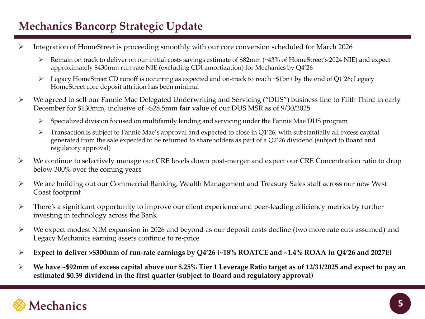 97 22 45 215 163 54 197 103 52 228 191 138 205 192 183 70 97 131 0 32 96 51 63 80 Mechanics Bancorp 4th Quarter 2025 Financial Highlights 41 Non-GAAP measure. Refer to section “Non-GAAP Financial Measures and Reconciliations” in the back of this presentation Condensed Balance Sheet ($ in millions, except per share data) Q4 '25 Q3 '25 Q4 '24 Cash & Investments 6,410$ 6,347$ 5,505$ Net Loans, including HFS 14,030 14,455 9,555 Goodwill & Intangible Assets 1,056 987 882 Other Assets 855 920 548 Total Assets 22,351$ 22,709$ 16,490$ Total Deposits 19,025$ 19,453$ 13,942$ Senior Debt, Sub Debt, and TRUPs 192 190 - Other Liabilities 272 292 246 Total Shareholders' Equity 2,862 2,774 2,302 Total Liabilities & Equity 22,351$ 22,709$ 16,490$ Book value per share 12.93$ 12.54$ 11.40$ Tangible book value per share 1 7.81$ 7.73$ 6.70$ Condensed Income Statement (in thousands, except per share data) Q4 '25 Q3 '25 Q4 '24 Net Interest Income 181,465$ 145,670$ 128,400$ Provision / (Reversal of Provision) (23,476) 47,018 (4,708) Non-Interest Income 78,521 109,778 18,535 Non-Interest Expense 129,510 163,329 84,449 Pre-Tax Income 153,952$ 45,101$ 67,194$ Taxes 29,650 (10,060) 15,531 Net Income 124,302$ 55,161$ 51,663$ Diluted weighted-average shares outstanding * 221,095 207,259 200,977 Diluted earnings per share * 0.54$ 0.25$ 0.24$ * Class A Financial Ratios Q4 '25 Q3 '25 Q4 '24 ROAA 2.20% 1.18% 1.25% ROATCE 1 28.5% 14.2% 15.1% Net Interest Margin 3.47% 3.36% 3.38% Efficiency Ratio 1 46.9% 62.3% 55.6% Ending FTE 1,921 2,036 1,439 Loans to Deposits 75% 75% 69% ACL / Total Loans 1.08% 1.16% 0.92% Tier 1 Leverage Ratio 8.6% 10.3% 9.7% 4th Quarter 2025 Financial Highlights ▪ Mechanics Bancorp reported net income of $124.3mm in Q4’25 ▪ Fully diluted EPS of $0.54, BVPS of $12.93 and TBVPS of $7.811 ▪ ROAA of 2.20% and ROATCE of 28.5%1 ▪ $0.21 per share of dividends paid in Q4’25 (Class A) ▪ $55.1mm bargain purchase gain in Q4’25 due to an increase in our DUS intangible from our announced DUS business line sale ▪ $145mm total bargain purchase gain from HomeStreet ▪ Early adoption of ASU 2025-08 resulted in $20.2mm one-time negative loan loss provision; overall negative LLP of $23.5mm ▪ ACL equal to 1.08% of total loans; 2.96x ACL / NPAs ▪ $7mm NCO from legacy HMST syndicated credit; expected from due diligence and fully reserved ▪ $3.5mm of one-time merger expenses in Q4’25, down significantly from Q3’25 ▪ $59.8mm of core net income (Core ROAA of 1.06% and Core ROATCE of 14.3%)1 ▪ Total assets of $22.4bn, total net loans of $14.0bn, total deposits of $19.0bn and tangible shareholder’s equity of $1.8bn1 ▪ Legacy HomeStreet high-cost CDs and Legacy Mechanics auto loans running off as planned, releasing excess capital ▪ 14.1% CET1 ratio and 8.6% Tier 1 Leverage ratio ▪ 75% loans-to-deposits ratio ▪ 1.43% cost of deposits in Q4’25 and 1.30% spot cost at 12/31/25 ▪ 3.47% NIM in Q4’25 ▪ 344% CRE concentration ratio at 12/31/2025