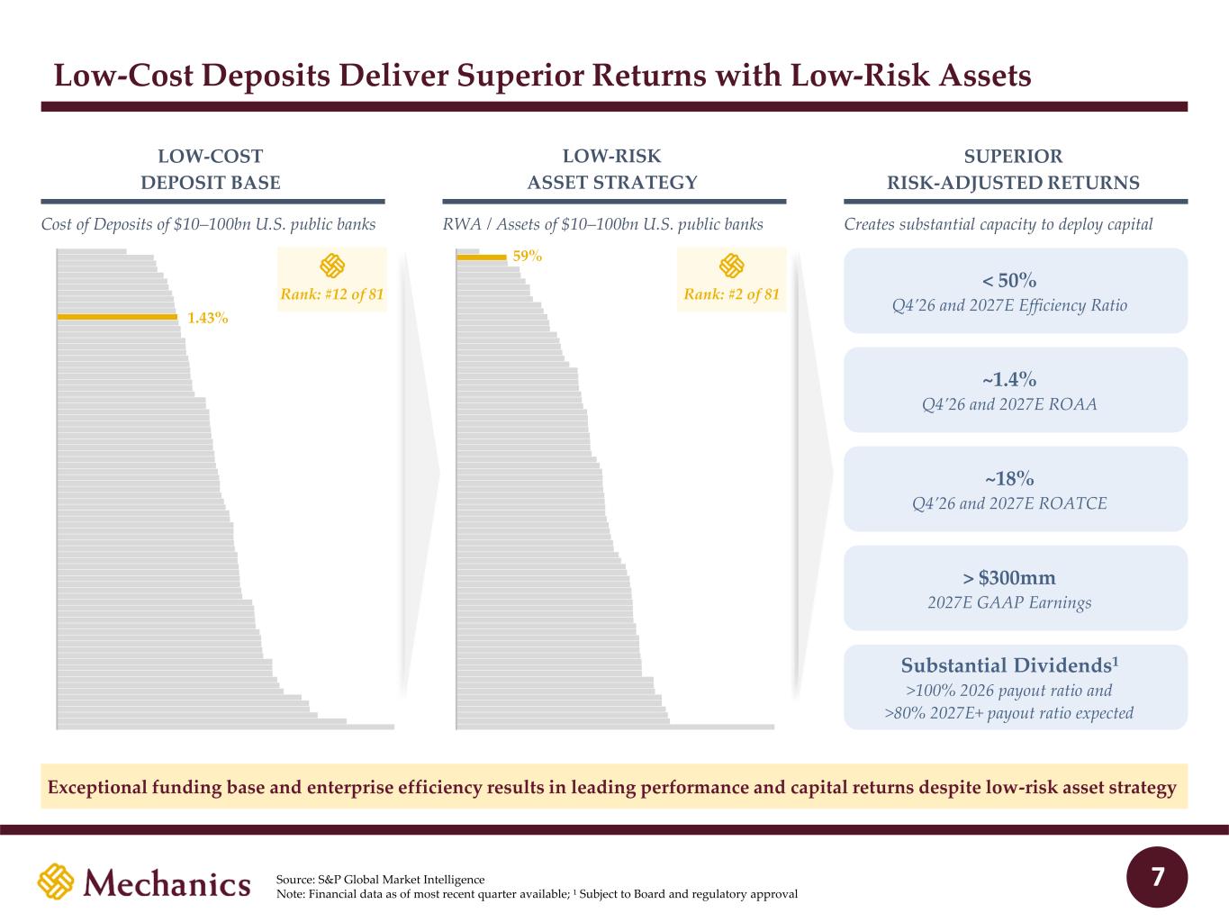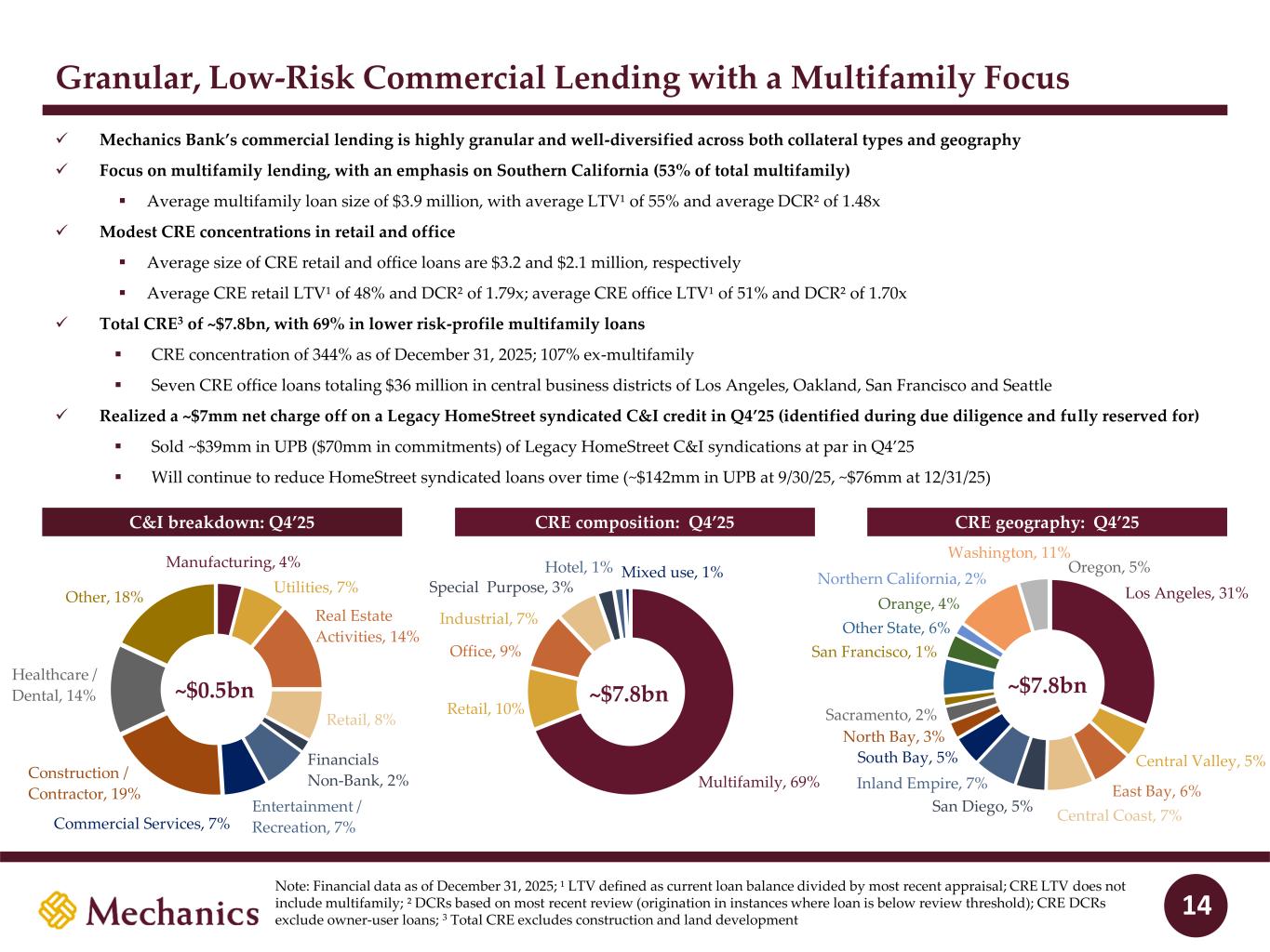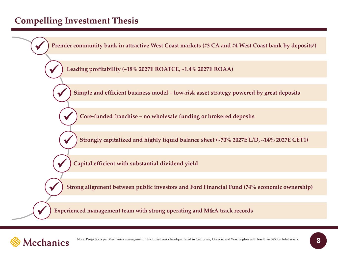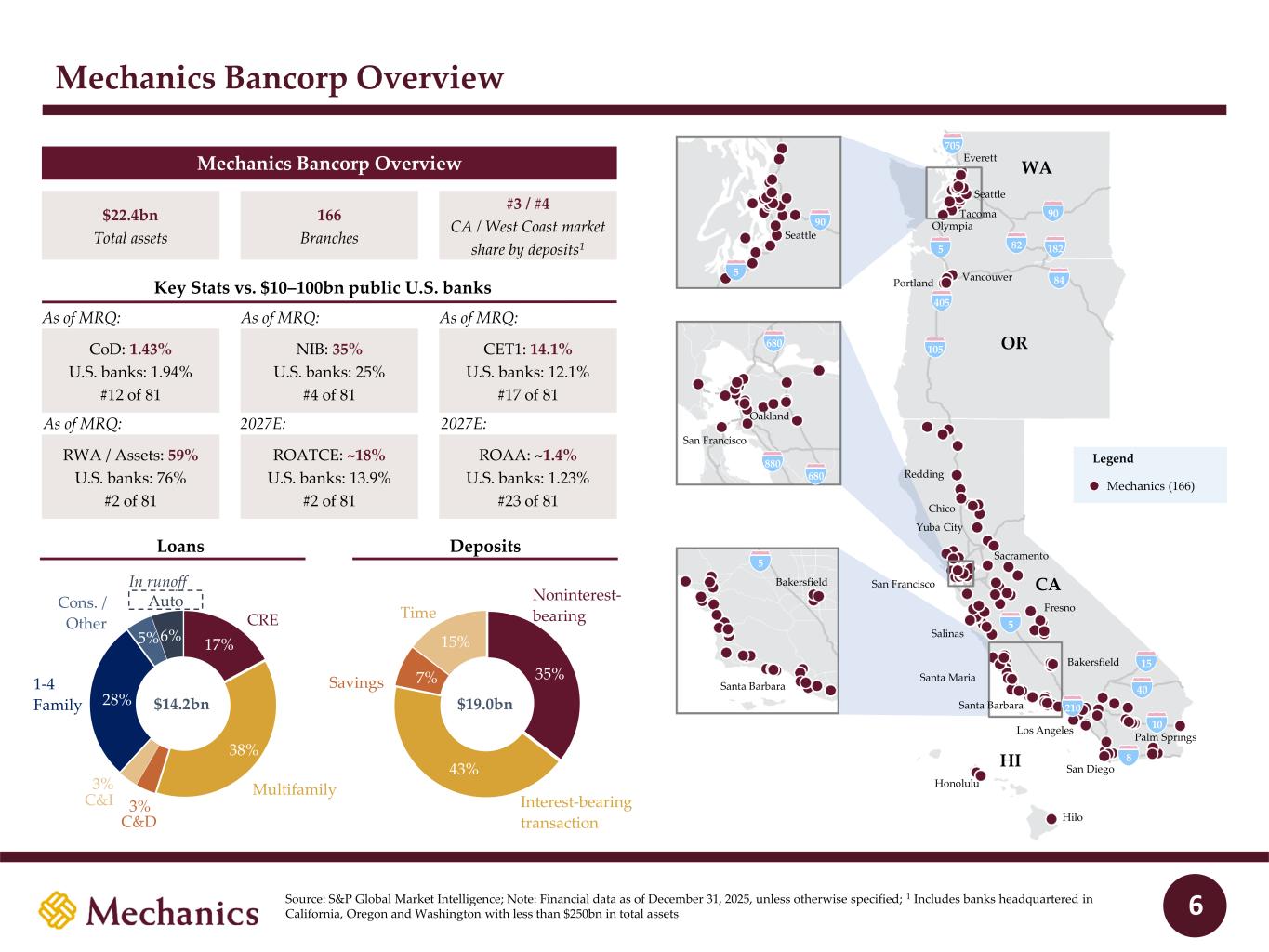 97 22 45 215 163 54 197 103 52 228 191 138 205 192 183 70 97 131 0 32 96 51 63 80 Key Stats vs. $10–100bn public U.S. banks Mechanics Bancorp Overview Source: S&P Global Market Intelligence; Note: Financial data as of December 31, 2025, unless otherwise specified; 1 Includes banks headquartered in California, Oregon and Washington with less than $250bn in total assets CoD: 1.43% U.S. banks: 1.94% #12 of 81 NIB: 35% U.S. banks: 25% #4 of 81 RWA / Assets: 59% U.S. banks: 76% #2 of 81 ROATCE: ~18% U.S. banks: 13.9% #2 of 81 As of MRQ: CET1: 14.1% U.S. banks: 12.1% #17 of 81 ROAA: ~1.4% U.S. banks: 1.23% #23 of 81 $22.4bn Total assets 166 Branches #3 / #4 CA / West Coast market share by deposits1 Mechanics Bancorp Overview 17% 38% 28% 5% 6% $14.2bn CRE C&I 1-4 Family Cons. / Other Auto 35% 43% 7% 15% $19.0bn Noninterest- bearing Interest-bearing transaction Savings Time Loans Multifamily C&D Deposits 3% 3% 6 In runoff As of MRQ: As of MRQ: As of MRQ: 2027E: 2027E: San Francisco Oakland 880 680 680 90 5 5 Santa Barbara Bakersfield CA OR WA 8 10 40 15 5 5 90 82 182 84 105 405 210 Palm Springs San Diego Los Angeles Santa Maria Santa Barbara Bakersfield Fresno Salinas San Francisco Sacramento Yuba City Chico Redding Seattle Seattle Everett Tacoma Olympia Vancouver Portland 705 Hilo Legend Mechanics (166) HI Honolulu