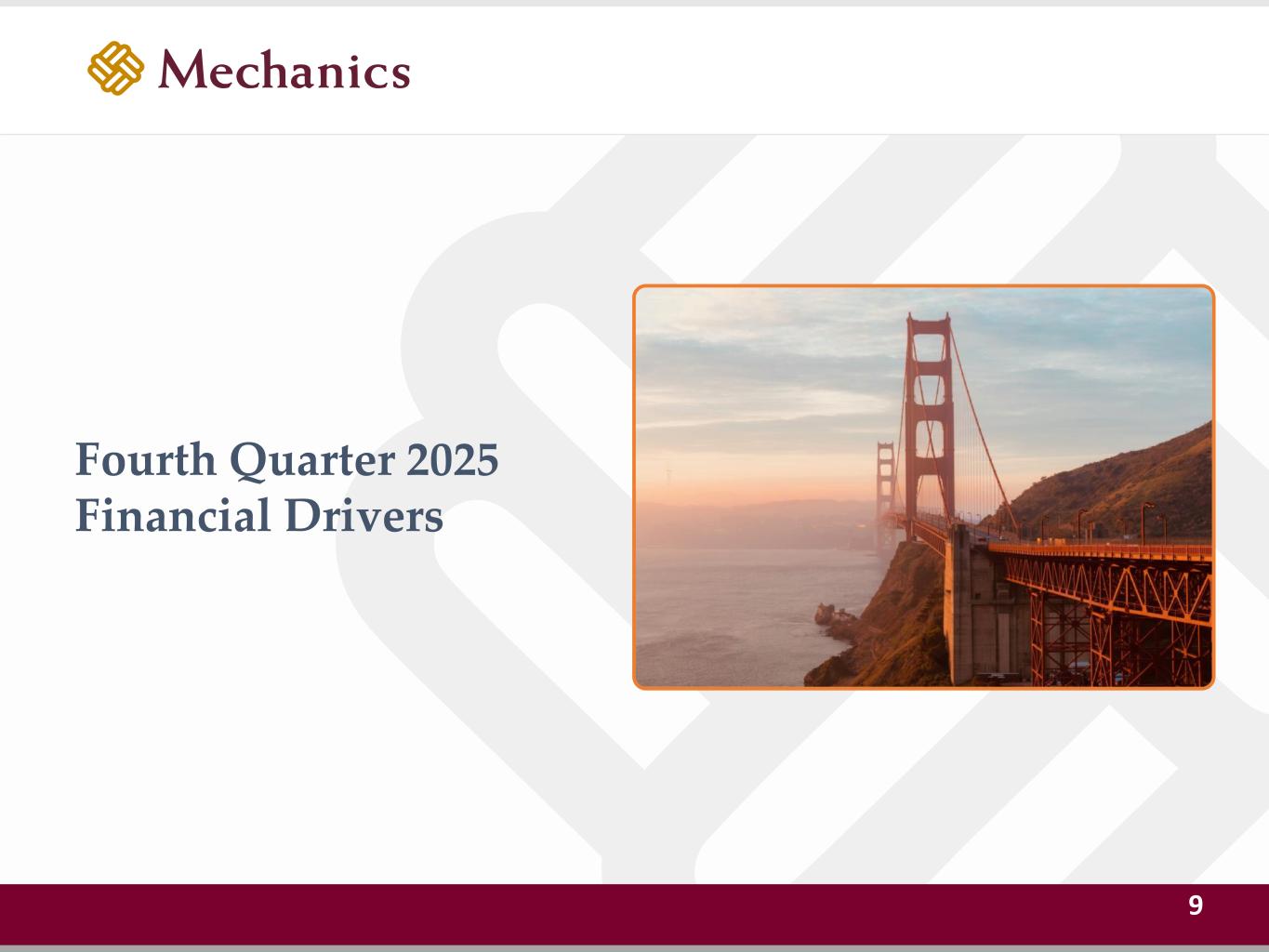 97 22 45 215 163 54 197 103 52 228 191 138 205 192 183 70 97 131 0 32 96 51 63 80 Premier community bank in attractive West Coast markets (#3 CA and #4 West Coast bank by deposits¹) Leading profitability (~18% 2027E ROATCE, ~1.4% 2027E ROAA) Simple and efficient business model – low-risk asset strategy powered by great deposits Core-funded franchise – no wholesale funding or brokered deposits Strongly capitalized and highly liquid balance sheet (~70% 2027E L/D, ~14% 2027E CET1) Capital efficient with substantial dividend yield Strong alignment between public investors and Ford Financial Fund (74% economic ownership) Experienced management team with strong operating and M&A track records Compelling Investment Thesis ✓ ✓ ✓ ✓ ✓ ✓ ✓ ✓ Note: Projections per Mechanics management; ¹ Includes banks headquartered in California, Oregon, and Washington with less than $250bn total assets 8