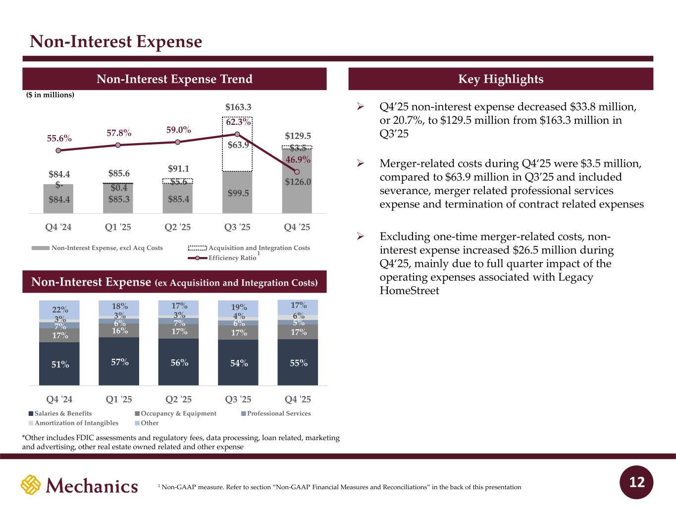 Non-Interest Income Non-Interest Income Trend Non-Interest Income Mix (ex Bargain Purchase Gain) Key Highlights 11 ($ in millions) ➢ Q4’25 non-interest income decreased $31.3 million, or 28.5%, to $78.5 million from $109.8 million in Q3’25 ➢ Q4’25 includes an adjustment to the bargain purchase gain recognized on the HomeStreet acquisition of $55.1 million as a result of writing up the intangible asset associated with the DUS business line ➢ Remaining increase was due to the full quarter impact of legacy HomeStreet’s non-interest income (gain on sale of loans, servicing income, service charges, etc.) ➢ Q3’25 included the initial bargain purchase gain recognized of $90.4 million $19.4 $23.4 $90.4 $55.1 $18.5 $15.0 $19.6 $109.8 $78.5 Q4 '24 Q1 '25 Q2 '25 Q3 '25 Q4 '25 Non-Interest Income Bargain Purchase Gain *Other includes income from bank-owned life insurance and other income 31% 37% 28% 30% 27% 19% 21% 16% 16% 15% 1% 1% 1% 4% 8% 17% 19% 15% 18% 18% 32% 22% 40% 32% 32% Q4 '24 Q1 '25 Q2 '25 Q3 '25 Q4 '25 Deposit Charges Trust Fees Servicing Income ATM Network Fees Other
