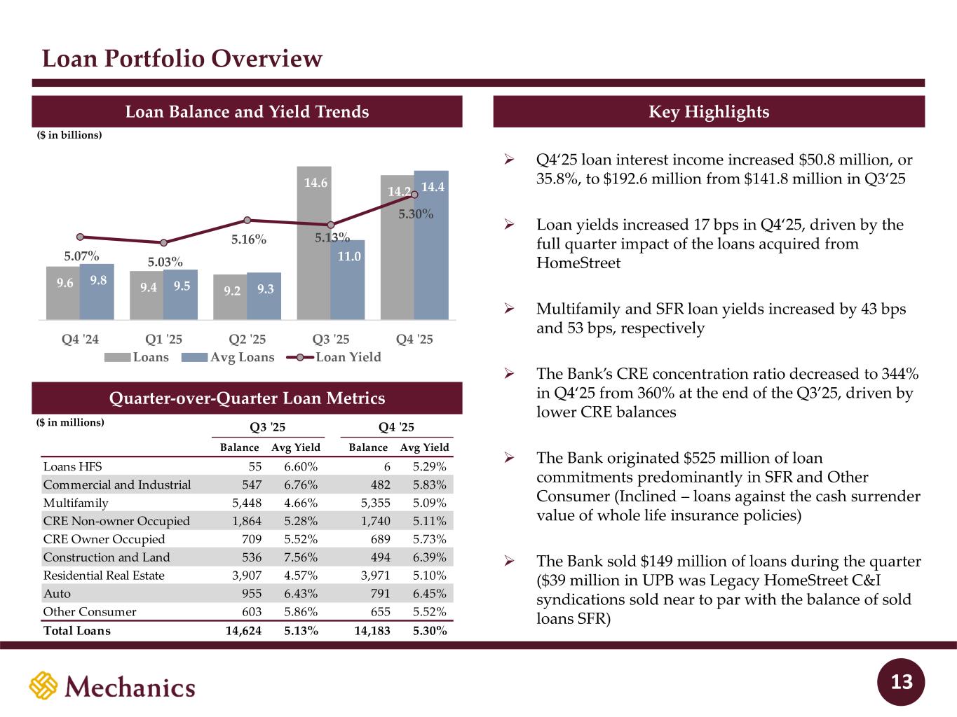 Non-Interest Expense Non-Interest Expense Trend Non-Interest Expense (ex Acquisition and Integration Costs) Key Highlights 12 ($ in millions) ➢ Q4’25 non-interest expense decreased $33.8 million, or 20.7%, to $129.5 million from $163.3 million in Q3’25 ➢ Merger-related costs during Q4‘25 were $3.5 million, compared to $63.9 million in Q3’25 and included severance, merger related professional services expense and termination of contract related expenses ➢ Excluding one-time merger-related costs, non- interest expense increased $26.5 million during Q4‘25, mainly due to full quarter impact of the operating expenses associated with Legacy HomeStreet 51% 57% 56% 54% 55% 17% 16% 17% 17% 17% 7% 6% 7% 6% 5% 3% 3% 3% 4% 6% 22% 18% 17% 19% 17% Q4 '24 Q1 '25 Q2 '25 Q3 '25 Q4 '25 Salaries & Benefits Occupancy & Equipment Professional Services Amortization of Intangibles Other *Other includes FDIC assessments and regulatory fees, data processing, loan related, marketing and advertising, other real estate owned related and other expense 1 Non-GAAP measure. Refer to section “Non-GAAP Financial Measures and Reconciliations” in the back of this presentation $84.4 $85.3 $85.4 $99.5 $126.0 $- $0.4 $5.6 $63.9 $3.5 $84.4 $85.6 $91.1 $163.3 $129.5 55.6% 57.8% 59.0% 62.3% 46.9% Q4 '24 Q1 '25 Q2 '25 Q3 '25 Q4 '25 Non-Interest Expense, excl Acq Costs Acquisition and Integration Costs Total NIE Efficiency Ratio 1