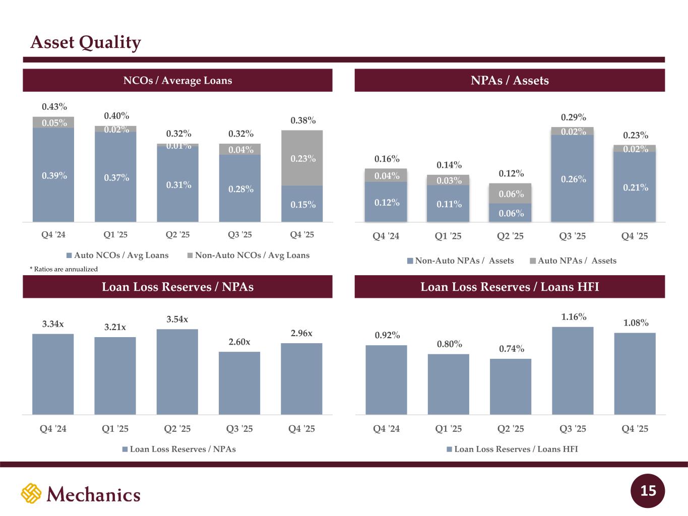 97 22 45 215 163 54 197 103 52 228 191 138 205 192 183 70 97 131 0 32 96 51 63 80 Granular, Low-Risk Commercial Lending with a Multifamily Focus ✓ Mechanics Bank’s commercial lending is highly granular and well-diversified across both collateral types and geography ✓ Focus on multifamily lending, with an emphasis on Southern California (53% of total multifamily) ▪ Average multifamily loan size of $3.9 million, with average LTV¹ of 55% and average DCR² of 1.48x ✓ Modest CRE concentrations in retail and office ▪ Average size of CRE retail and office loans are $3.2 and $2.1 million, respectively ▪ Average CRE retail LTV¹ of 48% and DCR² of 1.79x; average CRE office LTV¹ of 51% and DCR² of 1.70x ✓ Total CRE3 of ~$7.8bn, with 69% in lower risk-profile multifamily loans ▪ CRE concentration of 344% as of December 31, 2025; 107% ex-multifamily ▪ Seven CRE office loans totaling $36 million in central business districts of Los Angeles, Oakland, San Francisco and Seattle ✓ Realized a ~$7mm net charge off on a Legacy HomeStreet syndicated C&I credit in Q4’25 (identified during due diligence and fully reserved for) ▪ Sold ~$39mm in UPB ($70mm in commitments) of Legacy HomeStreet C&I syndications at par in Q4’25 ▪ Will continue to reduce HomeStreet syndicated loans over time (~$142mm in UPB at 9/30/25, ~$76mm at 12/31/25) CRE composition: Q4’25C&I breakdown: Q4’25 CRE geography: Q4’25 14 Multifamily, 69% Retail, 10% Office, 9% Industrial, 7% Special Purpose, 3% Hotel, 1% Mixed use, 1% ~$7.8bn Note: Financial data as of December 31, 2025; ¹ LTV defined as current loan balance divided by most recent appraisal; CRE LTV does not include multifamily; ² DCRs based on most recent review (origination in instances where loan is below review threshold); CRE DCRs exclude owner-user loans; 3 Total CRE excludes construction and land development Los Angeles, 31% Central Valley, 5% East Bay, 6% Central Coast, 7% San Diego, 5% Inland Empire, 7% South Bay, 5% North Bay, 3% Sacramento, 2% San Francisco, 1% Other State, 6% Orange, 4% Northern California, 2% ~$7.8bn Washington, 11% Manufacturing, 4% Utilities, 7% Real Estate Activities, 14% Retail, 8% Financials Non-Bank, 2% Entertainment / Recreation, 7%Commercial Services, 7% Construction / Contractor, 19% Healthcare / Dental, 14% Other, 18% ~$0.5bn Oregon, 5%
