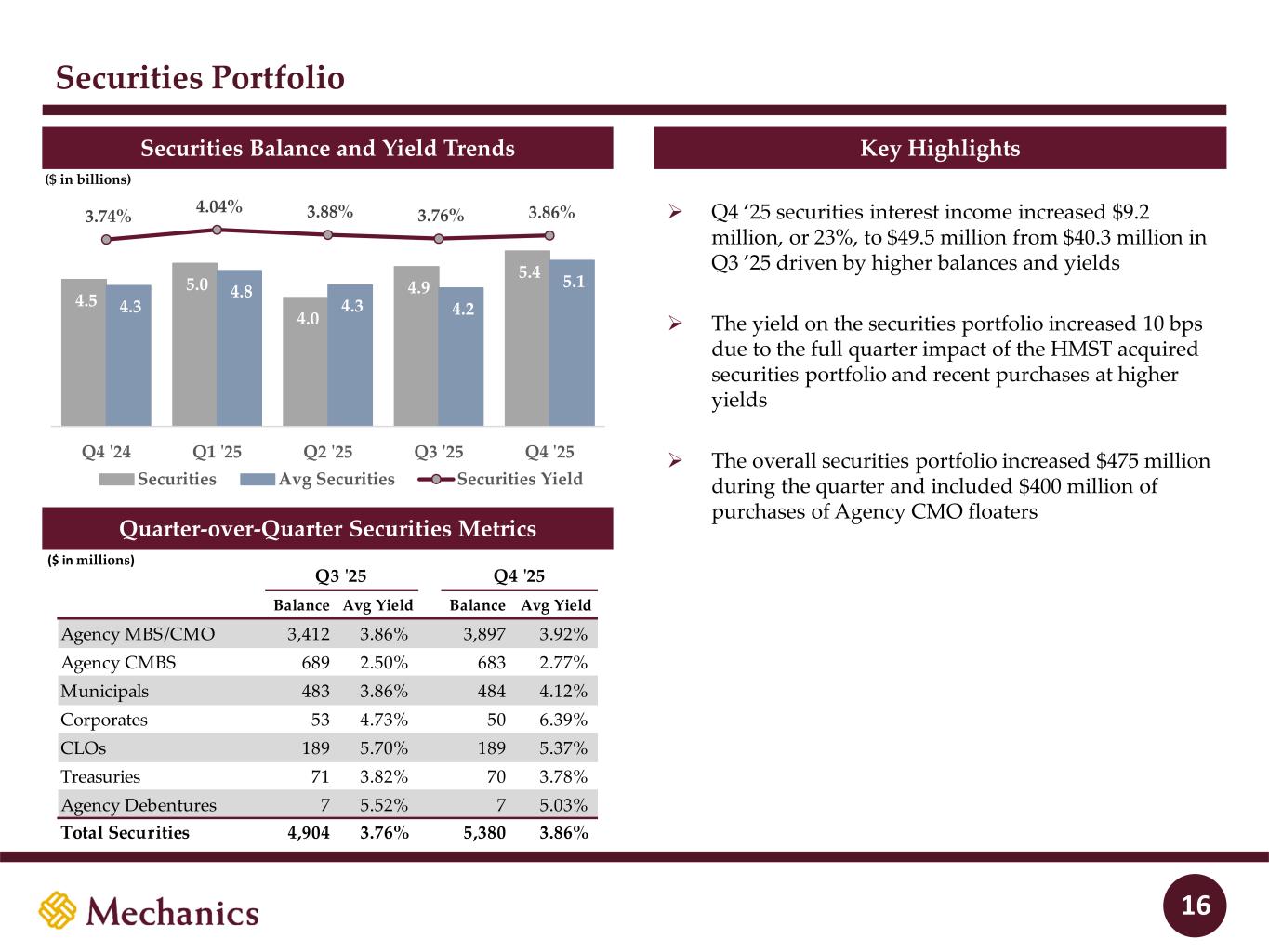 Asset Quality NCOs / Average Loans Loan Loss Reserves / NPAs NPAs / Assets Loan Loss Reserves / Loans HFI 15 * Ratios are annualized 0.39% 0.37% 0.31% 0.28% 0.15% 0.05% 0.02% 0.01% 0.04% 0.23% 0.43% 0.40% 0.32% 0.32% 0.38% Q4 '24 Q1 '25 Q2 '25 Q3 '25 Q4 '25 Auto NCOs / Avg Loans Non-Auto NCOs / Avg Loans 0.12% 0.11% 0.06% 0.26% 0.21% 0.04% 0.03% 0.06% 0.02% 0.02% 0.16% 0.14% 0.12% 0.29% 0.23% Q4 '24 Q1 '25 Q2 '25 Q3 '25 Q4 '25 Non-Auto NPAs / Assets Auto NPAs / Assets 3.34x 3.21x 3.54x 2.60x 2.96x Q4 '24 Q1 '25 Q2 '25 Q3 '25 Q4 '25 Loan Loss Reserves / NPAs 0.92% 0.80% 0.74% 1.16% 1.08% Q4 '24 Q1 '25 Q2 '25 Q3 '25 Q4 '25 Loan Loss Reserves / Loans HFI