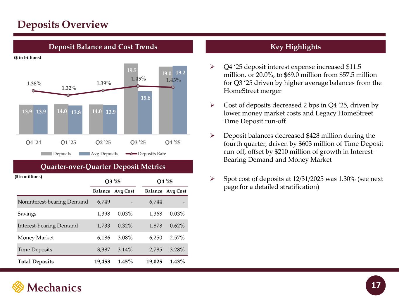 Securities Portfolio Securities Balance and Yield Trends Quarter-over-Quarter Loan Metrics Key Highlights Quarte -over-Quarte Securities Metrics 16 4.5 5.0 4.0 4.9 5.4 4.3 4.8 4.3 4.2 5.1 3.74% 4.04% 3.88% 3.76% 3.86% Q4 '24 Q1 '25 Q2 '25 Q3 '25 Q4 '25 Securities Avg Securities Securities Yield ($ in billions) ($ in millions) Q3 '25 Q4 '25 Balance Avg Yield Balance Avg Yield Agency MBS/CMO 3,412 3.86% 3,897 3.92% Agency CMBS 689 2.50% 683 2.77% Municipals 483 3.86% 484 4.12% Corporates 53 4.73% 50 6.39% CLOs 189 5.70% 189 5.37% Treasuries 71 3.82% 70 3.78% Agency Debentures 7 5.52% 7 5.03% Total Securities 4,904 3.76% 5,380 3.86% ➢ Q4 ‘25 securities interest income increased $9.2 million, or 23%, to $49.5 million from $40.3 million in Q3 ’25 driven by higher balances and yields ➢ The yield on the securities portfolio increased 10 bps due to the full quarter impact of the HMST acquired securities portfolio and recent purchases at higher yields ➢ The overall securities portfolio increased $475 million during the quarter and included $400 million of purchases of Agency CMO floaters
