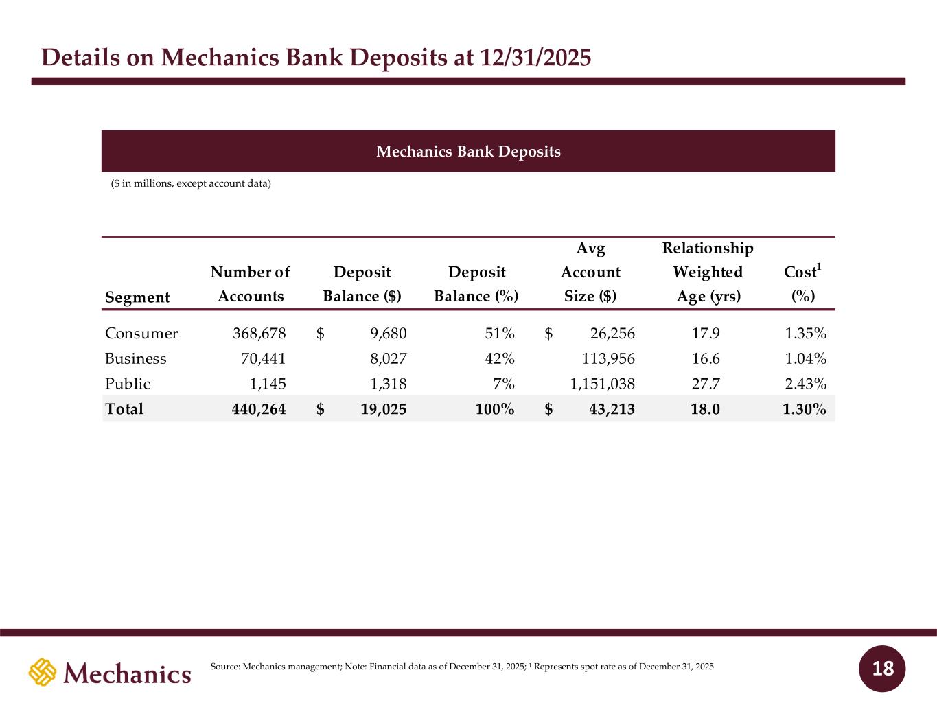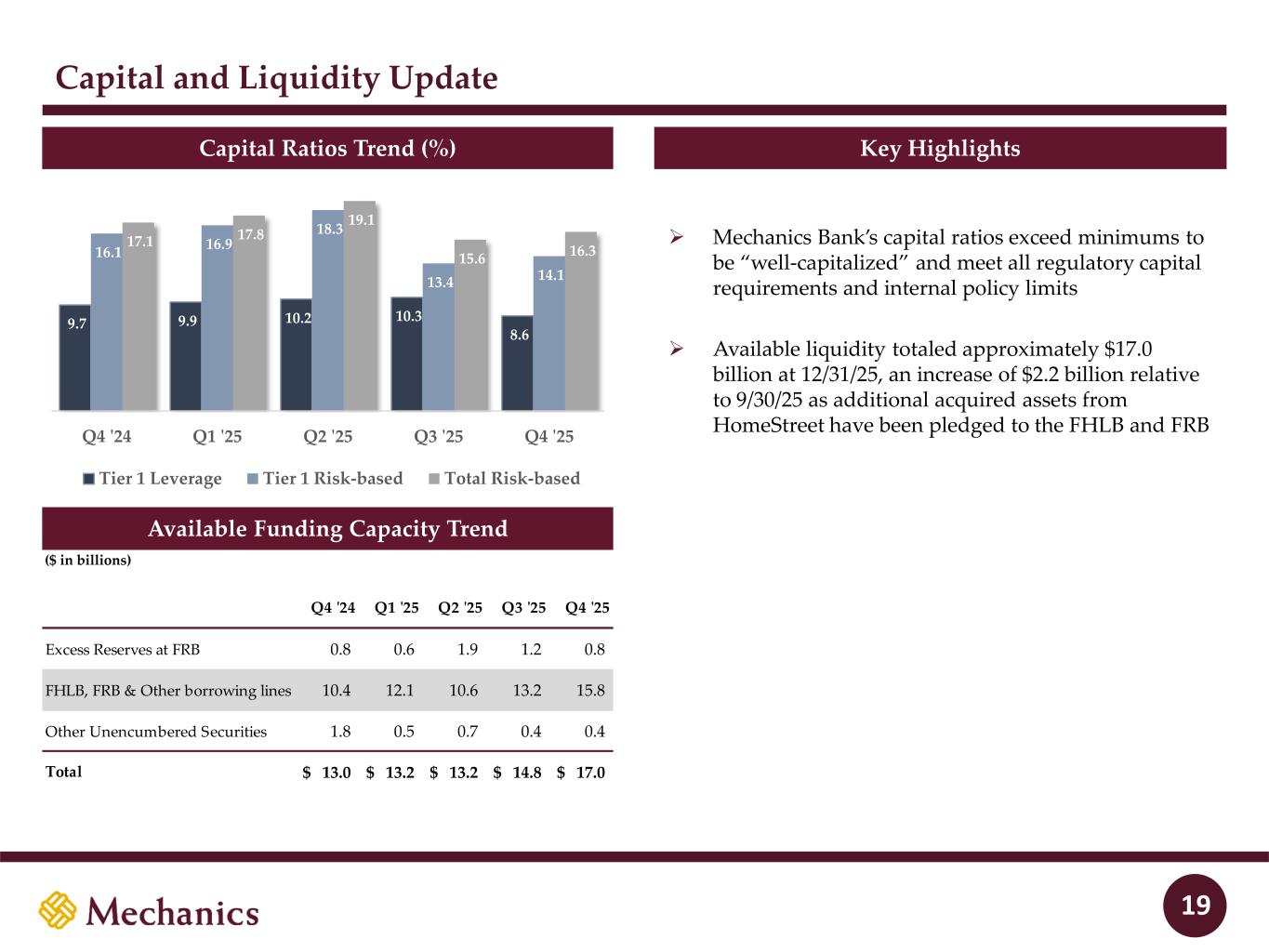 97 22 45 215 163 54 197 103 52 228 191 138 205 192 183 70 97 131 0 32 96 51 63 80 Details on Mechanics Bank Deposits at 12/31/2025 18Source: Mechanics management; Note: Financial data as of December 31, 2025; ¹ Represents spot rate as of December 31, 2025 Mechanics Bank Deposits ($ in millions, except account data) Segment Number of Accounts Deposit Balance ($) Deposit Balance (%) Avg Account Size ($) Relationship Weighted Age (yrs) Cost1 (%) Consumer 368,678 9,680$ 51% 26,256$ 17.9 1.35% Business 70,441 8,027 42% 113,956 16.6 1.04% Public 1,145 1,318 7% 1,151,038 27.7 2.43% Total 440,264 19,025$ 100% 43,213$ 18.0 1.30%