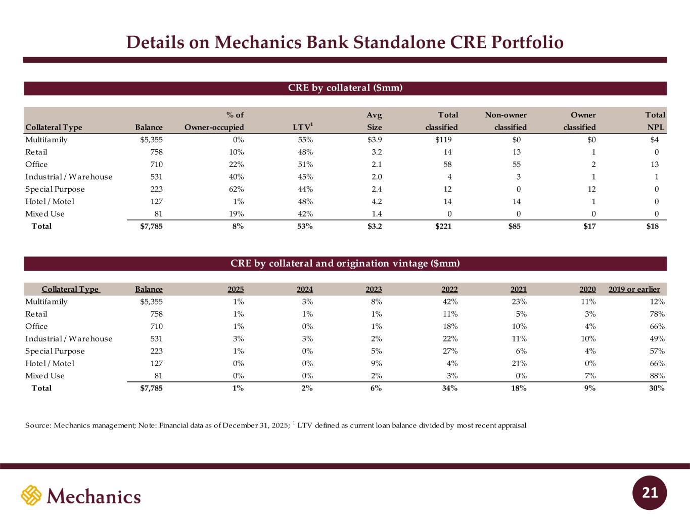 97 22 45 215 163 54 197 103 52 228 191 138 205 192 183 70 97 131 0 32 96 51 63 80 Details on Mechanics Bank Standalone CRE Portfolio (cont’d) 22 Collateral Type Multifamily Retail Office Industrial / Warehouse Special Purpose Hotel / Motel Mixed Use Total Collateral Type Multifamily Retail Office Industrial Special Purpose Hotel/Motel Mixed Use Total Greater than $20MM $719 $21 $45 $20 $41 $0 $0 $846 $10MM - $20MM 1,337 208 189 88 39 49 0 1,910 $5MM - $10MM 1,196 239 184 124 60 49 28 1,880 $1MM - $5MM 1,977 254 217 242 63 26 38 2,817 Less than $1MM 126 36 75 57 20 3 15 332 Total $5,355 $758 $710 $531 $223 $127 $81 $7,785 Count 1,379 238 338 267 94 30 60 2,406 Average size $3.9 $3.2 $2.1 $2.0 $2.4 $4.2 $1.4 $3.2 Source: Mechanics management; Note: Financial data as of December 31, 2025 5231 88 CRE by collateral and reset/maturity ($mm) 19% 52% 43% 36% $953 78 59 101 243 313 93 75% 48% 28% 37 $888 8 2 $1,253 CRE by loan size and collateral ($mm) Balance Balance maturing next 24 months Rate resets next 24 months Maturing & rate reset % of loans $5,355 758 710 531 223 127 81 $7,785 $83 37%