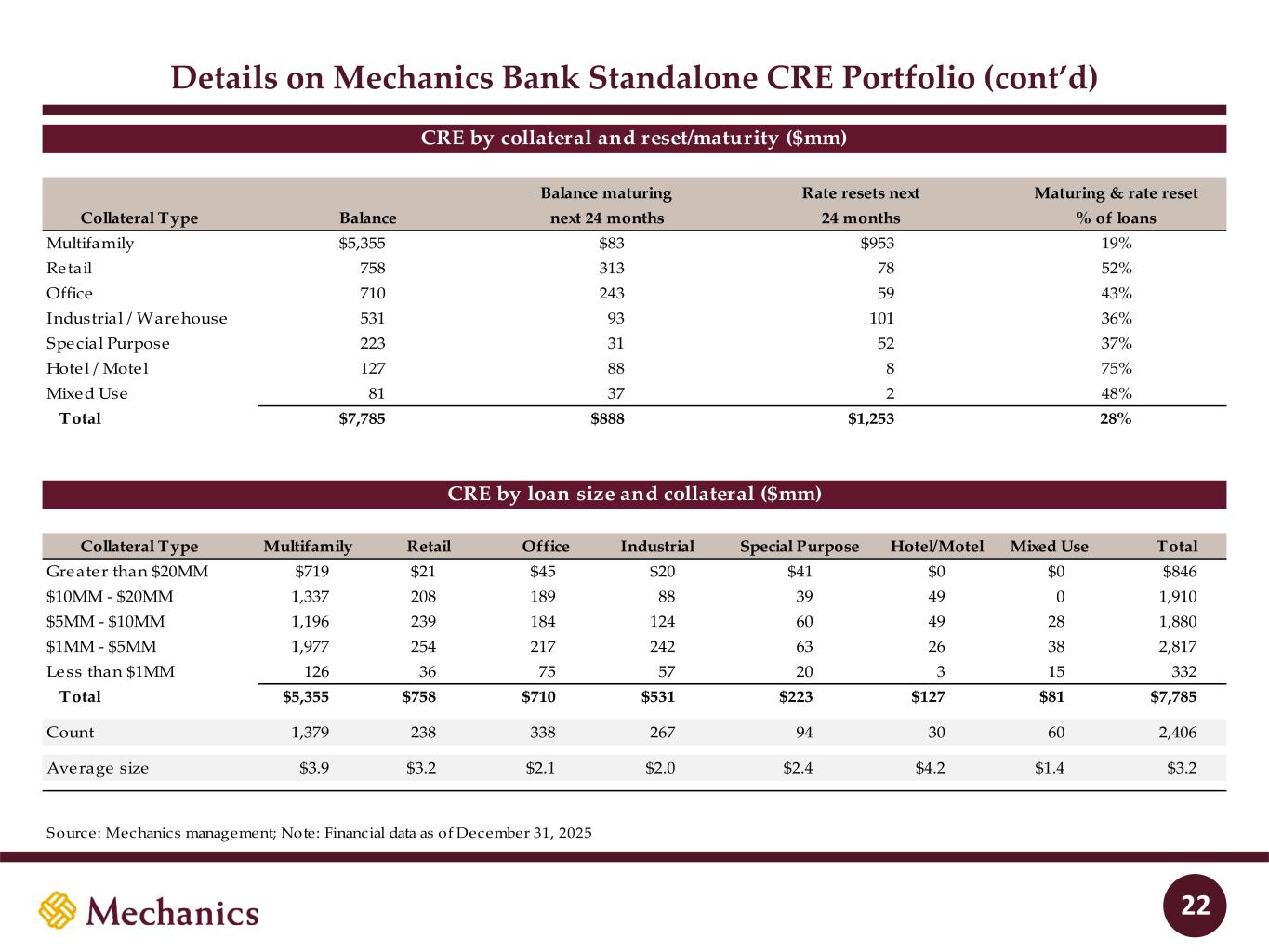 97 22 45 215 163 54 197 103 52 228 191 138 205 192 183 70 97 131 0 32 96 51 63 80 Details on Mechanics Bank Standalone CRE Portfolio 21 Collateral Type Balance % of Owner-occupied LTV1 Avg Size Total classified Non-owner classified Owner classified Total NPL Multifamily $5,355 0% 55% $3.9 $119 $0 $0 $4 Retail 758 10% 48% 3.2 14 13 1 0 Office 710 22% 51% 2.1 58 55 2 13 Industrial / Warehouse 531 40% 45% 2.0 4 3 1 1 Special Purpose 223 62% 44% 2.4 12 0 12 0 Hotel / Motel 127 1% 48% 4.2 14 14 1 0 Mixed Use 81 19% 42% 1.4 0 0 0 0 Total $7,785 8% 53% $3.2 $221 $85 $17 $18 Collateral Type Balance 2025 2024 2023 2022 2021 2020 2019 or earlier Multifamily $5,355 1% 3% 8% 42% 23% 11% 12% Retail 758 1% 1% 1% 11% 5% 3% 78% Office 710 1% 0% 1% 18% 10% 4% 66% Industrial / Warehouse 531 3% 3% 2% 22% 11% 10% 49% Special Purpose 223 1% 0% 5% 27% 6% 4% 57% Hotel / Motel 127 0% 0% 9% 4% 21% 0% 66% Mixed Use 81 0% 0% 2% 3% 0% 7% 88% Total $7,785 1% 2% 6% 34% 18% 9% 30% CRE by collateral ($mm) CRE by collateral and origination vintage ($mm) Source: Mechanics management; Note: Financial data as of December 31, 2025; 1 LTV defined as current loan balance divided by most recent appraisal