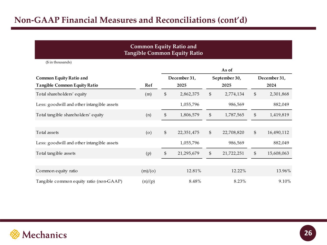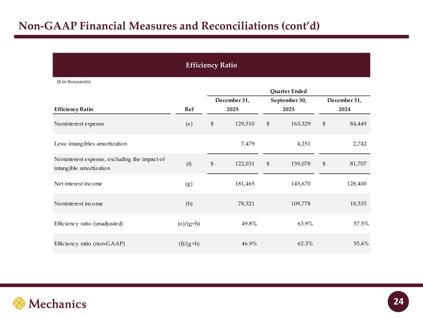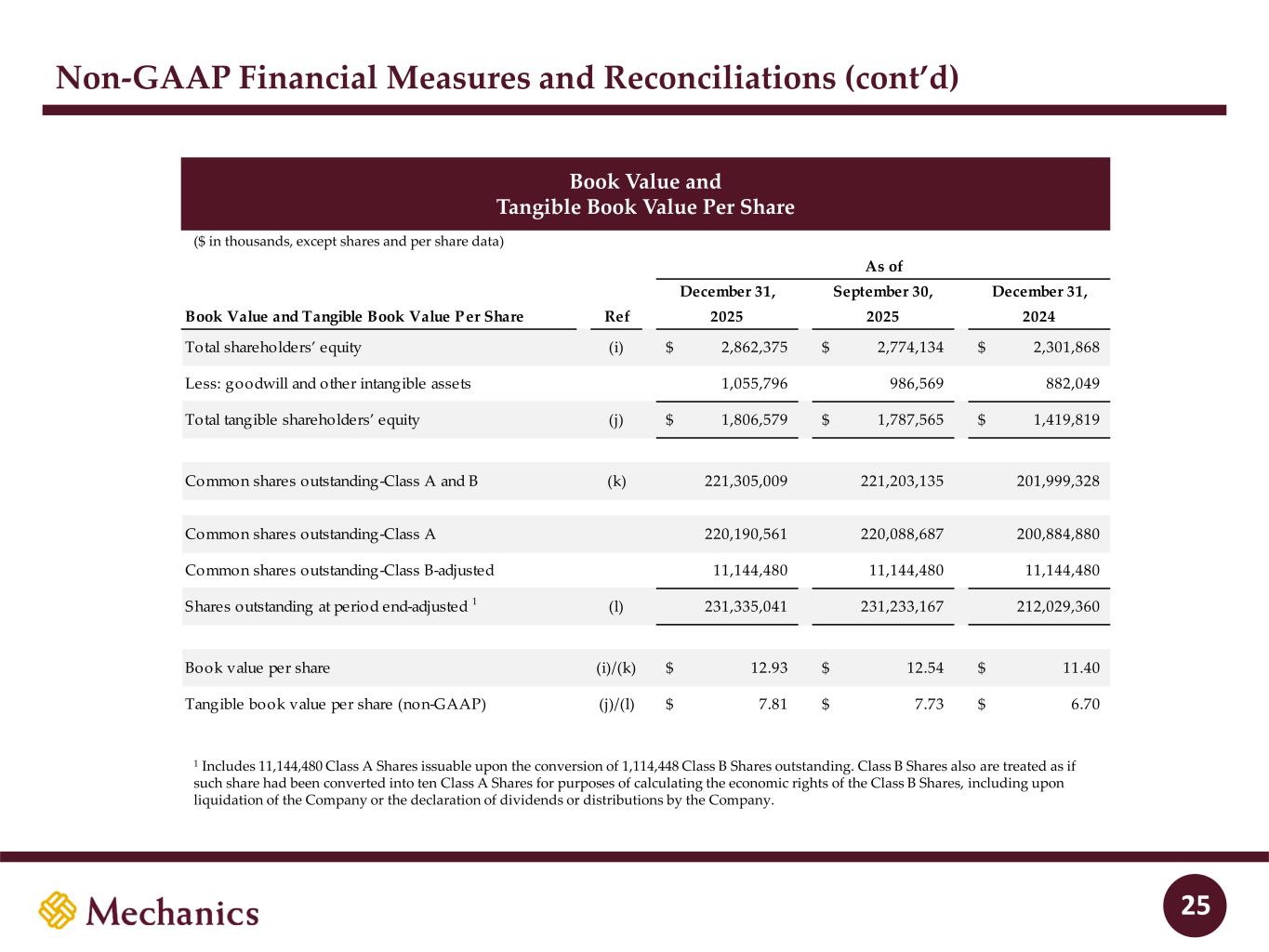 97 22 45 215 163 54 197 103 52 228 191 138 205 192 183 70 97 131 0 32 96 51 63 80 Non-GAAP Financial Measures and Reconciliations (cont’d) Efficiency Ratio 24 ($ in thousands) December 31, September 30, December 31, Efficiency Ratio Ref 2025 2025 2024 Noninterest expense (e) 129,510$ 163,329$ 84,449$ Less: intangibles amortization 7,479 4,251 2,742 Noninterest expense, excluding the impact of intangible amortization (f) 122,031$ 159,078$ 81,707$ Net interest income (g) 181,465 145,670 128,400 Noninterest income (h) 78,521 109,778 18,535 Efficiency ratio (unadjusted) (e)/(g+h) 49.8% 63.9% 57.5% Efficiency ratio (non-GAAP) (f)/(g+h) 46.9% 62.3% 55.6% Quarter Ended