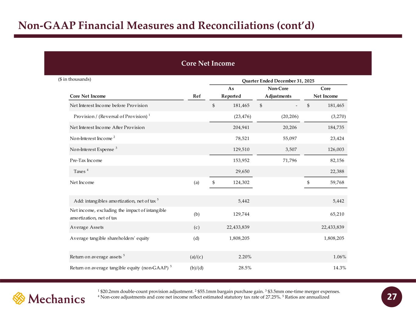 97 22 45 215 163 54 197 103 52 228 191 138 205 192 183 70 97 131 0 32 96 51 63 80 Non-GAAP Financial Measures and Reconciliations (cont’d) Common Equity Ratio and Tangible Common Equity Ratio 26 ($ in thousands) As of As of Common Equity Ratio and December 31, September 30, December 31, Tangible Common Equity Ratio Ref 2025 2025 2024 Total shareholders’ equity (m) 2,862,375$ 2,774,134$ 2,301,868$ Less: goodwill and other intangible assets 1,055,796 986,569 882,049 Total tangible shareholders’ equity (n) 1,806,579$ 1,787,565$ 1,419,819$ Total assets (o) 22,351,475$ 22,708,820$ 16,490,112$ Less: goodwill and other intangible assets 1,055,796 986,569 882,049 Total tangible assets (p) 21,295,679$ 21,722,251$ 15,608,063$ Common equity ratio (m)/(o) 12.81% 12.22% 13.96% Tangible common equity ratio (non-GAAP) (n)/(p) 8.48% 8.23% 9.10%