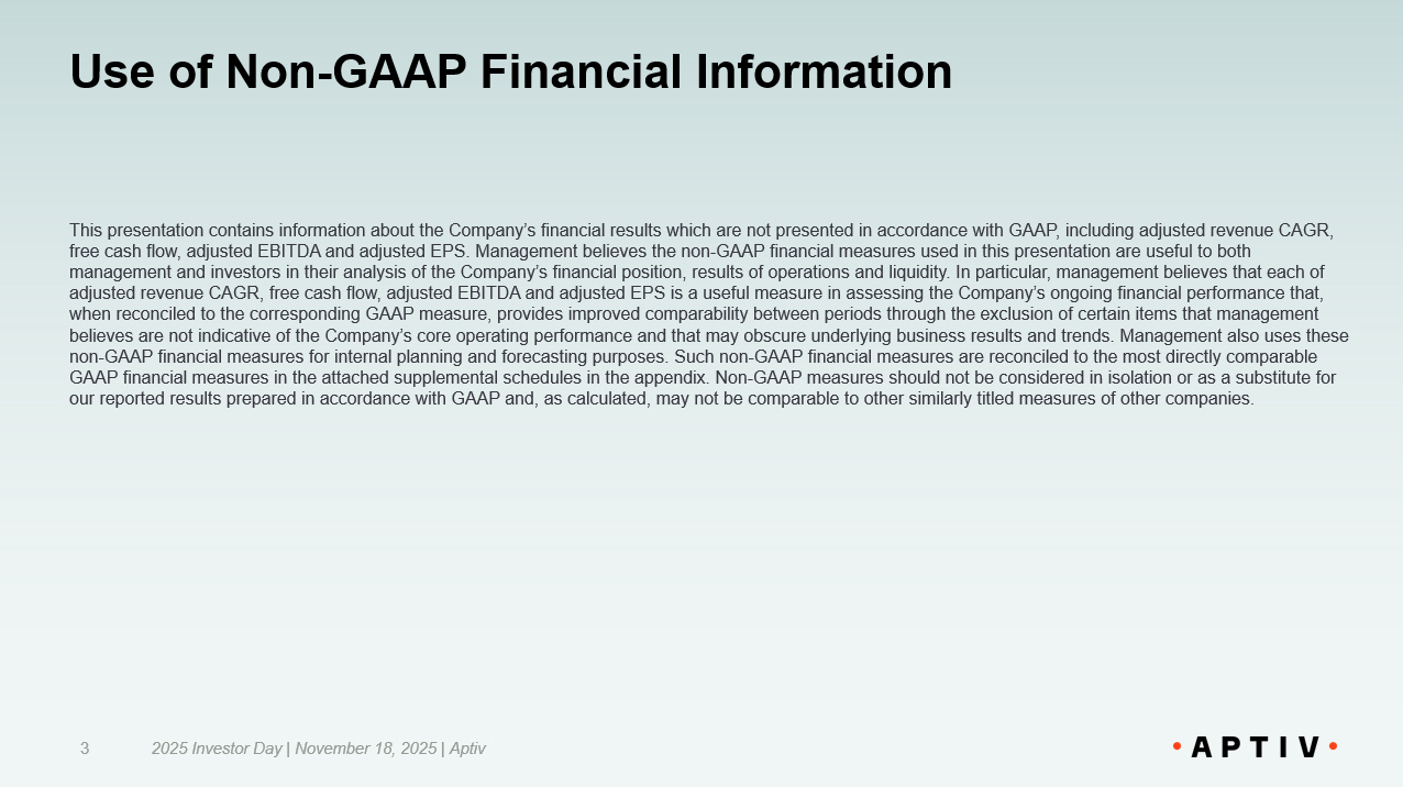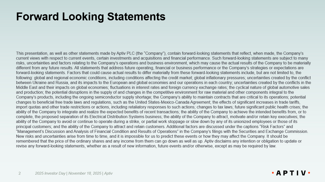 Forward Looking Statements This presentation, as well as other statements made by Aptiv PLC (the “Company”), contain forward - looking statements that reflec t, when made, the Company’s current views with respect to current events, certain investments and acquisitions and financial performance. Such forward - looki ng statements are subject to many risks, uncertainties and factors relating to the Company’s operations and business environment, which may cause the actual re sul ts of the Company to be materially different from any future results. All statements that address future operating, financial or business performance or the Com pan y’s strategies or expectations are forward - looking statements. Factors that could cause actual results to differ materially from these forward - looking statements i nclude, but are not limited to, the following: global and regional economic conditions, including conditions affecting the credit market; global inflationary pre ssu res; uncertainties created by the conflict between Ukraine and Russia, and its impacts to the European and global economies and our operations in each country; uncertai nti es created by the conflicts in the Middle East and their impacts on global economies; fluctuations in interest rates and foreign currency exchange rates; the cy cli cal nature of global automotive sales and production; the potential disruptions in the supply of and changes in the competitive environment for raw material and ot her components integral to the Company’s products, including the ongoing semiconductor supply shortage; the Company’s ability to maintain contracts that are cr itical to its operations; potential changes to beneficial free trade laws and regulations, such as the United States - Mexico - Canada Agreement; the effects of signifi cant increases in trade tariffs, import quotas and other trade restrictions or actions, including retaliatory responses to such actions; changes to tax laws; fut ure significant public health crises; the ability of the Company to integrate and realize the expected benefits of recent transactions; the ability of the Company to a chi eve the intended benefits from, or to complete, the proposed separation of its Electrical Distribution Systems business; the ability of the Company to attract, mot iva te and/or retain key executives; the ability of the Company to avoid or continue to operate during a strike, or partial work stoppage or slow down by any of its u nio nized employees or those of its principal customers; and the ability of the Company to attract and retain customers. Additional factors are discussed under t he captions “Risk Factors” and “Management’s Discussion and Analysis of Financial Condition and Results of Operations” in the Company’s filings with the Sec uri ties and Exchange Commission. New risks and uncertainties arise from time to time, and it is impossible for us to predict these events or how they may affe ct the Company. It should be remembered that the price of the ordinary shares and any income from them can go down as well as up. Aptiv disclaims any inte nti on or obligation to update or revise any forward - looking statements, whether as a result of new information, future events and/or otherwise, except as may be required by law. 2025 Investor Day | November 18, 2025 | Aptiv 2