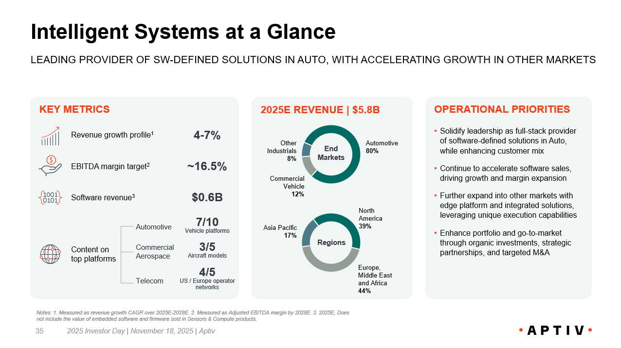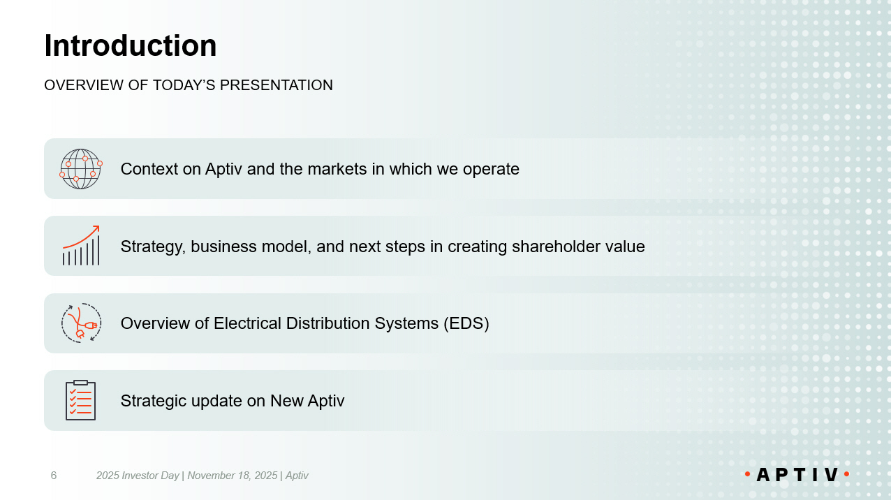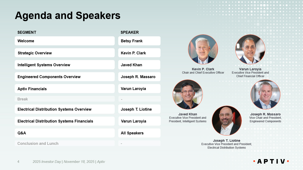 Agenda and Speakers Betsy Frank SEGMENT SPEAKER Javed Khan Joseph R. Massaro Varun Laroyia - Kevin P. Clark Joseph T. Liotine Varun Laroyia All Speakers Kevin P. Clark Chair and Chief Executive Officer Varun Laroyia Executive Vice President and Chief Financial Officer Joseph R. Massaro Vice Chair and President, Engineered Components Javed Khan Executive Vice President and President, Intelligent Systems Jose ph T. Liotine Executive Vice President and President, Electrical Distribution Systems - Welcome Strategic Overview Intelligent Systems O verview Engineered Components O verview Aptiv Financials Break Electrical Distribution Systems Overview Electrical Distribution Systems Financials Q&A Conclusion and Lunch 2025 Investor Day | November 18, 2025 | Aptiv 4