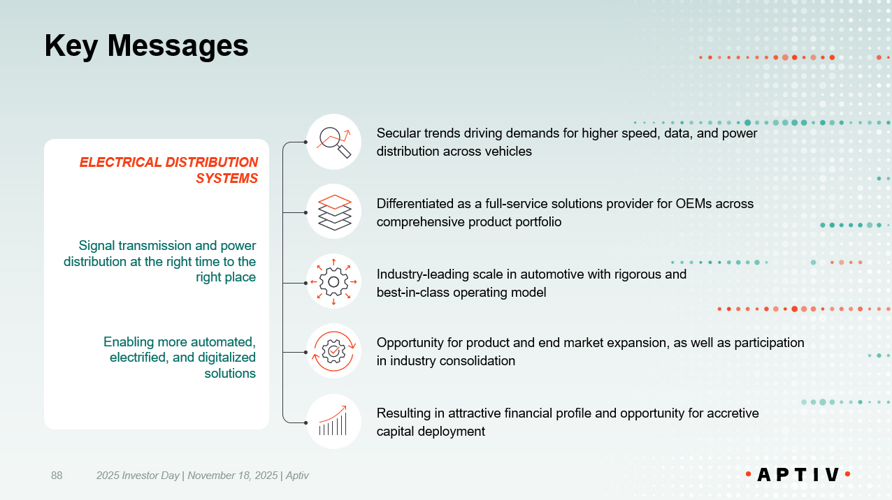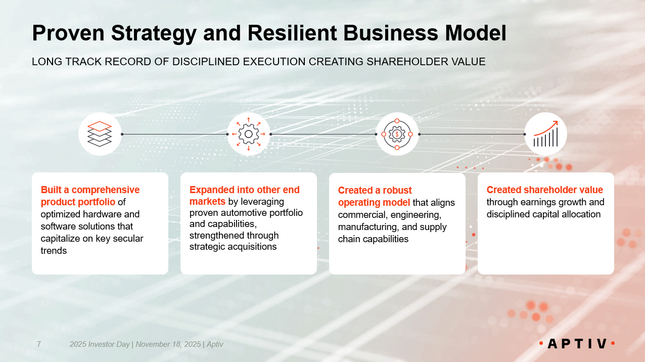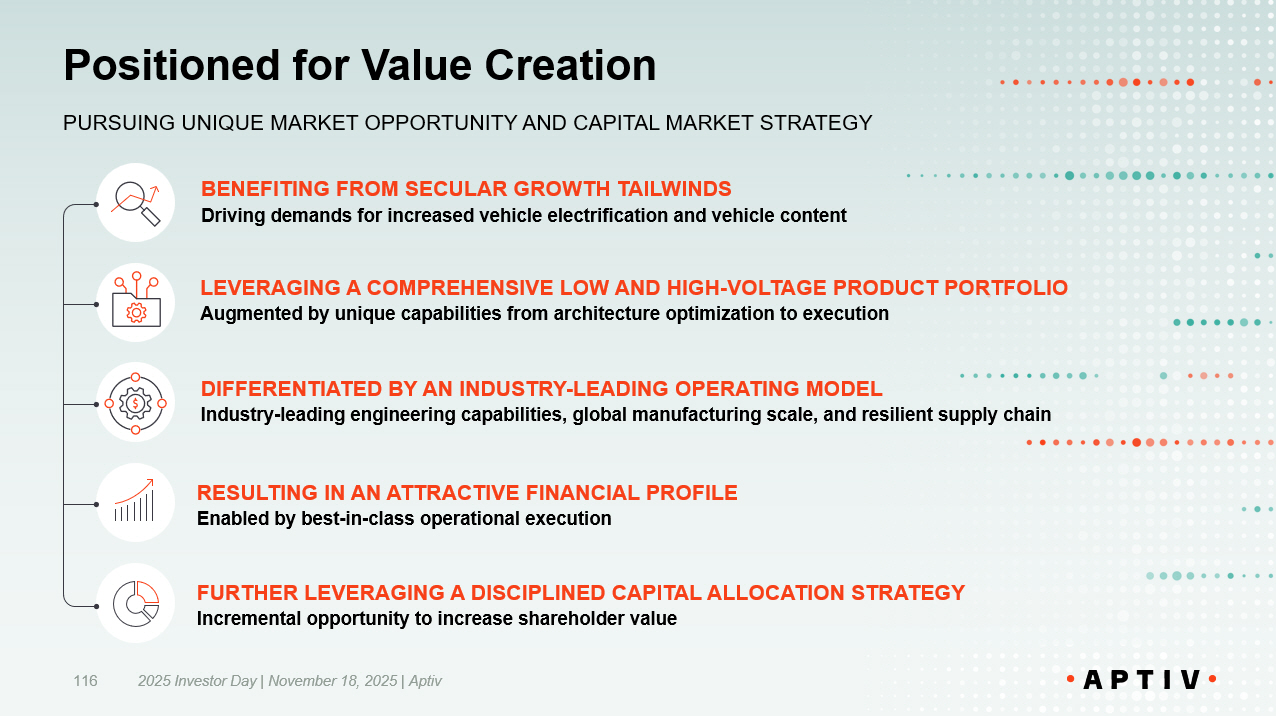 2025 Investor Day | November 18, 2025 | Aptiv 116 FURTHER LEVERAGING A DISCIPLINED CAPITAL ALLOCATION STRATEGY Incremental opportunity to increase shareholder value RESULTING IN AN ATTRACTIVE FINANCIAL PROFILE Enabled by best - in - class operational execution Positioned for Value Creation PURSUING UNIQUE MARKET OPPORTUNITY AND CAPITAL MARKET STRATEGY BENEFITING FROM SECULAR GROWTH TAILWINDS Driving demands for increased vehicle electrification and vehicle content LEVERAGING A COMPREHENSIVE LOW AND HIGH - VOLTAGE PRODUCT PORTFOLIO Augmented by unique capabilities from architecture optimization to execution DIFFERENTIATED BY AN INDUSTRY - LEADING OPERATING MODEL Industry - leading engineering capabilities, global manufacturing scale, and resilient supply chain