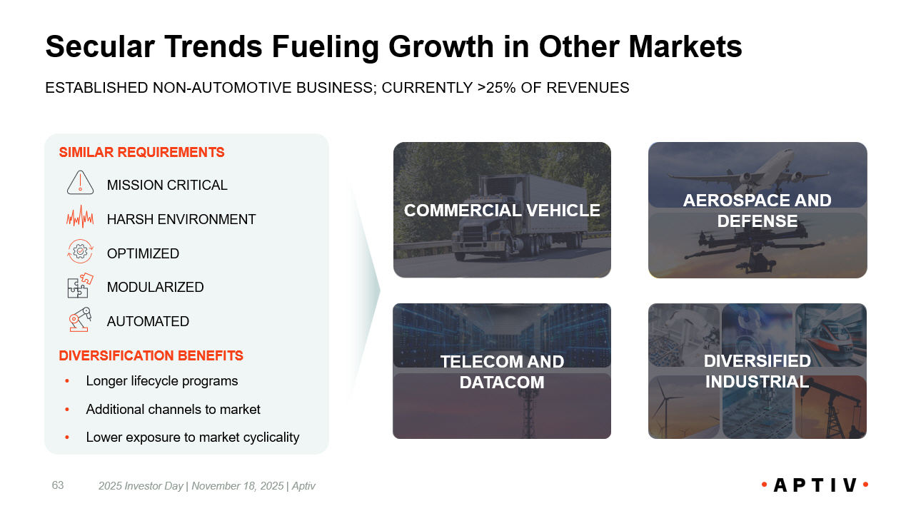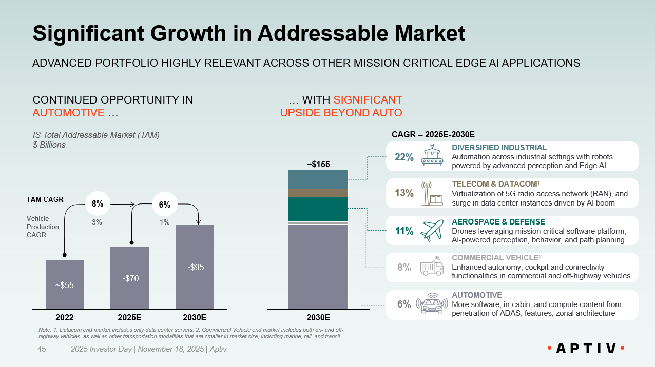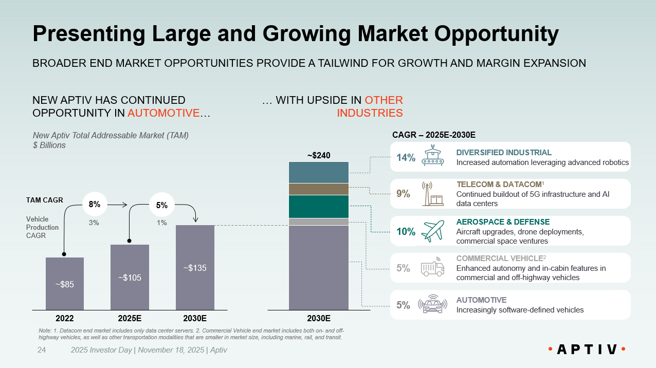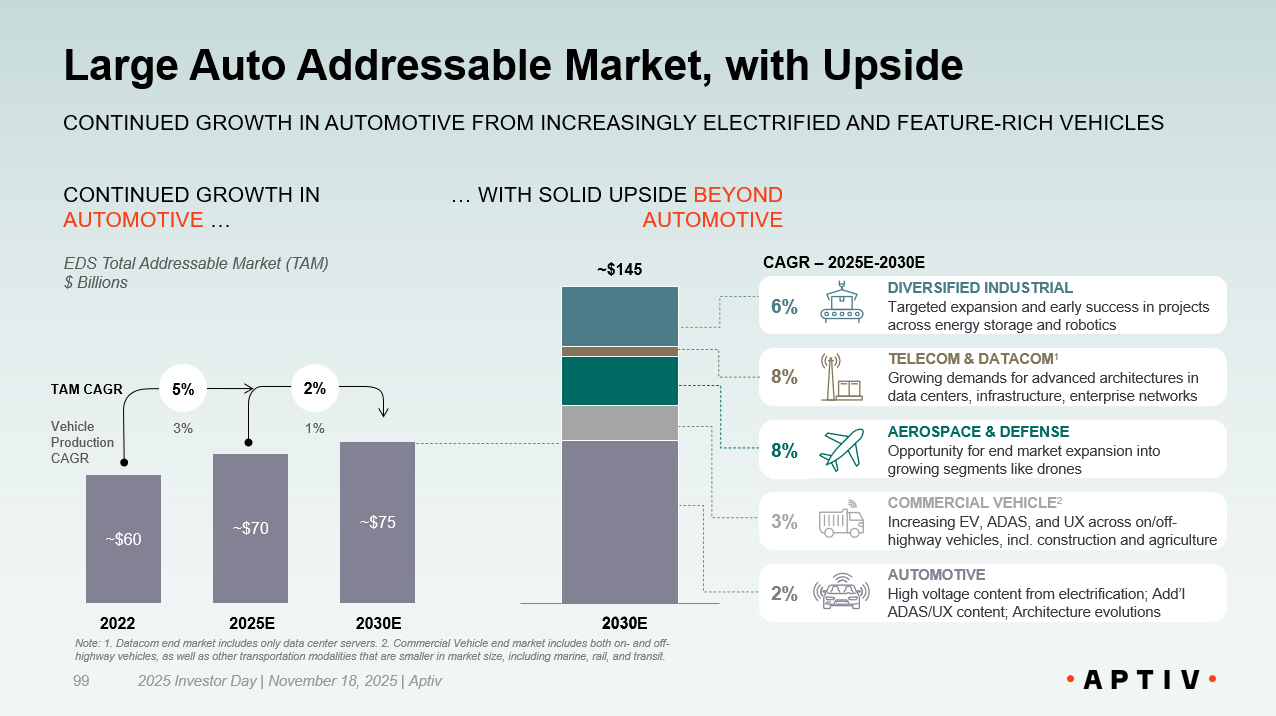 Presenting Large and Growing Market Opportunity 2025 Investor Day | November 18, 2025 | Aptiv 24 BROADER END MARKET OPPORTUNITIES PROVIDE A TAILWIND FOR GROWTH AND MARGIN EXPANSION New Aptiv Total Addressable Market (TAM) $ Billions AEROSPACE & DEFENSE Aircraft upgrades, drone deployments, commercial space ventures AUTOMOTIVE Increasingly software - defined vehicles 2030 E ~$240 TELECOM & DATACOM 1 Continued buildout of 5G infrastructure and AI data centers DIVERSIFIED INDUSTRIAL Increased automation leveraging advanced robotics COMMERCIAL VEHICLE 2 Enhanced autonomy and in - cabin features in commercial and off - highway vehicles NEW APTIV HAS CONTINUED OPPORTUNITY IN AUTOMOTIVE … 5% 10% 9% 14% CAGR – 2025E - 2030E 5% ~$85 2022 ~$105 2025 E ~$135 2030 E 5% 8% 3% 1% TAM CAGR Vehicle Production CAGR Note: 1. Datacom end market includes only data center servers. 2. Commercial Vehicle end market includes both on - and off - highway vehicles, as well as other transportation modalities that are smaller in market size, including marine, rail, and tra nsi t. … WITH UPSIDE IN OTHER INDUSTRIES