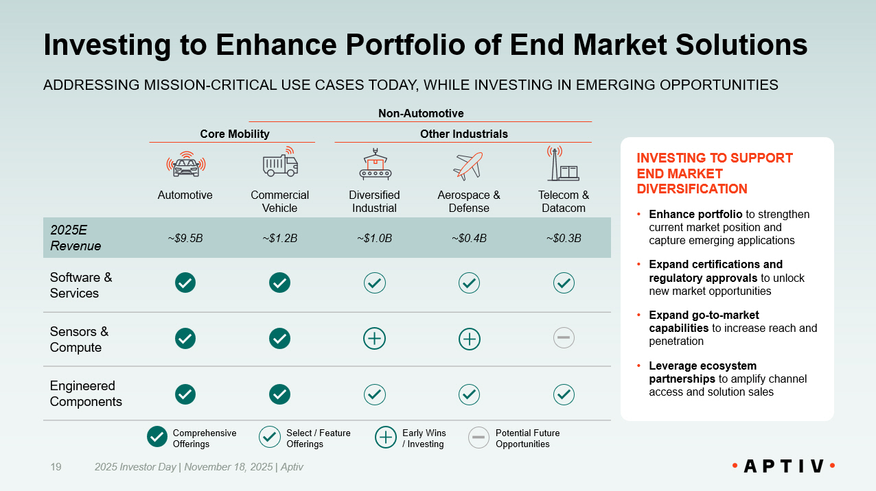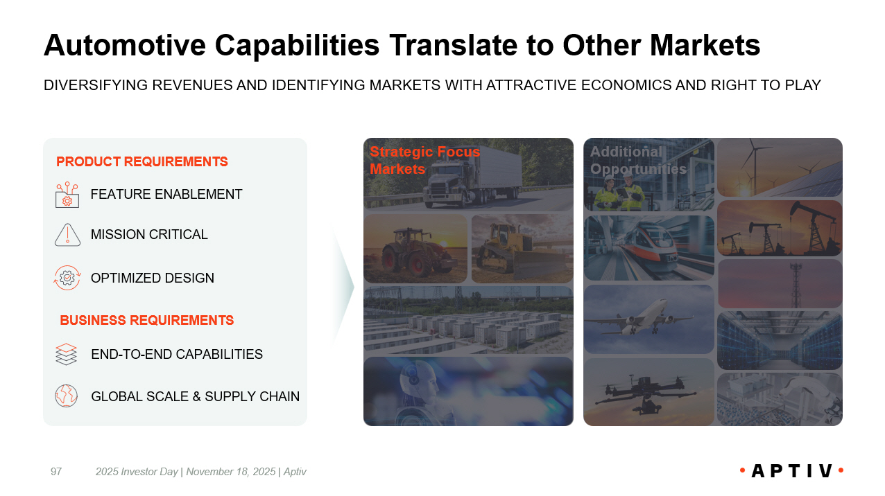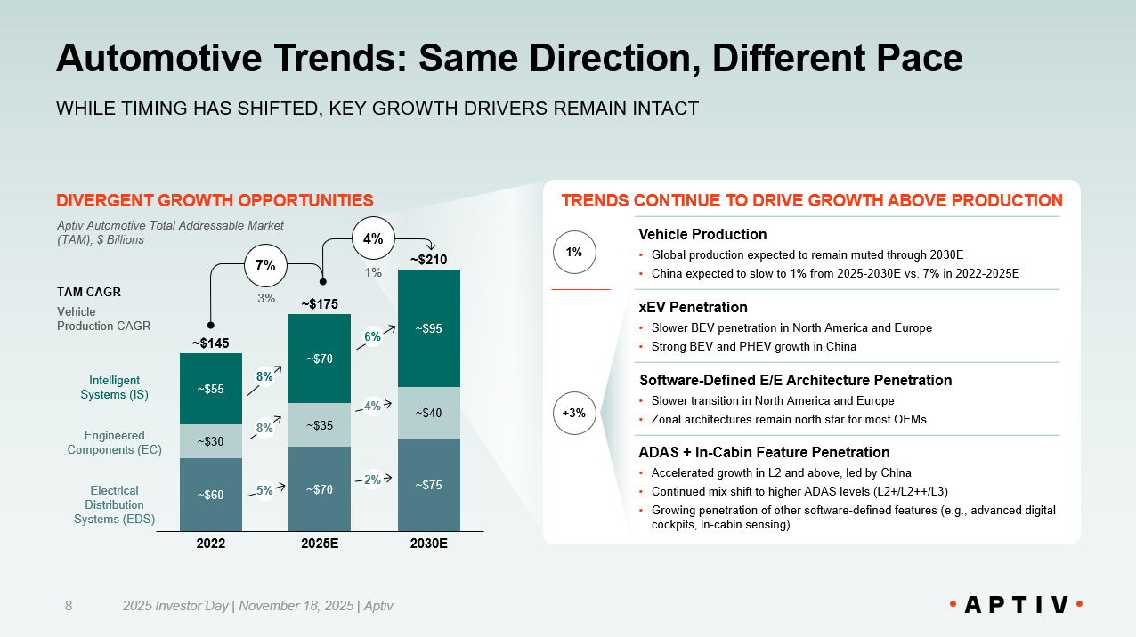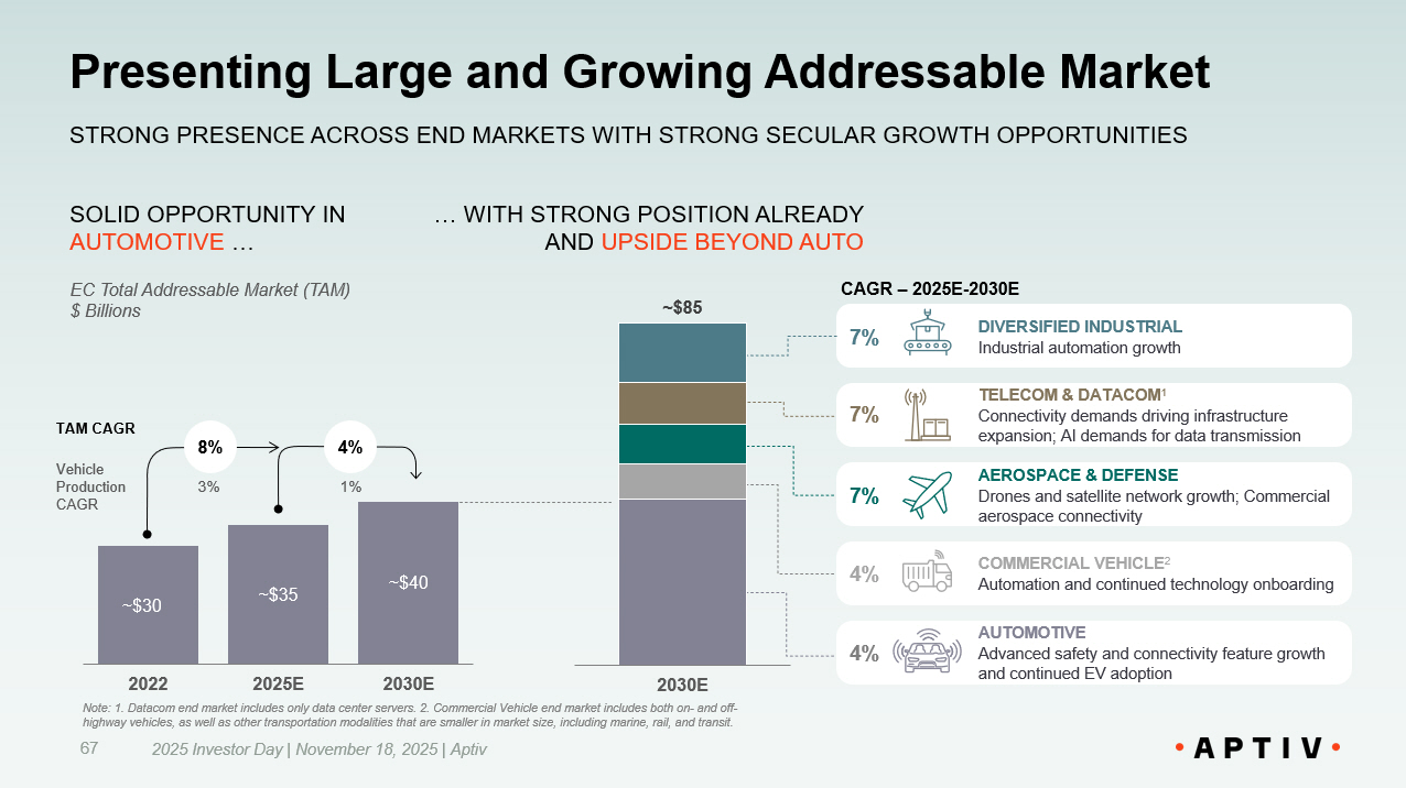 Presenting Large and Growing Market Opportunity 2025 Investor Day | November 18, 2025 | Aptiv 24 BROADER END MARKET OPPORTUNITIES PROVIDE A TAILWIND FOR GROWTH AND MARGIN EXPANSION New Aptiv Total Addressable Market (TAM) $ Billions AEROSPACE & DEFENSE Aircraft upgrades, drone deployments, commercial space ventures AUTOMOTIVE Increasingly software - defined vehicles 2030 E ~$240 TELECOM & DATACOM 1 Continued buildout of 5G infrastructure and AI data centers DIVERSIFIED INDUSTRIAL Increased automation leveraging advanced robotics COMMERCIAL VEHICLE 2 Enhanced autonomy and in - cabin features in commercial and off - highway vehicles NEW APTIV HAS CONTINUED OPPORTUNITY IN AUTOMOTIVE … 5% 10% 9% 14% CAGR – 2025E - 2030E 5% ~$85 2022 ~$105 2025 E ~$135 2030 E 5% 8% 3% 1% TAM CAGR Vehicle Production CAGR Note: 1. Datacom end market includes only data center servers. 2. Commercial Vehicle end market includes both on - and off - highway vehicles, as well as other transportation modalities that are smaller in market size, including marine, rail, and tra nsi t. … WITH UPSIDE IN OTHER INDUSTRIES