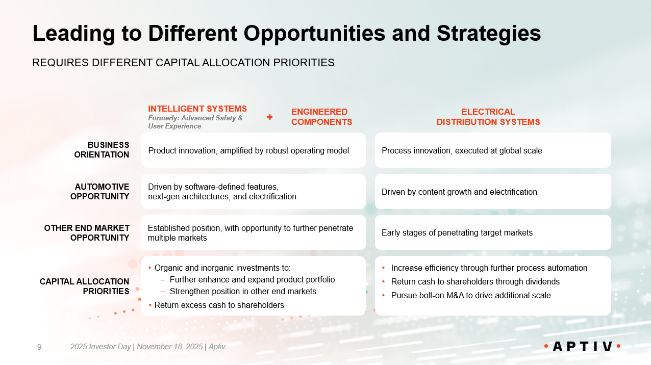 Leading to Different Opportunities and Strategies 9 REQUIRES DIFFERENT CAPITAL ALLOCATION PRIORITIES ELECTRICAL DISTRIBUTION SYSTEMS INTELLIGENT SYSTEMS Formerly: Advanced Safety & User Experience ENGINEERED COMPONENTS Process innovation, executed at global scale Product innovation, amplified by robust operating model BUSINESS ORIENTATION Driven by content growth and electrification Driven by software - defined features, next - gen architectures, and electrification AUTOMOTIVE OPPORTUNITY Early stages of penetrating target markets Established position, with opportunity to further penetrate multiple markets OTHER END MARKET OPPORTUNITY • Increase efficiency through further process automation • Return cash to shareholders through dividends • Pursue bolt - on M&A to drive additional scale • Organic and inorganic investments to: – Further enhance and expand product portfolio – Strengthen position in other end markets • Return excess cash to shareholders CAPITAL ALLOCATION PRIORITIES + 2025 Investor Day | November 18, 2025 | Aptiv