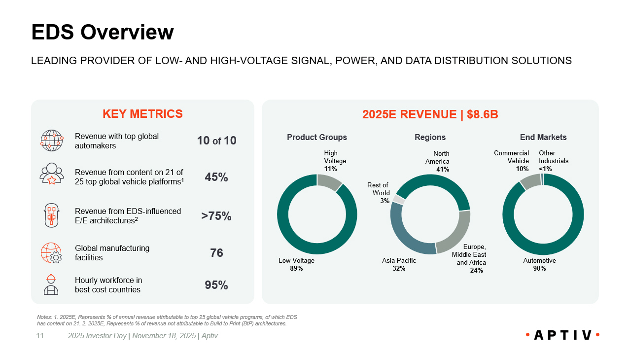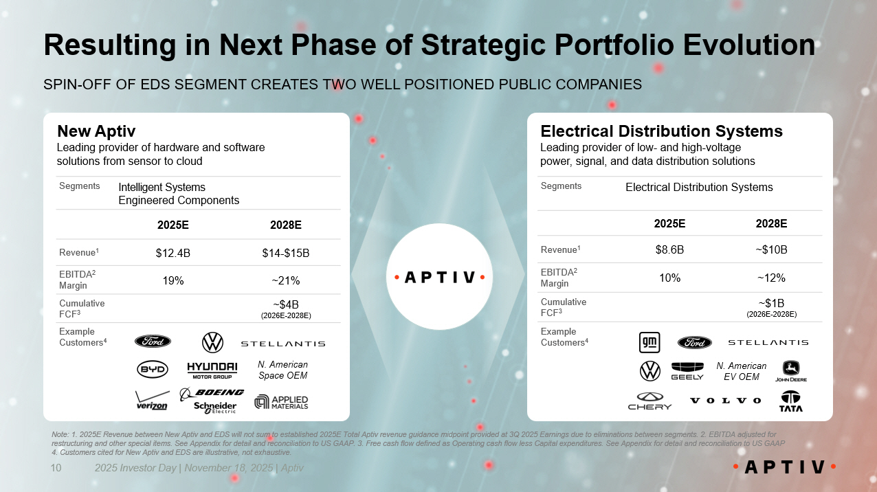 Resulting in Next Phase of Strategic Portfolio Evolution 2025 Investor Day | November 18, 2025 | Aptiv 10 z SPIN - OFF OF EDS SEGMENT CREATES TWO WELL POSITIONED PUBLIC COMPANIES Intelligent Systems Engineered Components Segments 2028E 2025E $14 - $15B $12.4B Revenue 1 ~21% 19% EBITDA 2 Margin ~$4B (2026E - 2028E) Cumulative FCF 3 Example Customers 4 New Aptiv Leading provider of hardware and software solutions from sensor to cloud Electrical Distribution Systems Segments 2028E 2025E ~$10B $8.6B Revenue 1 ~12% 10% EBITDA 2 Margin ~$1B (2026E - 2028E) Cumulative FCF 3 Example Customers 4 Electrical Distribution Systems Leading provider of low - and high - voltage power, signal, and data distribution solutions N. American Space OEM N. American EV OEM Note: 1. 2025E Revenue between New Aptiv and EDS will not sum to established 2025E Total Aptiv revenue guidance midpoint prov ide d at 3Q 2025 Earnings due to eliminations between segments. 2. EBITDA adjusted for restructuring and other special items. See Appendix for detail and reconciliation to US GAAP. 3. Free cash flow defined as Op era ting cash flow less Capital expenditures. See Appendix for detail and reconciliation to US GAAP 4. Customers cited for New Aptiv and EDS are illustrative, not exhaustive.