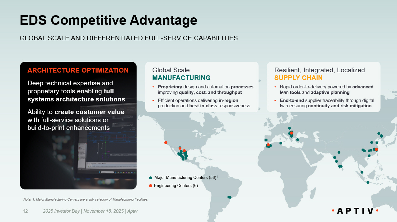 EDS Competitive Advantage 2025 Investor Day | November 18, 2025 | Aptiv 12 GLOBAL SCALE AND DIFFERENTIATED FULL - SERVICE CAPABILITIES Major Manufacturing Centers (58) 1 Engineering Centers (6) ARCHITECTURE OPTIMIZATION Deep technical expertise and proprietary tools enabling full systems architecture solutions Ability to create customer value with full - service solutions or build - to - print enhancements Global Scale MANUFACTURING • Proprietary design and automation processes improving quality, cost, and throughput • Efficient operations delivering in - region production and best - in - class responsiveness Resilient, Integrated, Localized SUPPLY CHAIN • Rapid order - to - delivery powered by advanced lean tools and adaptive planning • End - to - end supplier traceability through digital twin ensuring continuity and risk mitigation Note: 1. Major Manufacturing Centers are a sub - category of Manufacturing Facilities.