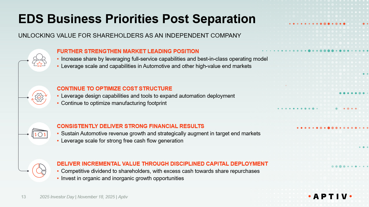 2025 Investor Day | November 18, 2025 | Aptiv 13 FURTHER STRENGTHEN MARKET LEADING POSITION • Increase share by leveraging full - service capabilities and best - in - class operating model • Leverage scale and capabilities in Automotive and other high - value end markets CONSISTENTLY DELIVER STRONG FINANCIAL RESULTS • Sustain Automotive revenue growth and strategically augment in target end markets • Leverage scale for strong free cash flow generation CONTINUE TO OPTIMIZE COST STRUCTURE • Leverage design capabilities and tools to expand automation deployment • Continue to optimize manufacturing footprint DELIVER INCREMENTAL VALUE THROUGH DISCIPLINED CAPITAL DEPLOYMENT • Competitive dividend to shareholders, with excess cash towards share repurchases • Invest in organic and inorganic growth opportunities EDS Business Priorities Post Separation UNLOCKING VALUE FOR SHAREHOLDERS AS AN INDEPENDENT COMPANY