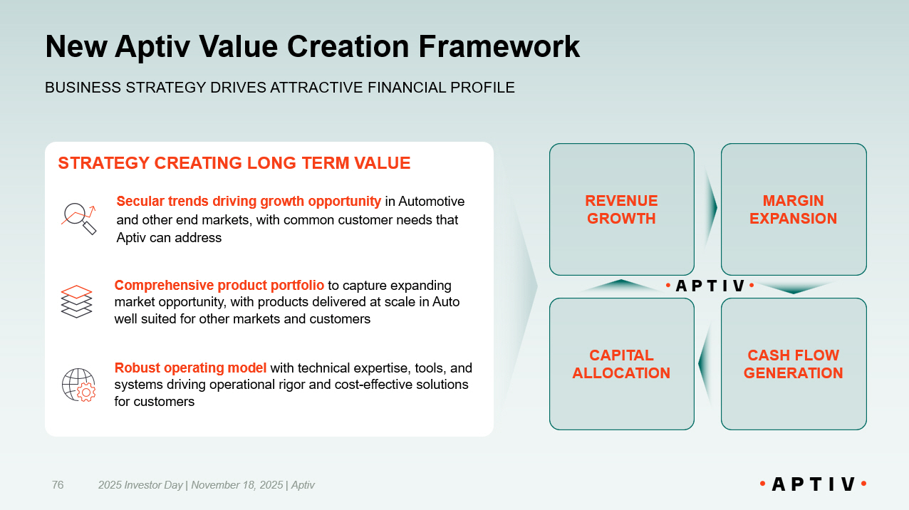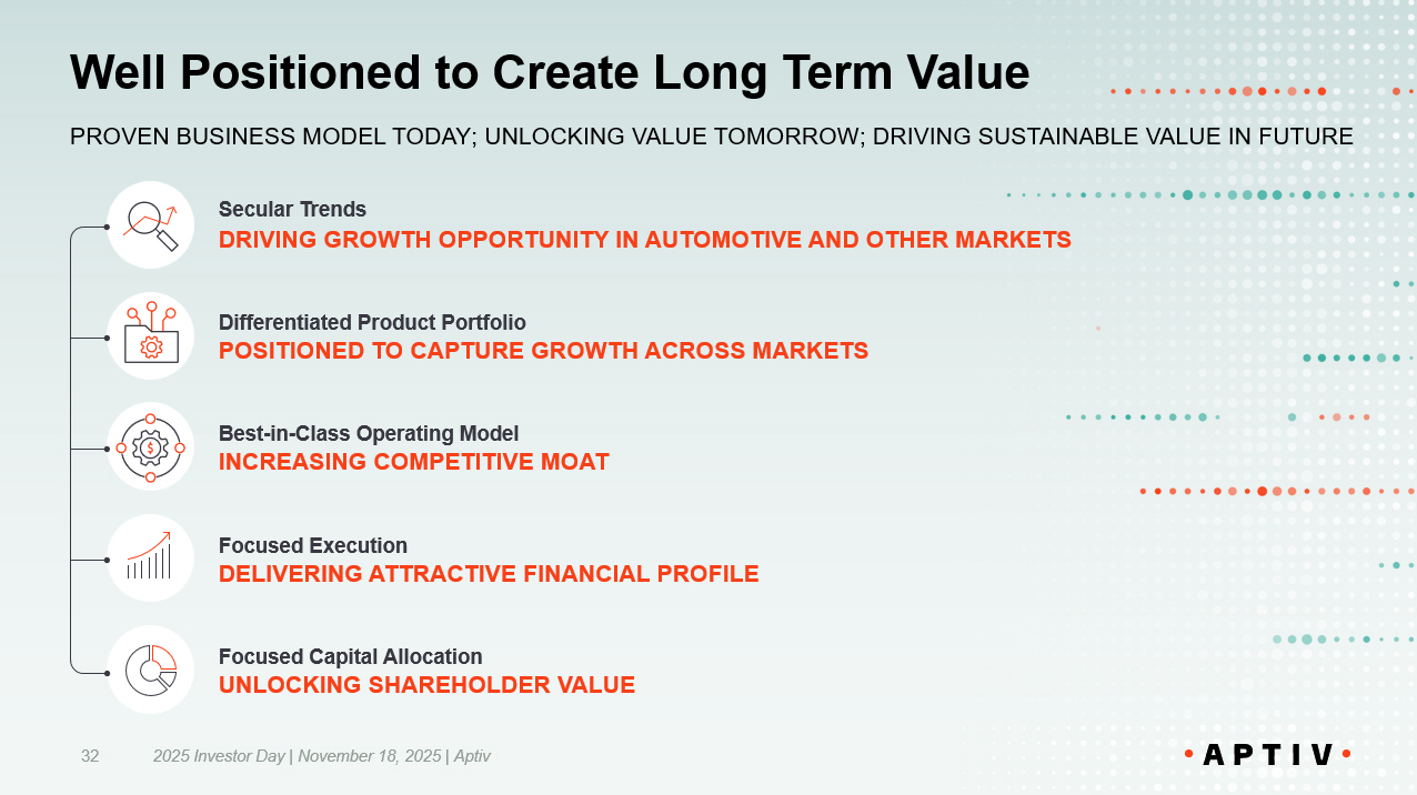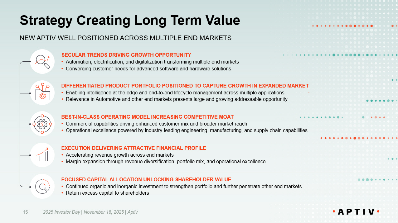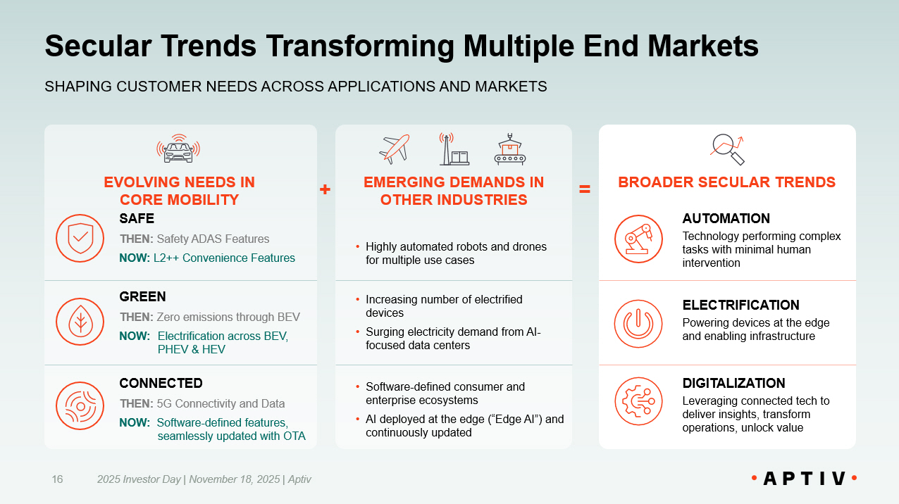 Strategy Creating Long Term Value 2025 Investor Day | November 18, 2025 | Aptiv 15 SECULAR TRENDS DRIVING GROWTH OPPORTUNITY • Automation, electrification, and digitalization transforming multiple end markets • Converging customer needs for advanced software and hardware solutions DIFFERENTIATED PRODUCT PORTFOLIO POSITIONED TO CAPTURE GROWTH IN EXPANDED MARKET • Enabling intelligence at the edge and end - to - end lifecycle management across multiple applications • Relevance in Automotive and other end markets presents large and growing addressable opportunity BEST - IN - CLASS OPERATING MODEL INCREASING COMPETITIVE MOAT • Commercial capabilities driving enhanced customer mix and broader market reach • Operational excellence powered by industry - leading engineering, manufacturing, and supply chain capabilities FOCUSED CAPITAL ALLOCATION UNLOCKING SHAREHOLDER VALUE • Continued organic and inorganic investment to strengthen portfolio and further penetrate other end markets • Return excess capital to shareholders EXECUTION DELIVERING ATTRACTIVE FINANCIAL PROFILE • Accelerating revenue growth across end markets • Margin expansion through revenue diversification, portfolio mix, and operational excellence NEW APTIV WELL POSITIONED ACROSS MULTIPLE END MARKETS