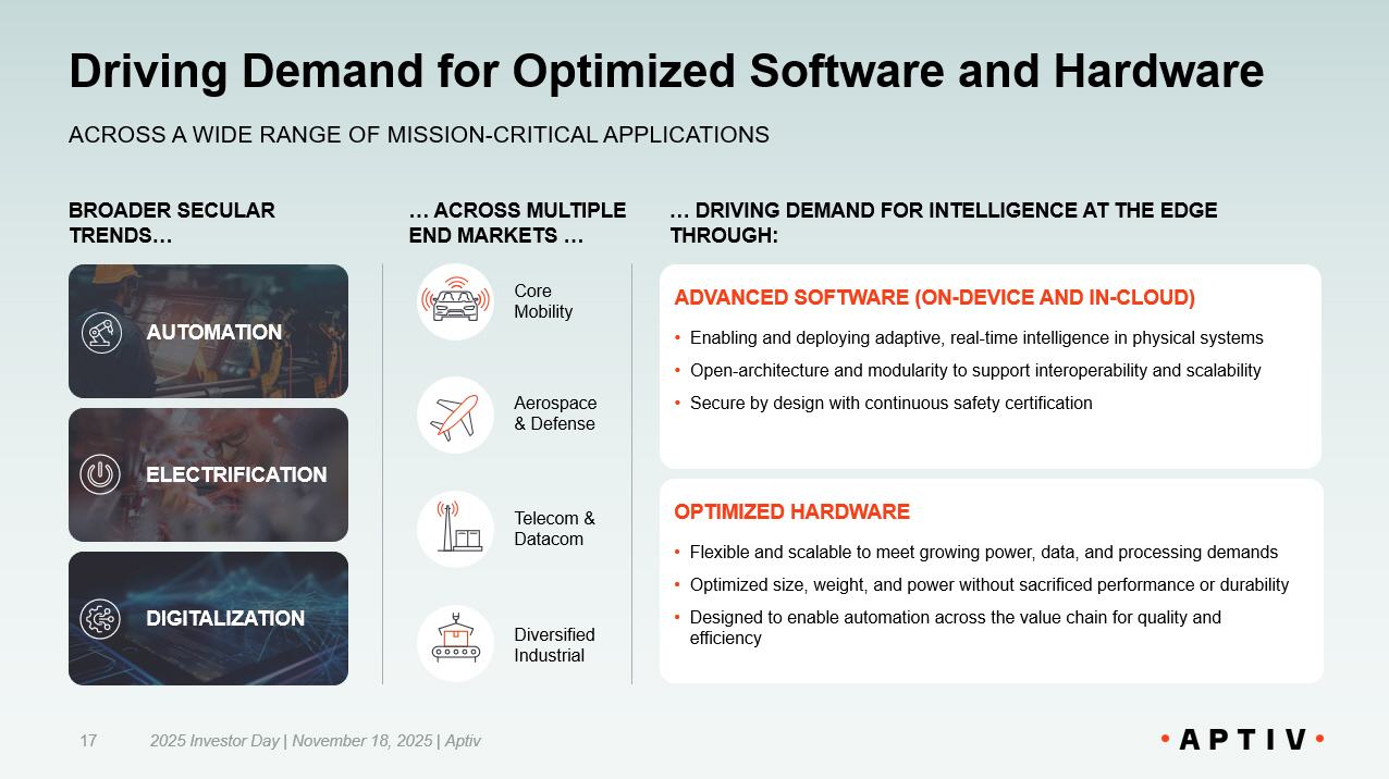 Secular Trends Transforming Multiple End Markets 16 + = SAFE THEN: Safety ADAS Features NOW: L2++ Convenience Features • Highly automated robots and drones for multiple use cases AUTOMATION Technology performing complex tasks with minimal human intervention GREEN THEN: Zero emissions through BEV NOW: Electrification across BEV, PHEV & HEV • Increasing number of electrified devices • Surging electricity demand from AI - focused data centers ELECTRIFICATION Powering devices at the edge and enabling infrastructure CONNECTED THEN: 5G Connectivity and Data NOW: Software - defined features, seamlessly updated with OTA • Software - defined consumer and enterprise ecosystems • AI deployed at the edge (“Edge AI”) and continuously updated DIGITALIZATION Leveraging connected tech to deliver insights, transform operations, unlock value SHAPING CUSTOMER NEEDS ACROSS APPLICATIONS AND MARKETS EMERGING DEMANDS IN OTHER INDUSTRIES BROADER SECULAR TRENDS EVOLVING NEEDS IN CORE MOBILITY 2025 Investor Day | November 18, 2025 | Aptiv