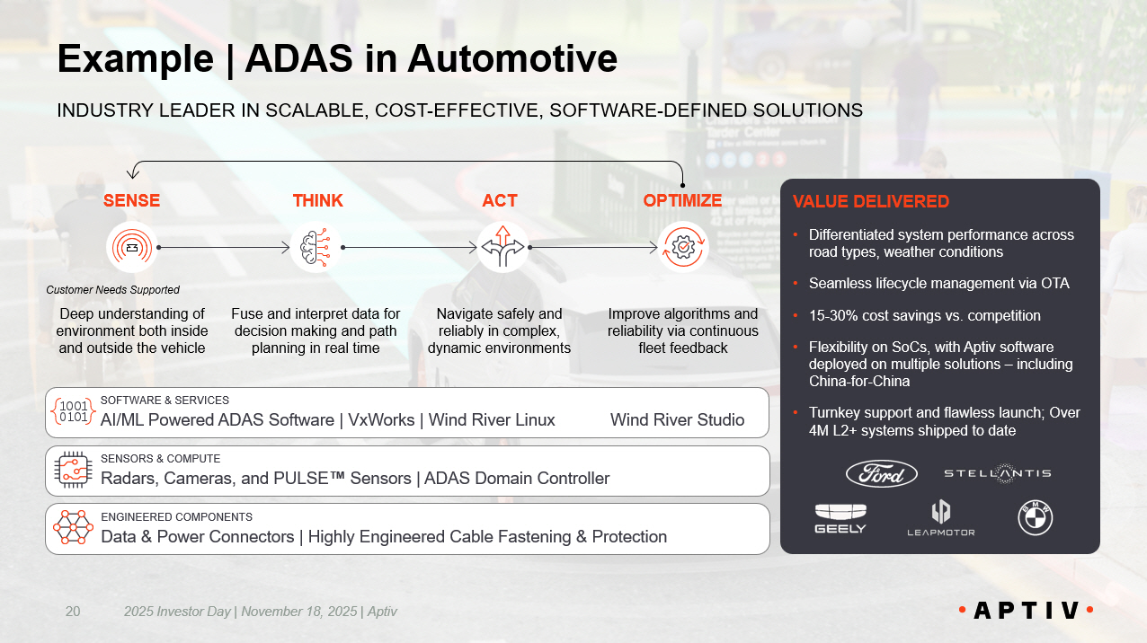 Example | ADAS in Automotive 2025 Investor Day | November 18, 2025 | Aptiv 20 INDUSTRY LEADER IN SCALABLE, COST - EFFECTIVE, SOFTWARE - DEFINED SO LUTIONS VALUE DELIVERED • Differentiated system performance across road types, weather conditions • Seamless lifecycle management via OTA • 15 - 30% cost savings vs. competition • Flexibility on SoCs, with Aptiv software deployed on multiple solutions – including China - for - China • Turnkey support and flawless launch; Over 4M L2+ systems shipped to date SENSE THINK ACT OPTIMIZE Deep understanding of environment both inside and outside the vehicle Fuse and interpret data for decision making and path planning in real time Navigate safely and reliably in complex, dynamic environments Improve algorithms and reliability via continuous fleet feedback Customer Needs Supported SOFTWARE & SERVICES AI/ML Powered ADAS Software | VxWorks | Wind River Linux ENGINEERED COMPONENTS Data & Power Connectors | Highly Engineered Cable Fastening & Protection Wind River Studio SENSORS & COMPUTE Radars, Cameras, and PULSE Sensors | ADAS Domain Controller