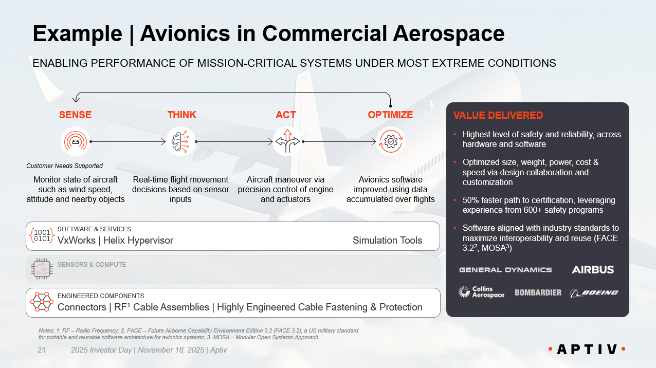 Example | Avionics in Commercial Aerospace 2025 Investor Day | November 18, 2025 | Aptiv 21 ENABLING PERFORMANCE OF MISSION - CRITICAL SYSTEMS UNDER MOST EXTR EME CONDITIONS VALUE DELIVERED • Highest level of safety and reliability, across hardware and software • Optimized size, weight, power, cost & speed via design collaboration and customization • 50% faster path to certification, leveraging experience from 600+ safety programs • Software aligned with industry standards to maximize interoperability and reuse (FACE 3.2 2 , MOSA 3 ) SENSE THINK ACT OPTIMIZE Monitor state of aircraft such as wind speed, attitude and nearby objects Real - time flight movement decisions based on sensor inputs Aircraft maneuver via precision control of engine and actuators Avionics software improved using data accumulated over flights Customer Needs Supported SOFTWARE & SERVICES VxWorks | Helix Hypervisor ENGINEERED COMPONENTS Connectors | RF 1 Cable Assemblies | Highly Engineered Cable Fastening & Protection Simulation Tools SENSORS & COMPUTE Notes: 1. RF – Radio Frequency; 2. FACE – Future Airborne Capability Environment Edition 3.2 (FACE 3.2), a US military standard for portable and reusable software architecture for avionics systems; 3. MOSA – Modular Open Systems Approach.
