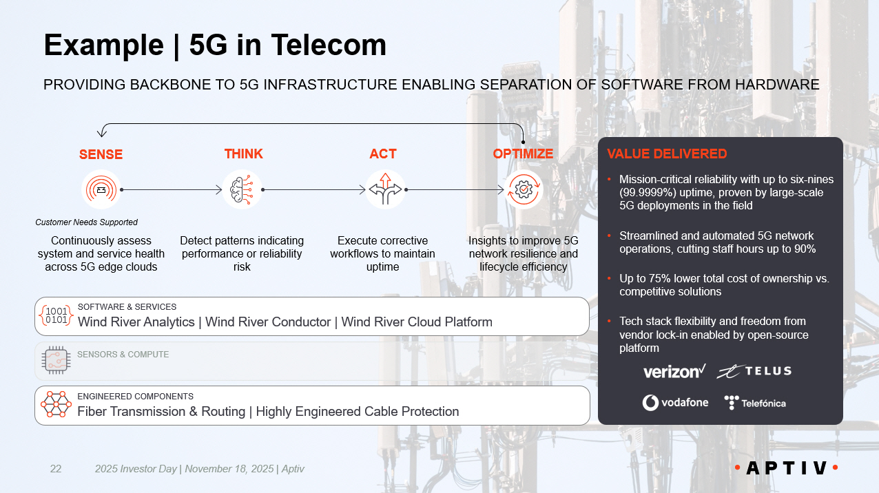 Example | 5G in Telecom 2025 Investor Day | November 18, 2025 | Aptiv 22 PROVIDING BACKBONE TO 5G INFRASTRUCTURE ENABLING SEPARATION OF S OFTWARE FROM HARDWARE VALUE DELIVERED • Mission - critical reliability with up to six - nines (99.9999%) uptime, proven by large - scale 5G deployments in the field • Streamlined and automated 5G network operations, cutting staff hours up to 90% • Up to 75% lower total cost of ownership vs. competitive solutions • Tech stack flexibility and freedom from vendor lock - in enabled by open - source platform Continuously assess system and service health across 5G edge clouds Detect patterns indicating performance or reliability risk Execute corrective workflows to maintain uptime Insights to improve 5G network resilience and lifecycle efficiency SENSE THINK ACT OPTIMIZE Customer Needs Supported SOFTWARE & SERVICES Wind River Analytics | Wind River Conductor | Wind River Cloud Platform ENGINEERED COMPONENTS Fiber Transmission & Routing | Highly Engineered Cable Protection SENSORS & COMPUTE
