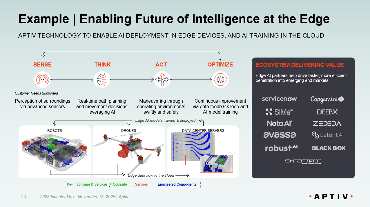 DATA CENTER SERVERS Example | Enabling Future of Intelligence at the Edge 2025 Investor Day | November 18, 2025 | Aptiv 23 APTIV TECHNOLOGY TO ENABLE AI DEPLOYMENT IN EDGE DEVICES, AND AI TRAINING IN THE CLOUD SENSE THINK ACT OPTIMIZE Perception of surroundings via advanced sensors Real - time path planning and movement decisions leveraging AI Maneuvering through operating environments swiftly and safely Continuous improvement via data feedback loop and AI model training Customer Needs Supported DRONES ROBOTS ECOSYSTEM DELIVERING VALUE Edge AI partners help drive faster, more efficient penetration into emerging end markets Edge AI models trained & deployed Edge data flow to the cloud Software & Services Compute Sensors Engineered Components Key