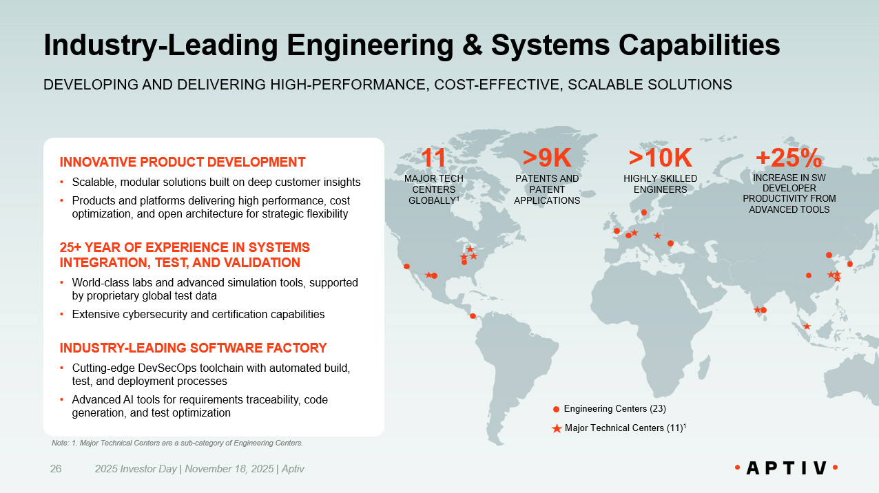 INNOVATIVE PRODUCT DEVELOPMENT • Scalable, modular solutions built on deep customer insights • Products and platforms delivering high performance, cost optimization, and open architecture for strategic flexibility 25+ YEAR OF EXPERIENCE IN SYSTEMS INTEGRATION, TEST, AND VALIDATION • World - class labs and advanced simulation tools, supported by proprietary global test data • Extensive cybersecurity and certification capabilities INDUSTRY - LEADING SOFTWARE FACTORY • Cutting - edge DevSecOps toolchain with automated build, test, and deployment processes • Advanced AI tools for requirements traceability, code generation, and test optimization Industry - Leading Engineering & Systems Capabilities 2025 Investor Day | November 18, 2025 | Aptiv 26 DEVELOPING AND DELIVERING HIGH - PERFORMANCE, COST - EFFECTIVE, SCALABLE SOLUTIONS Engineering Centers (23) Major Technical Centers (11) 1 >10K HIGHLY SKILLED ENGINEERS +25% INCREASE IN SW DEVELOPER PRODUCTIVITY FROM ADVANCED TOOLS >9K PATENTS AND PATENT APPLICATIONS 11 MAJOR TECH CENTERS GLOBALLY 1 Note: 1. Major Technical Centers are a sub - category of Engineering Centers.