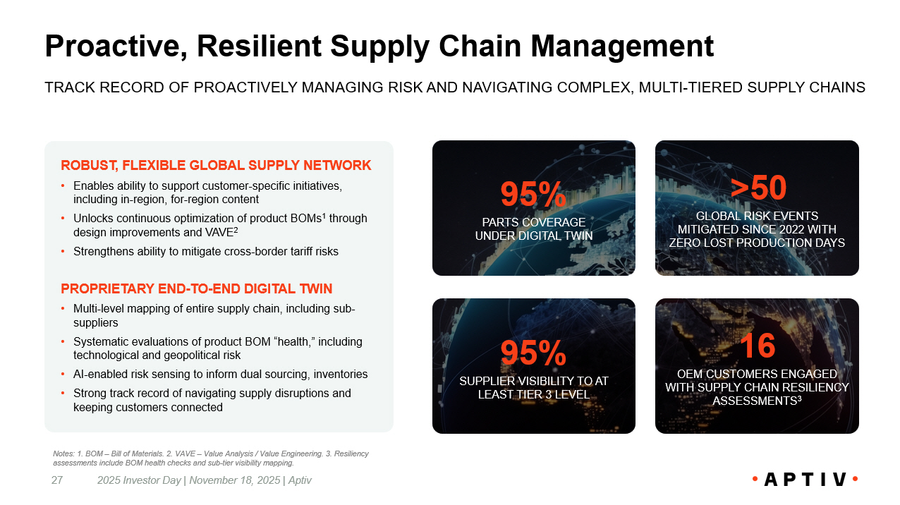 Proactive, Resilient Supply Chain Management 2025 Investor Day | November 18, 2025 | Aptiv 27 TRACK RECORD OF PROACTIVELY MANAGING RISK AND NAVIGATING COMPLEX, MULTI - TIERED SUPPLY CHAINS >50 GLOBAL RISK EVENTS MITIGATED SINCE 2022 WITH ZERO LOST PRODUCTION DAYS 95% SUPPLIER VISIBILITY TO AT LEAST TIER 3 LEVEL 16 OEM CUSTOMERS ENGAGED WITH SUPPLY CHAIN RESILIENCY ASSESSMENTS 3 95% PARTS COVERAGE UNDER DIGITAL TWIN ROBUST, FLEXIBLE GLOBAL SUPPLY NETWORK • Enables ability to support customer - specific initiatives, including in - region, for - region content • Unlocks continuous optimization of product BOMs 1 through design improvements and VAVE 2 • Strengthens ability to mitigate cross - border tariff risks PROPRIETARY END - TO - END DIGITAL TWIN • Multi - level mapping of entire supply chain, including sub - suppliers • Systematic evaluations of product BOM “health,” including technological and geopolitical risk • AI - enabled risk sensing to inform dual sourcing, inventories • Strong track record of navigating supply disruptions and keeping customers connected Notes: 1. BOM – Bill of Materials. 2. VAVE – Value Analysis / Value Engineering. 3. Resiliency assessments include BOM health checks and sub - tier visibility mapping.