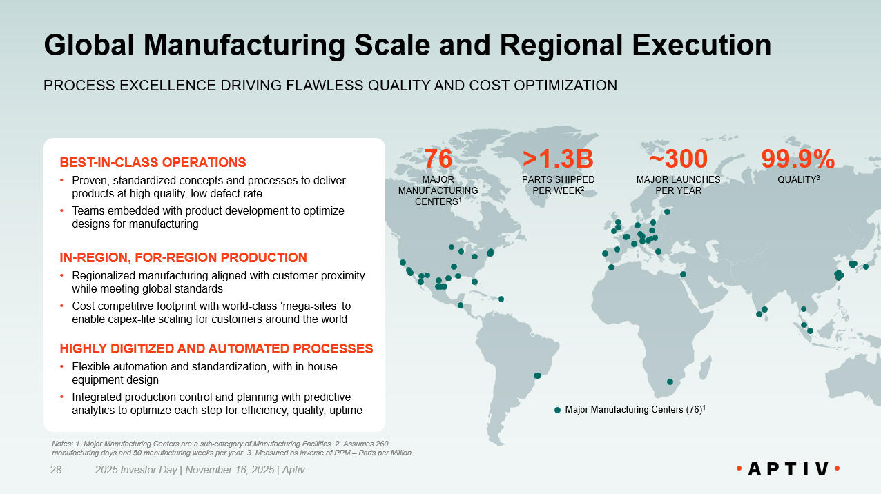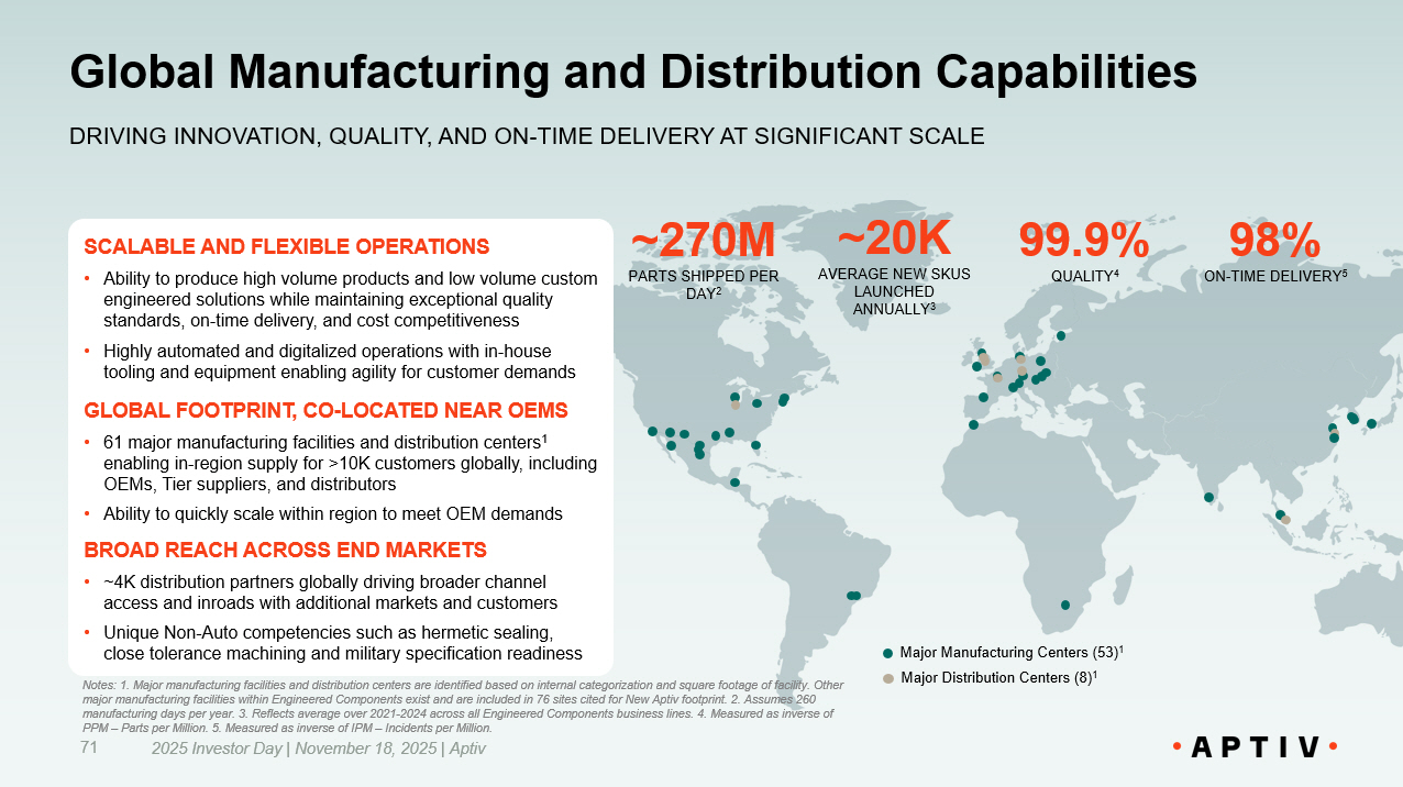 Global Manufacturing and Distribution Capabilities DRIVING INNOVATION, QUALITY, AND ON - TIME DELIVERY AT SIGNIFICANT SCALE Major Distribution Centers (8) 1 99.9% QUALITY 4 ~20K AVERAGE NEW SKUS LAUNCHED ANNUALLY 3 98% ON - TIME DELIVERY 5 Notes: 1. Major manufacturing facilities and distribution centers are identified based on internal categorization and square foo tage of facility. Other major manufacturing facilities within Engineered Components exist and are included in 76 sites cited for New Aptiv footprint. 2. Assumes 260 manufacturing days per year. 3. Reflects average over 2021 - 2024 across all Engineered Components business lines. 4. Measured as inverse of PPM – Parts per Million. 5. Measured as inverse of IPM – Incidents per Million. ~270M PARTS SHIPPED PER DAY 2 SCALABLE AND FLEXIBLE OPERATIONS • Ability to produce high volume products and low volume custom engineered solutions while maintaining exceptional quality standards, on - time delivery, and cost competitiveness • Highly automated and digitalized operations with in - house tooling and equipment enabling agility for customer demands GLOBAL FOOTPRINT, CO - LOCATED NEAR OEMS • 61 major manufacturing facilities and distribution centers 1 enabling in - region supply for >10K customers globally, including OEMs, Tier suppliers, and distributors • Ability to quickly scale within region to meet OEM demands BROAD REACH ACROSS END MARKETS • ~4K distribution partners globally driving broader channel access and inroads with additional markets and customers • Unique Non - Auto competencies such as hermetic s ealing , close tolerance machining and military specification readiness 71 2025 Investor Day | November 18, 2025 | Aptiv Major Manufacturing Centers (53) 1
